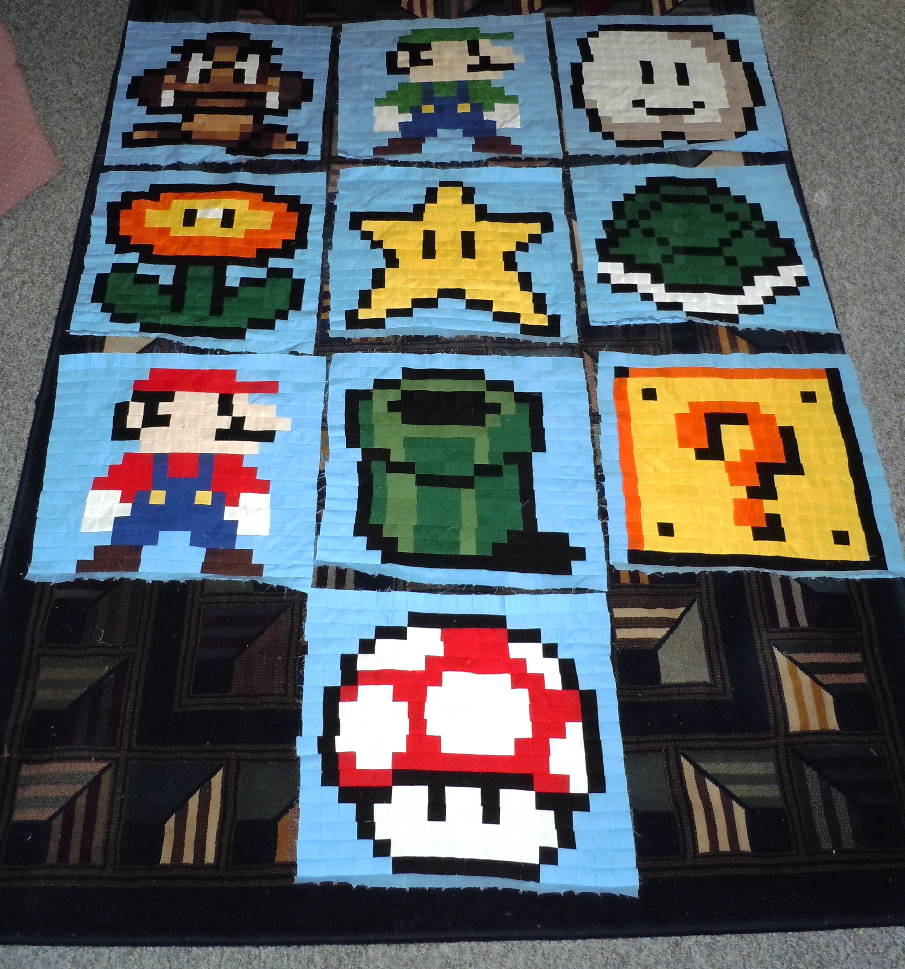 On the quilting front, I am continuing the Super Mario Quilt along. Here is my progress so far: