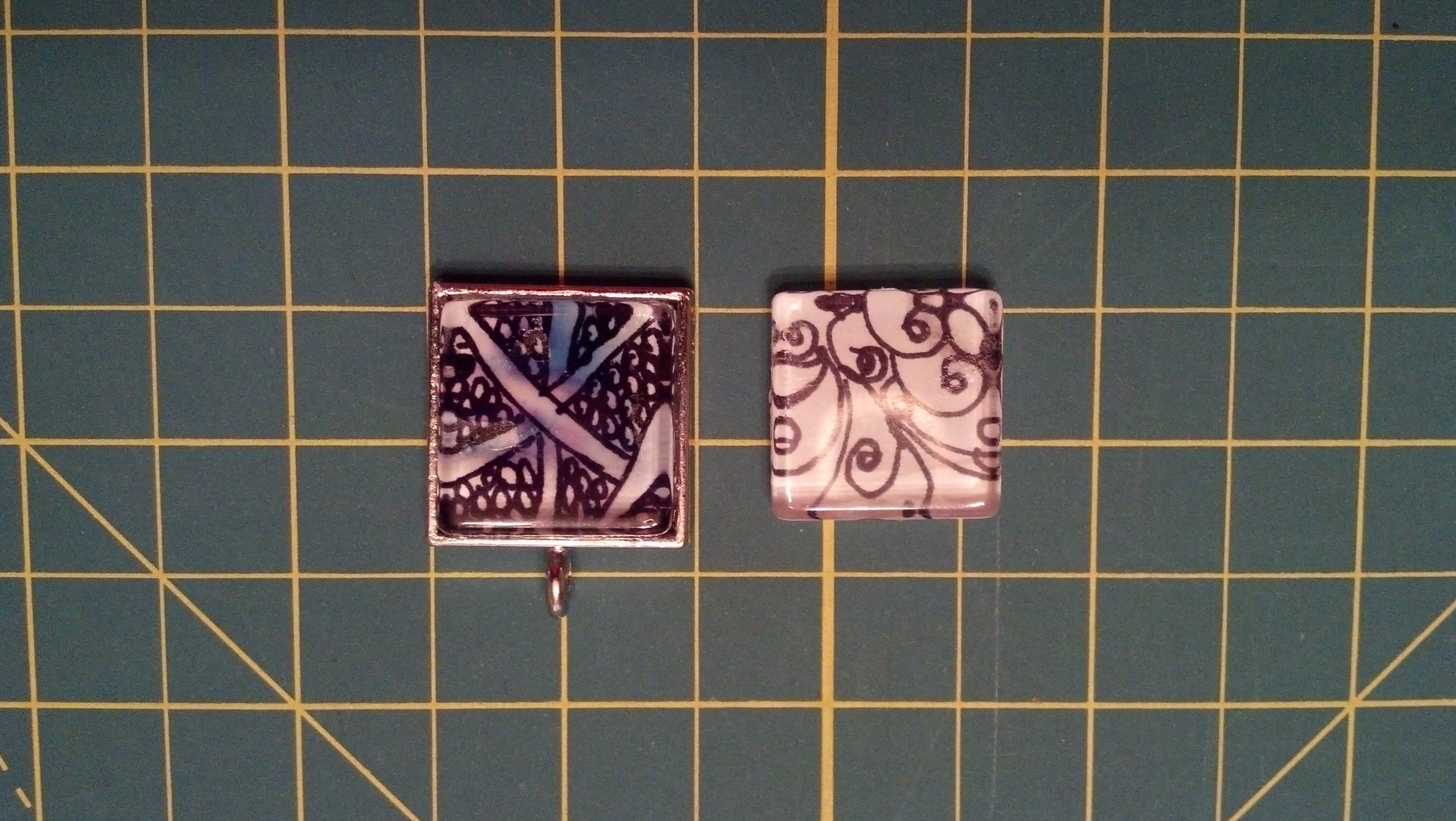 I am testing the Modge Podge Dimensional magic. Same paper, ink and adhesive. I think the problem is not the ink turning blue after drying but the metal in the tray on the tile on the left. I have done some research and that may be the problem. I have more research to do before a final product!!!