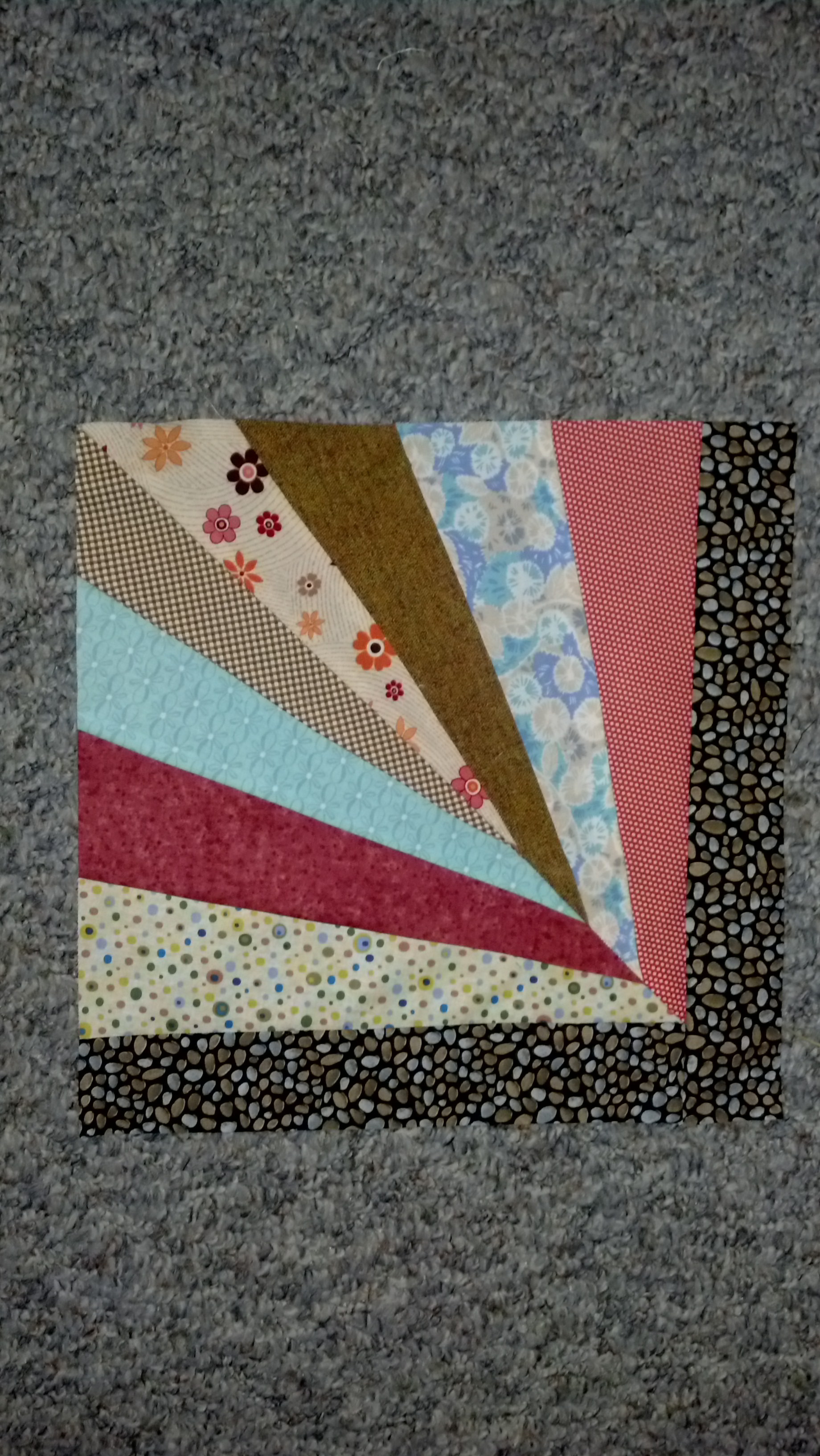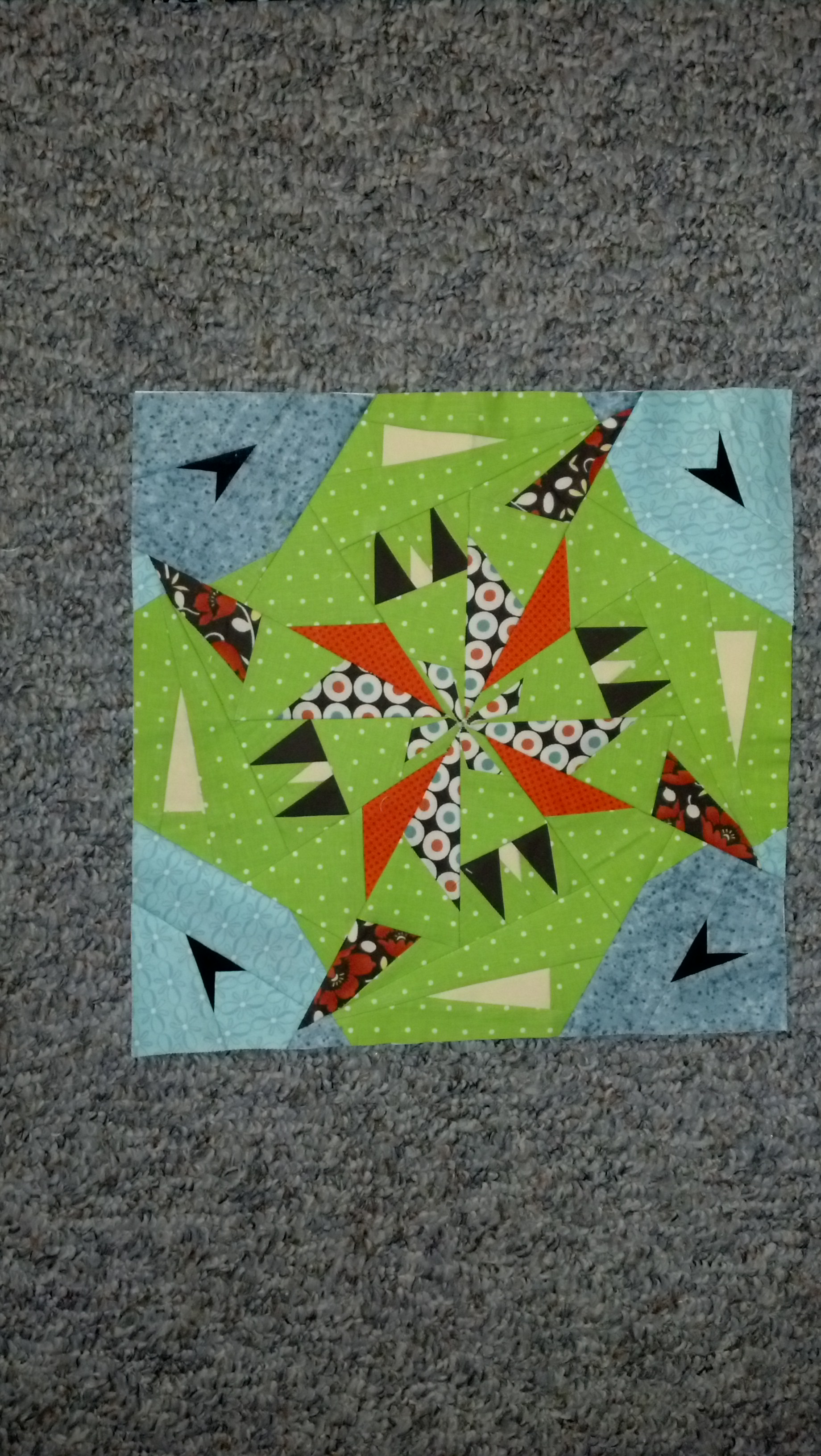 Block #732 This is right in my wheelhouse. It is paper pieced and straight forward. I love the colors, the sharp corners and the movement of the block. I learned this is what is “easy” for me and in my comfort zone.