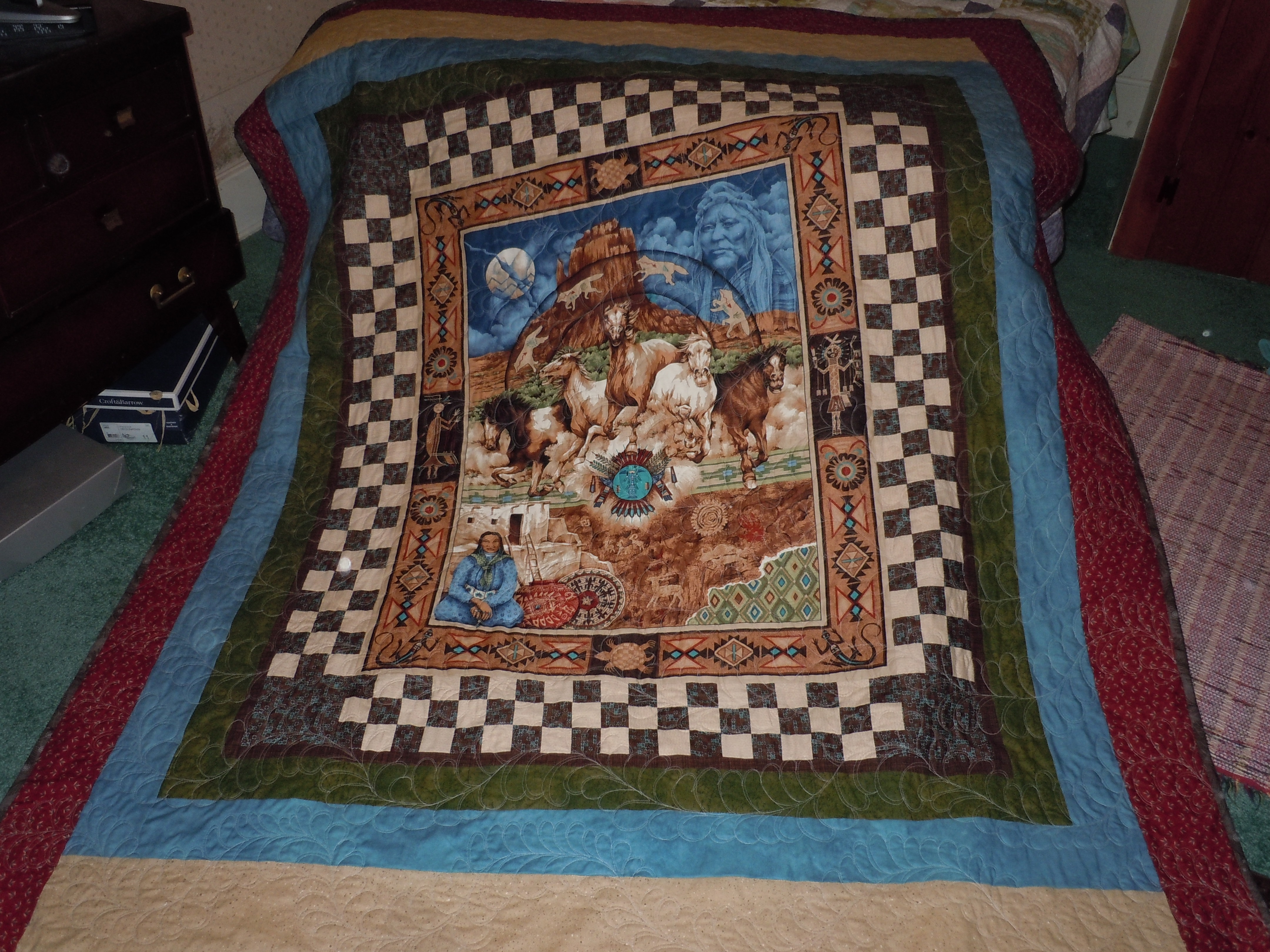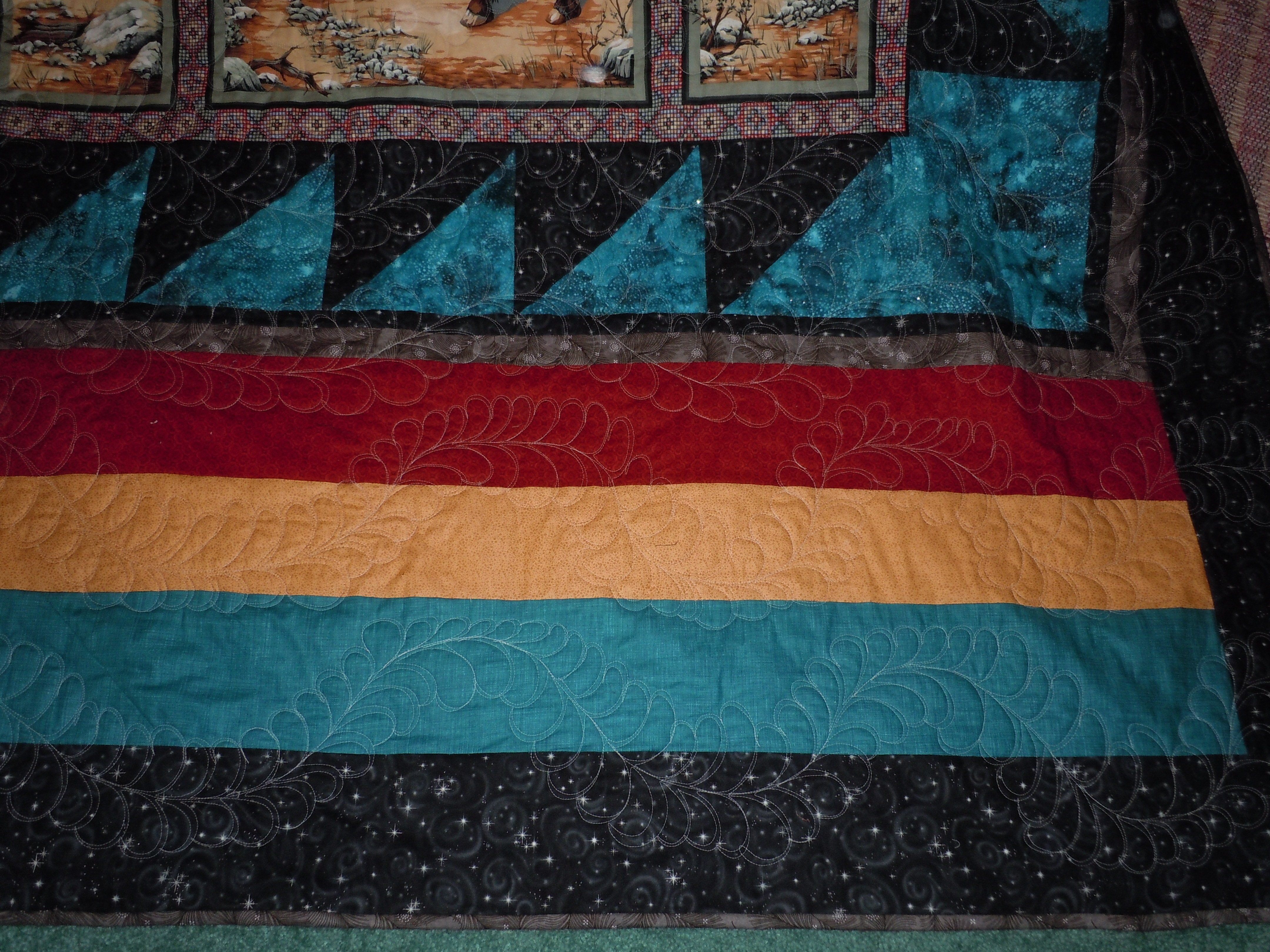 Here is the front, the turquoise has a bit of sparkle and it looks like the sky. It has free motion feathers on it. I like making the “hook” feathers and it fit the Native American panels.