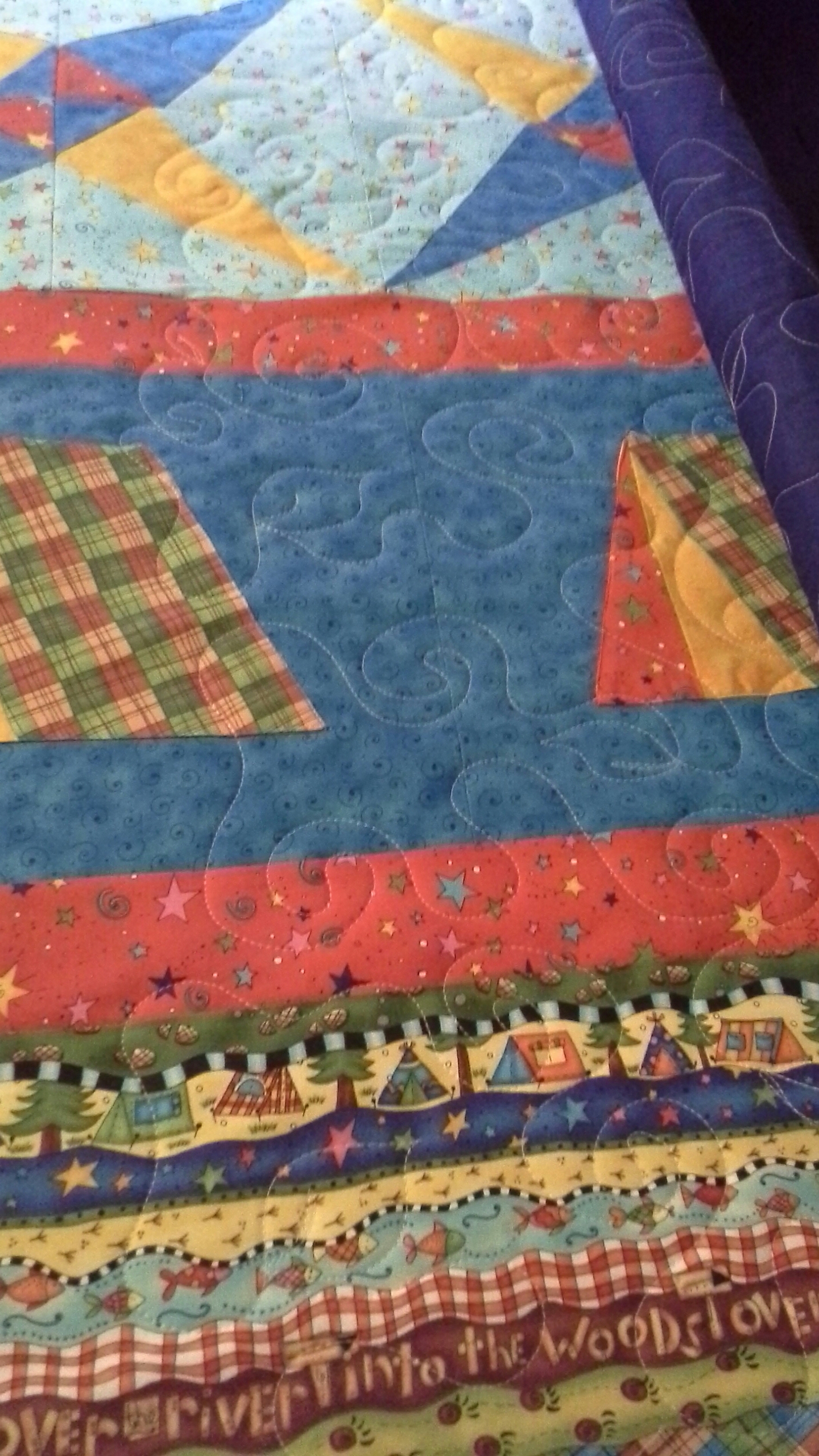 And I have the privilege to quilt it in a meander for her, with a few leaves adn swirls along the way. Love the crossed canoes!!! Tent’s too.