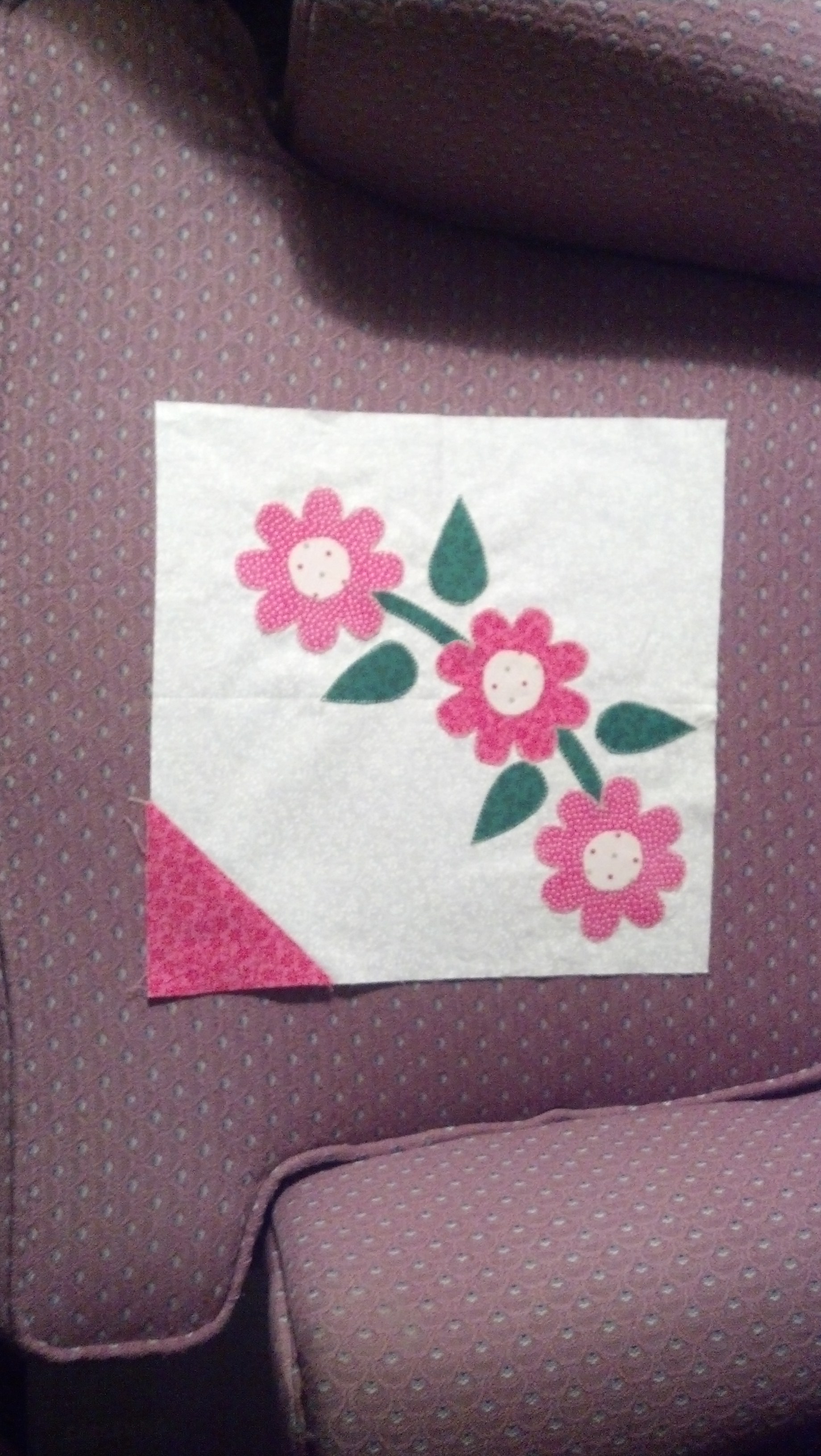 Block 811 Spring smile. This applique block looks great and was not difficult to assemble as some applique blocks can be. I fused the pieces on using paper backed webbing. I even stitched the edges down and it still looks fab! I would make this into a quilt, I live the negative space and the triangle suprise in the corner!