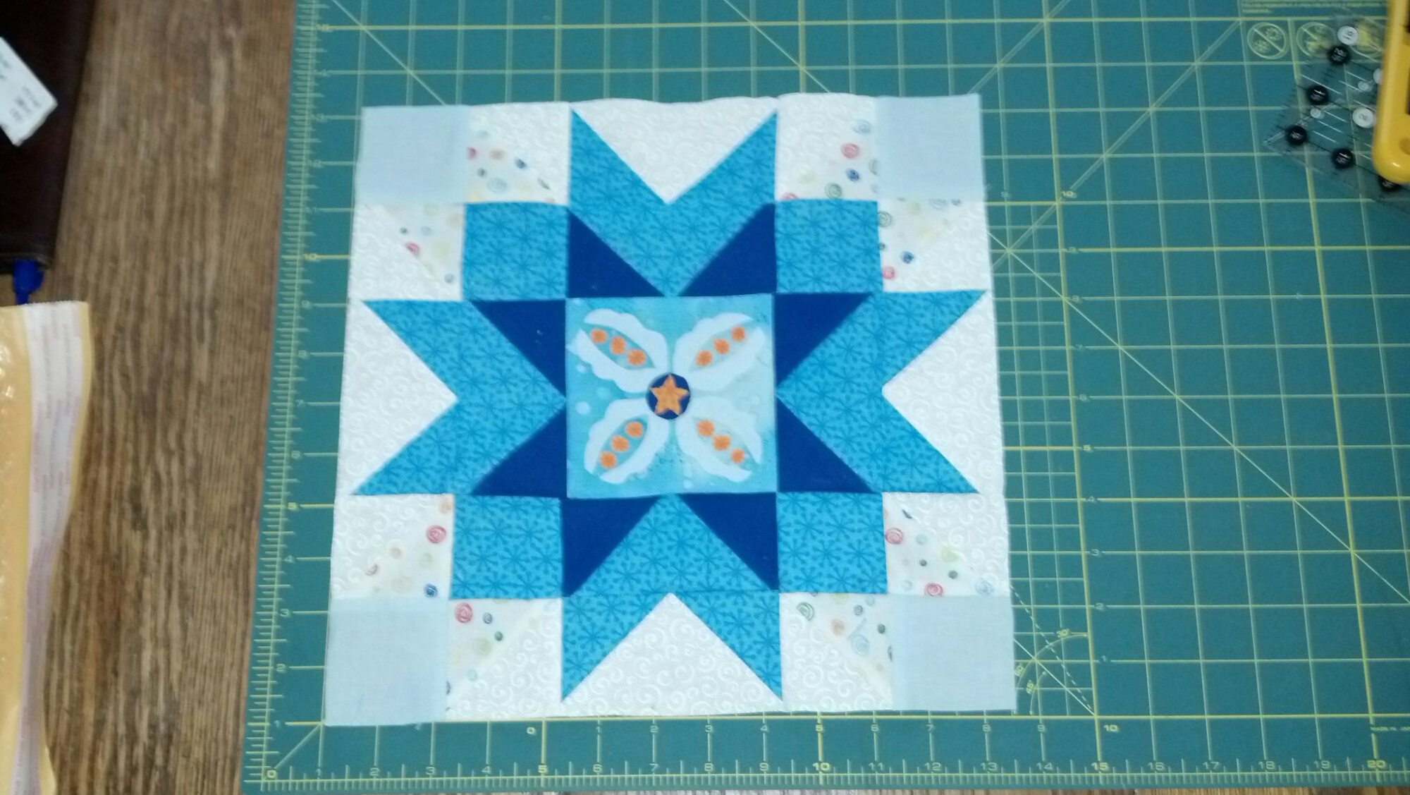 Block 848 Blue star Bloom. I AM NOT a skilled applique person. The middle is so tiny that it would need skills to really sew it down. Mine is laid out to test the pattern. The star part is lovely, and I would fussy cut a fabric for the look vs applique so tiny. Great block!