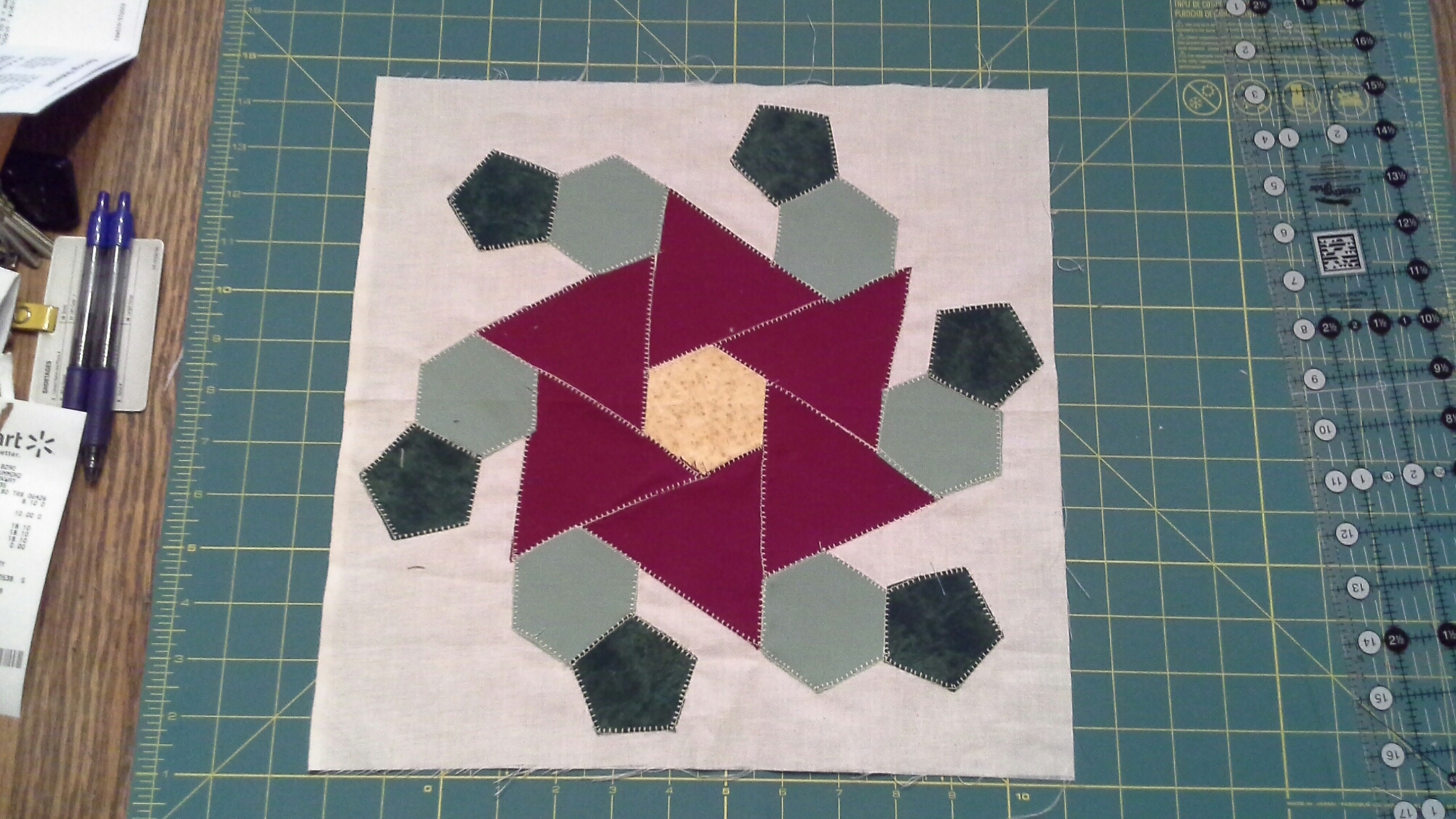 This Block is applique in my world. Fused and blanket stitched. English paper pieced is the pattern but my achy fingers said no. It’s still cute and different. Just make a block using whatever method fits you!