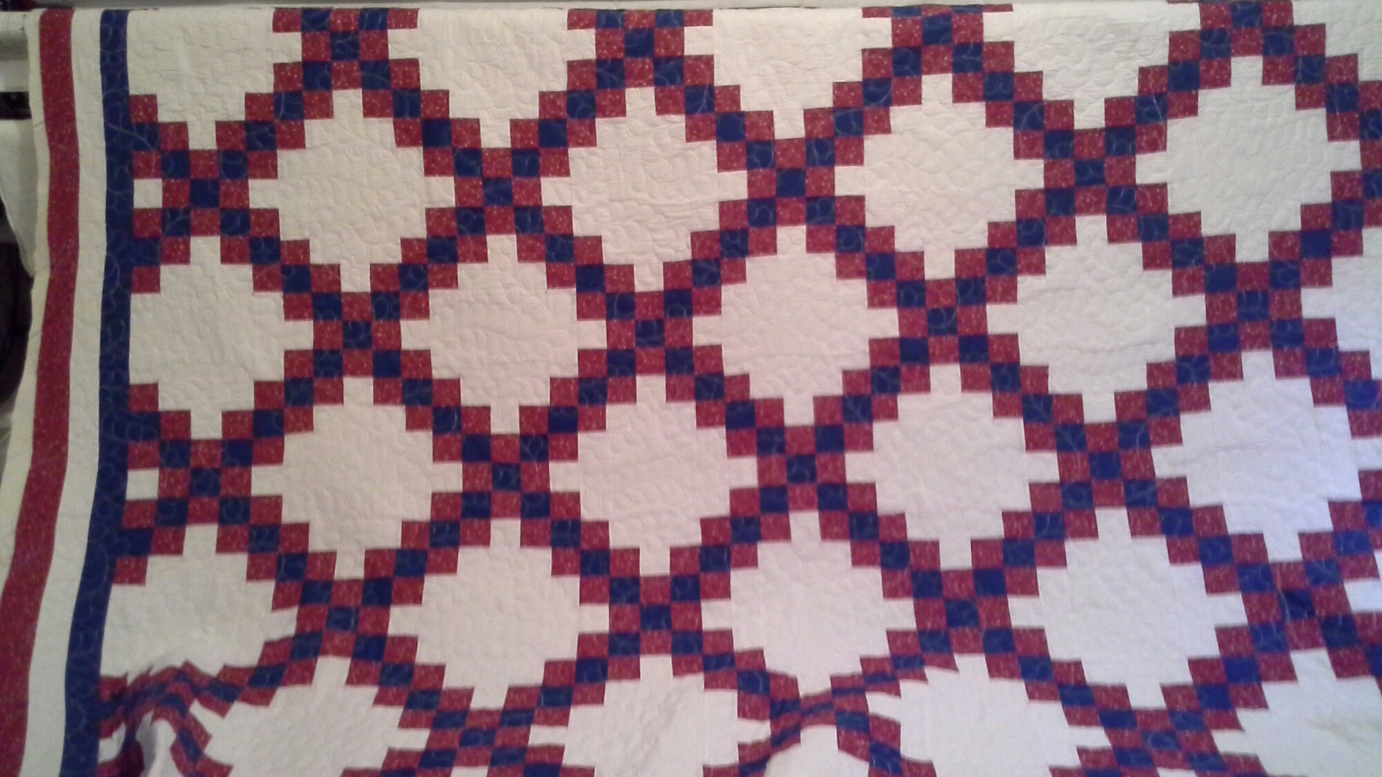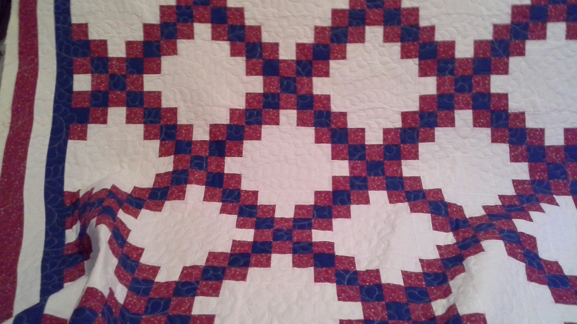 Its perfect for memorial day weekend! This is the first bed quilt this customer has made. Wonderful job. It is quilted in all over feather design.