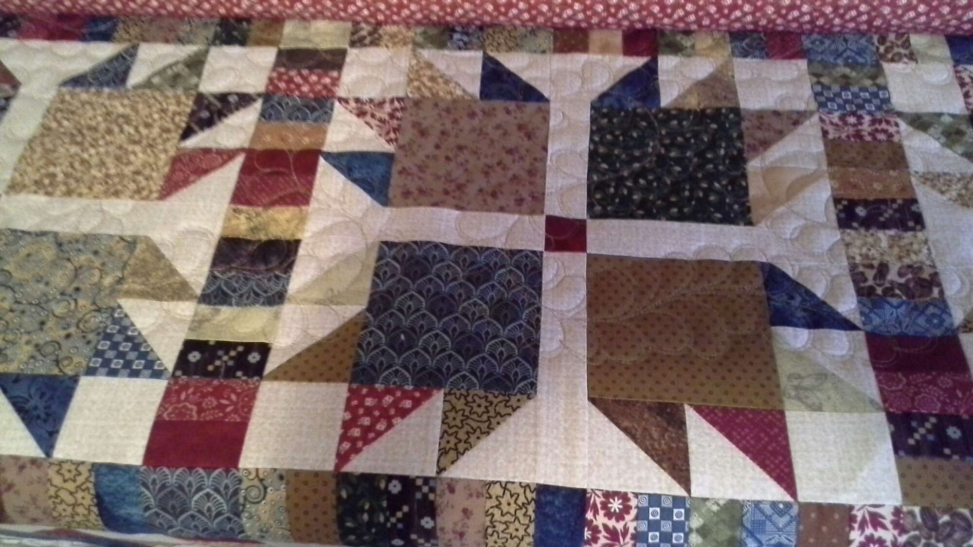 This is a customer quilt that is a bear paw. It is quilted with all over free hand feather design in a copper color thread I will be loading its sister quilt on as soon as I can get it ironed. I get to play with the new iron again!