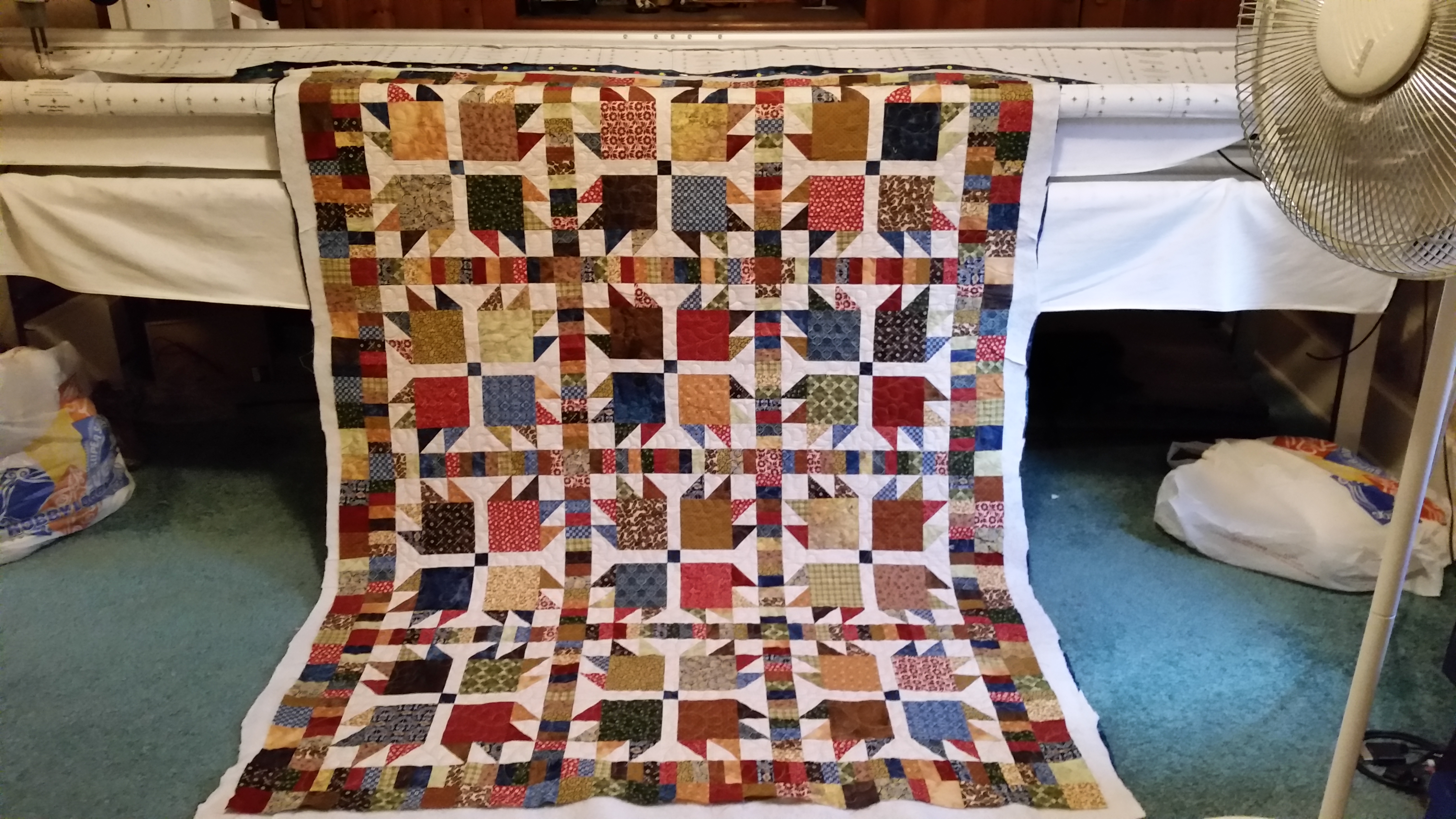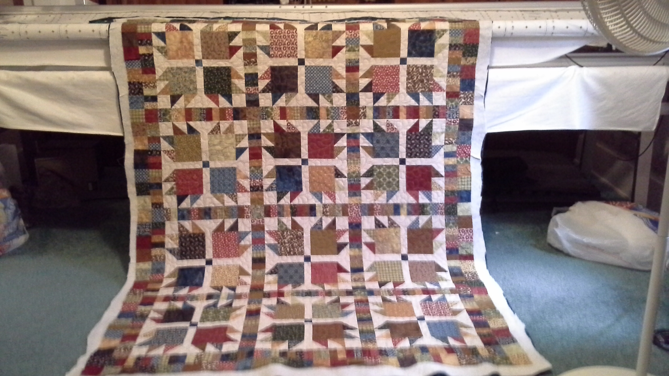 Here is the second Twin quilt that is a Bear Paw pattern. This customer quilt is a set of 2 quilts going in to a guest room This quilt has more blue in it and has a blue batik for the backing. I felt that the batik back made the batting have more loft while quilting it. Cotton fabrics grab the batting more and has less shifting. I love how both quilts are similar but have their own personalities.