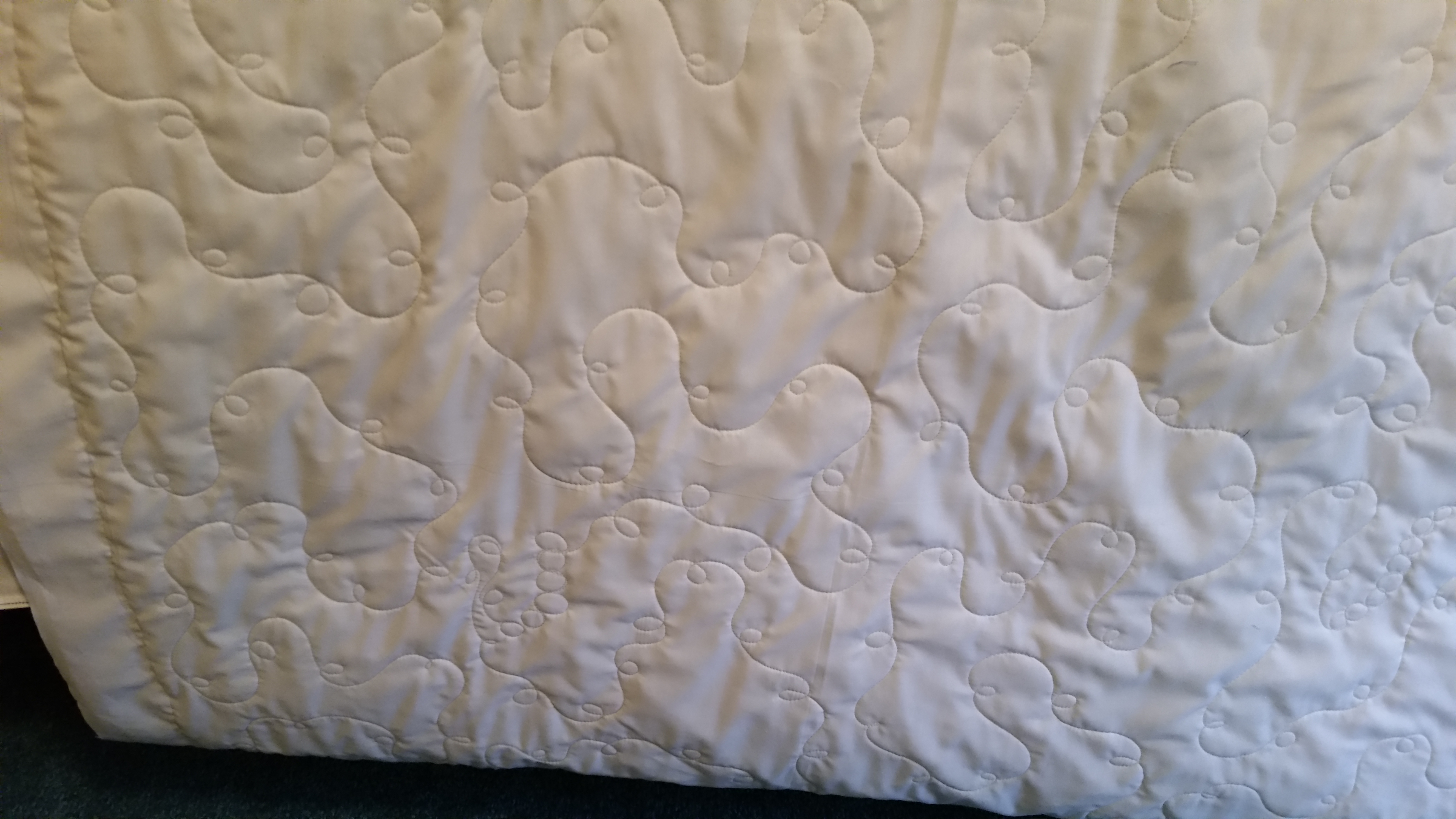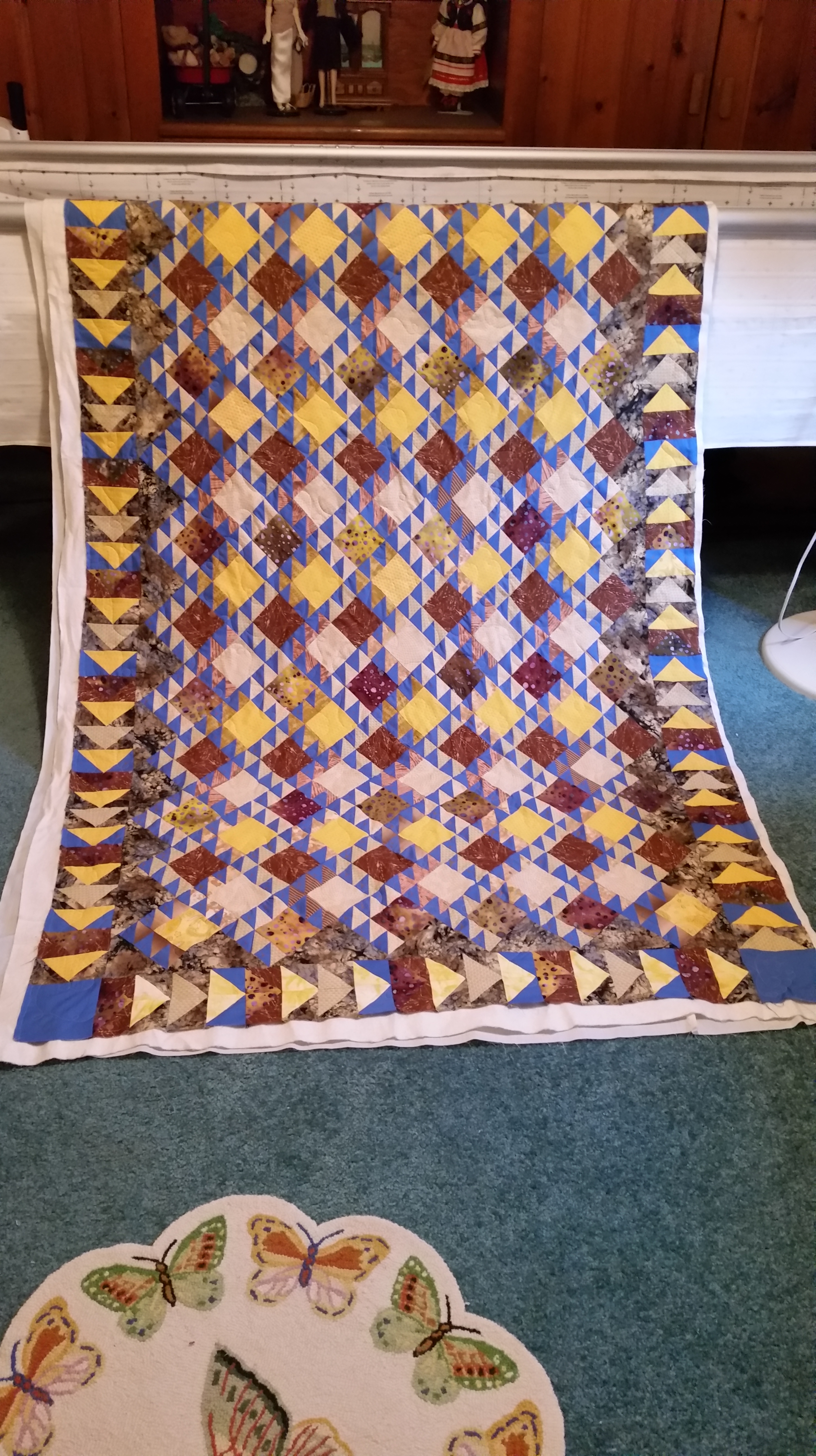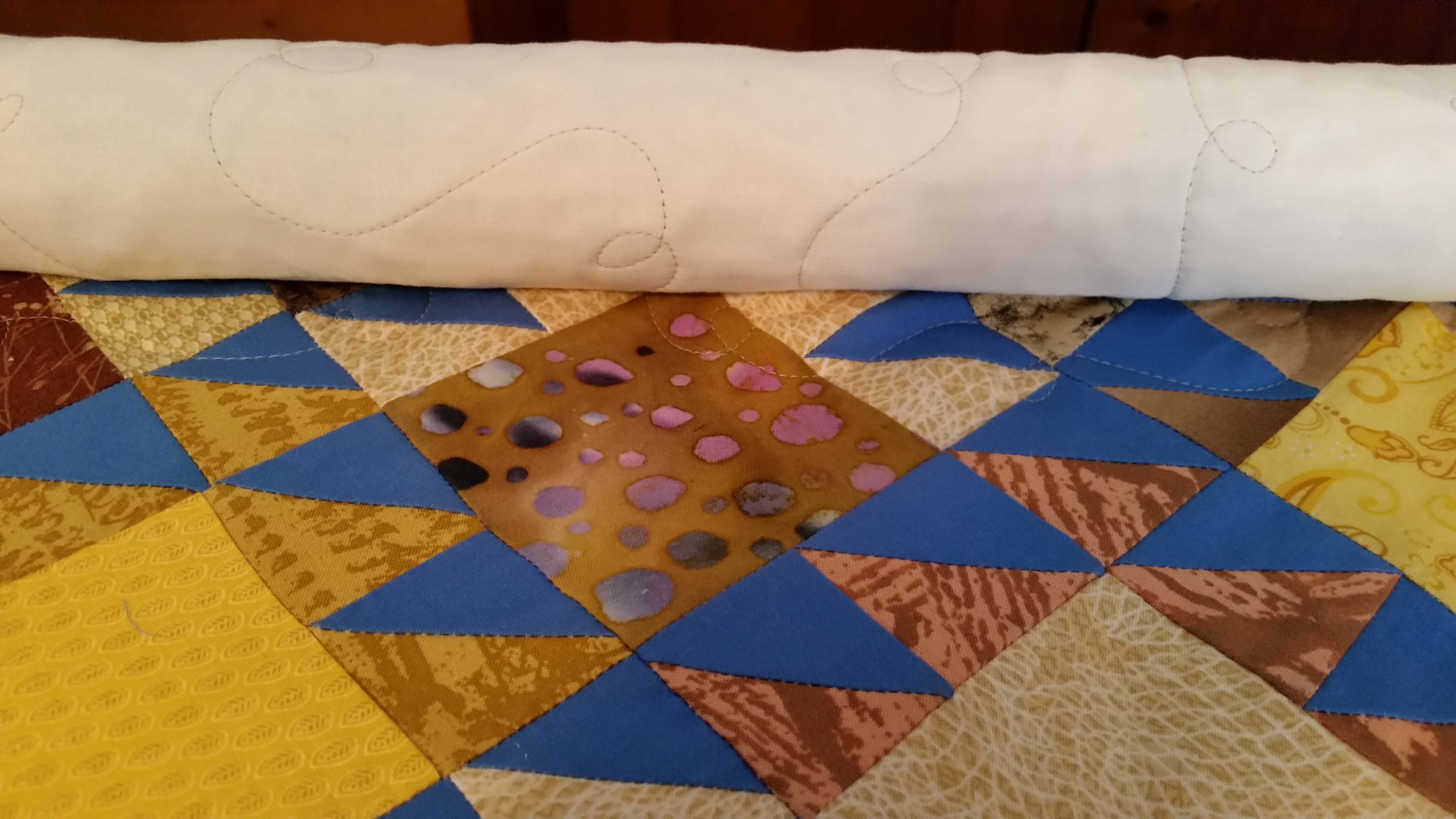 Here is a quilt made by an Octogenarian. She said it is supposed to be fish. I did a loop and swirl with little bubbles occasionally. I decided that I wanted to use a cotton batting because I couldn’t baste it on with a poly batt. I am so glad , it turned out to be really cute. The flying geese border is a really beautiful!
