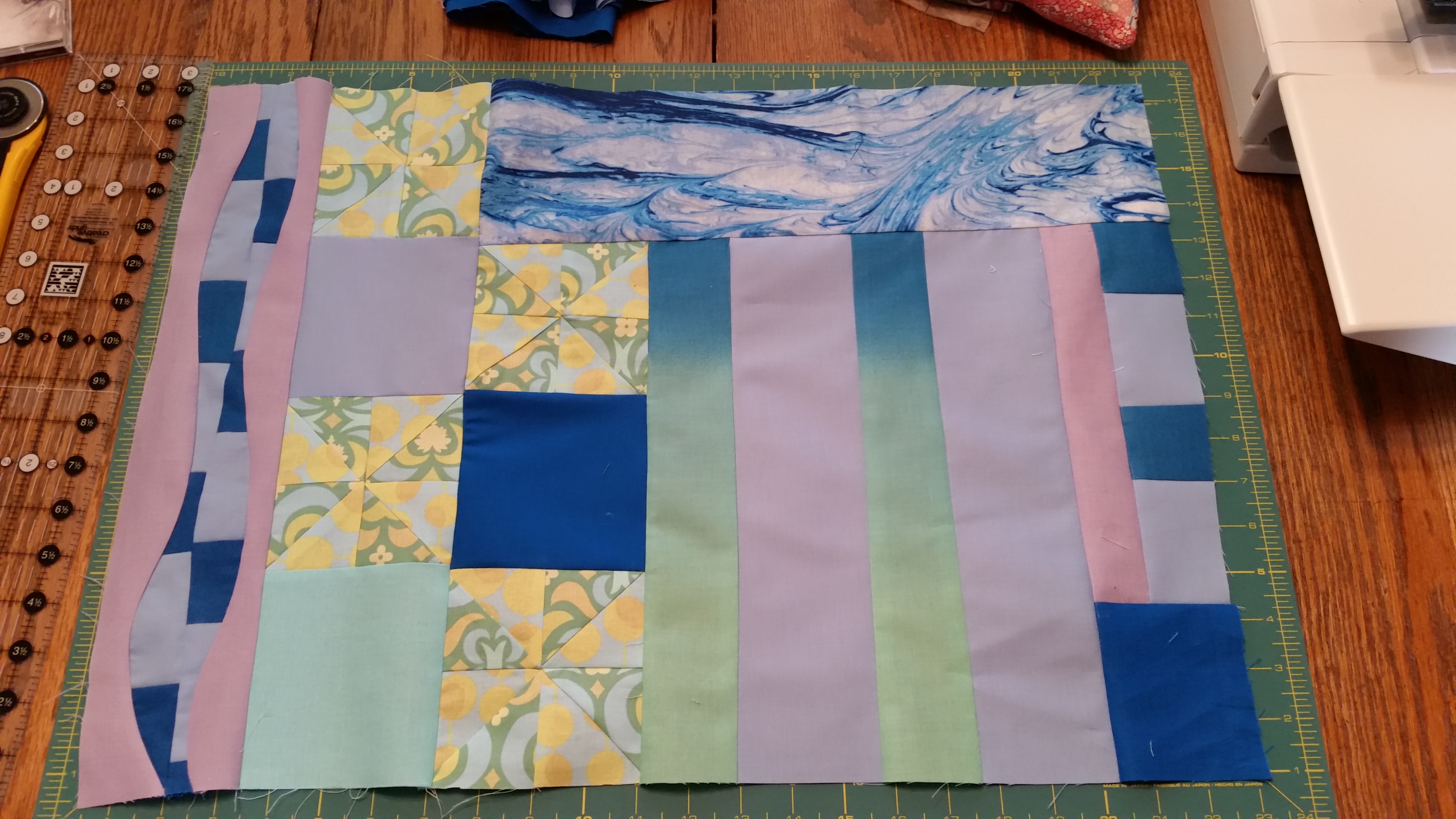 Here is my lttle art quilt , I think that the first picture is the way I want it to be oriented. I am going to long arm it next month. I like it. I think that it reminds me of the Great Lakes—water, spinning winds and sky. It’s an abstract, lol.