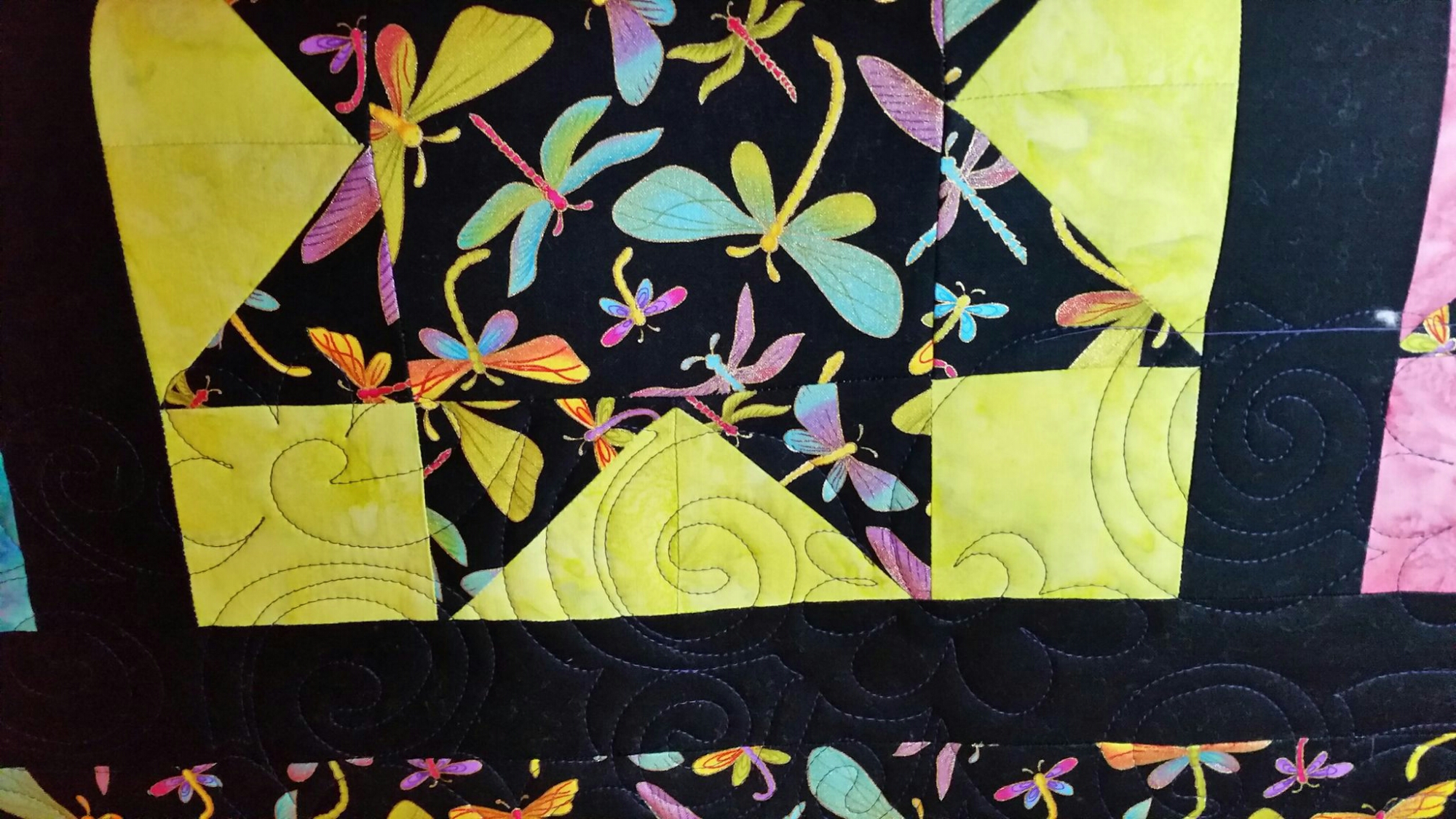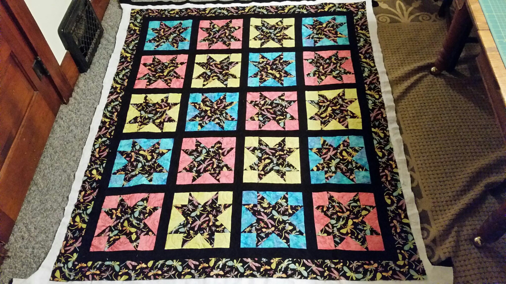 My friend Carol made this lovely star quilt. It is the perfect combo of a great focus fabric, a big contrast with the black and pop of color with the batiks. I was thinking about using a light colored thread but then I pulled out the purple and that was it!