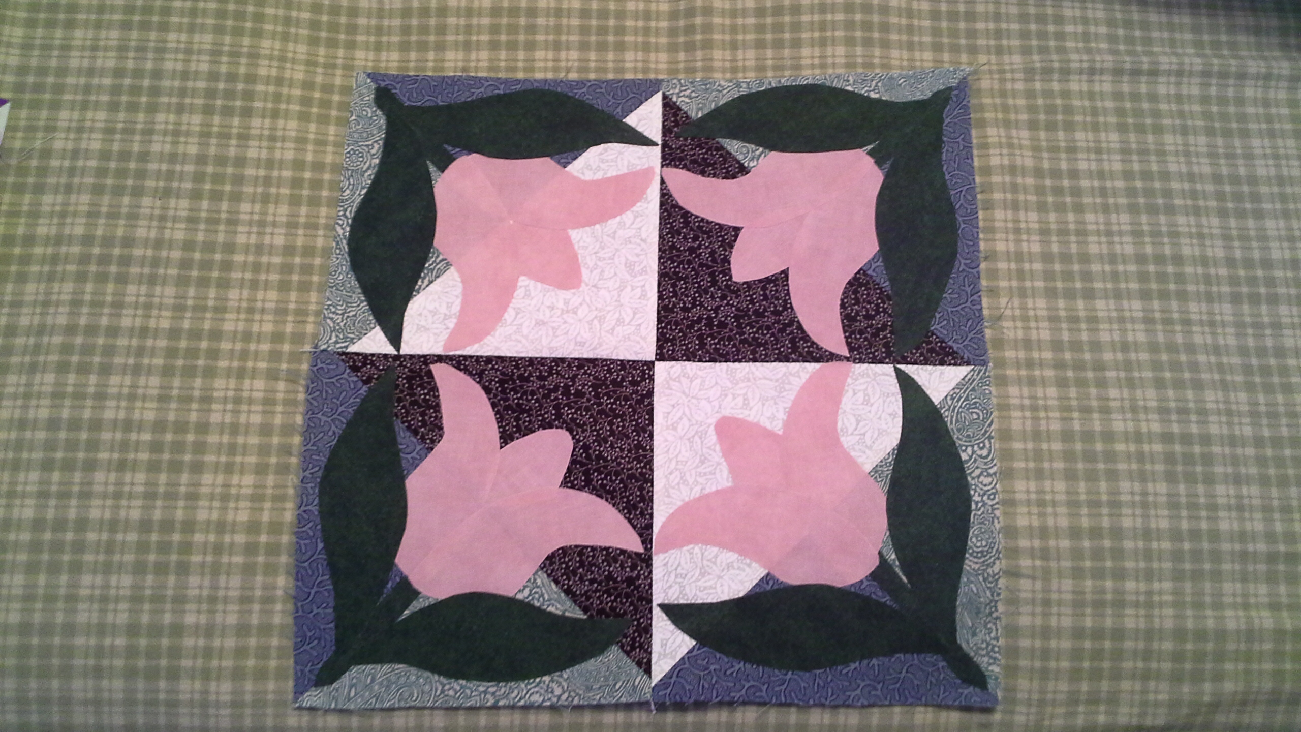 This block is applique, did you feel me shudder at the word applique? I like this one called Tulip time. I like it because it is simple, sweet and something I could do. It looks great, most of my applique is very sad. I also like the background . It is on page 37 and by C. Door.