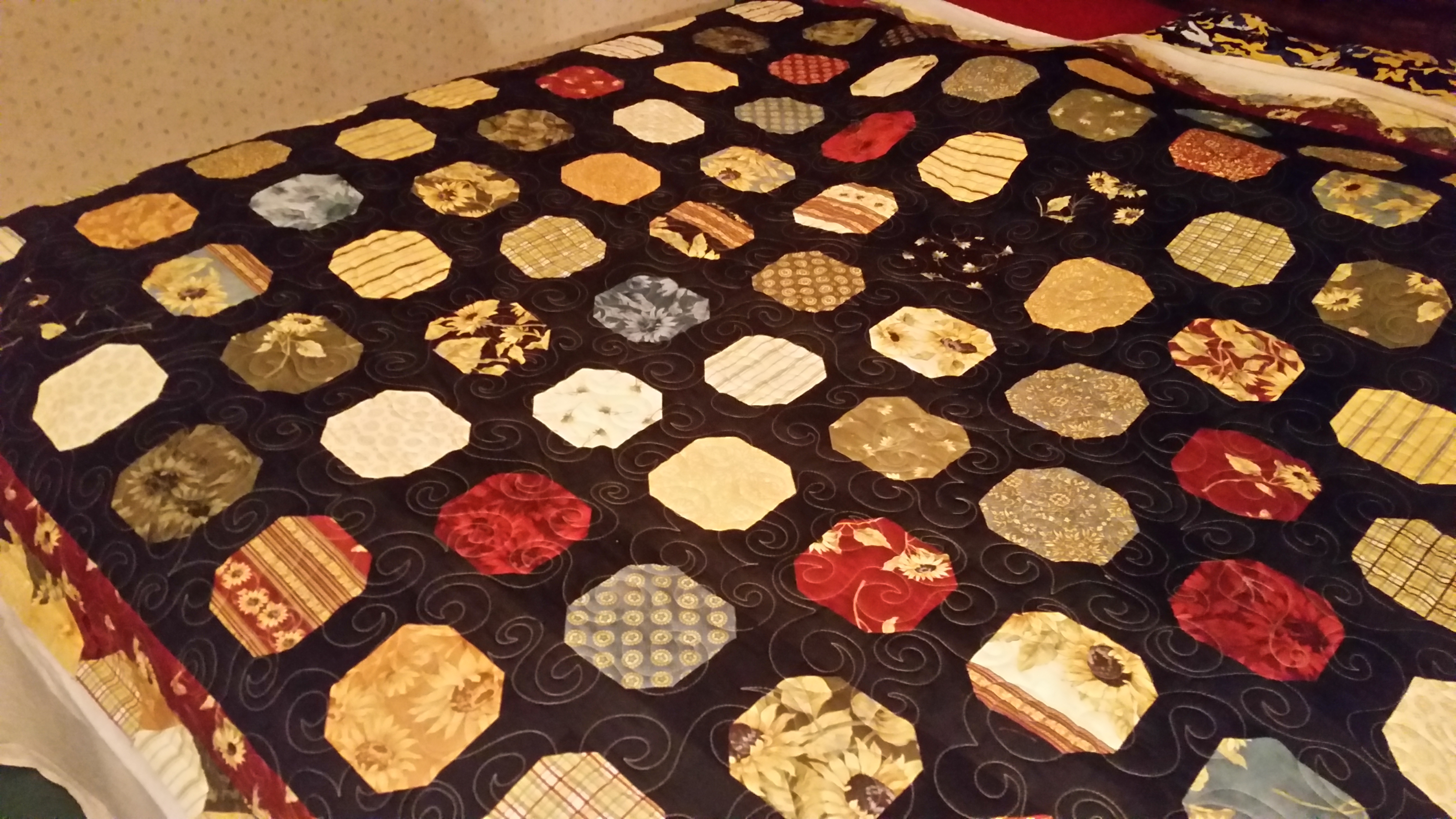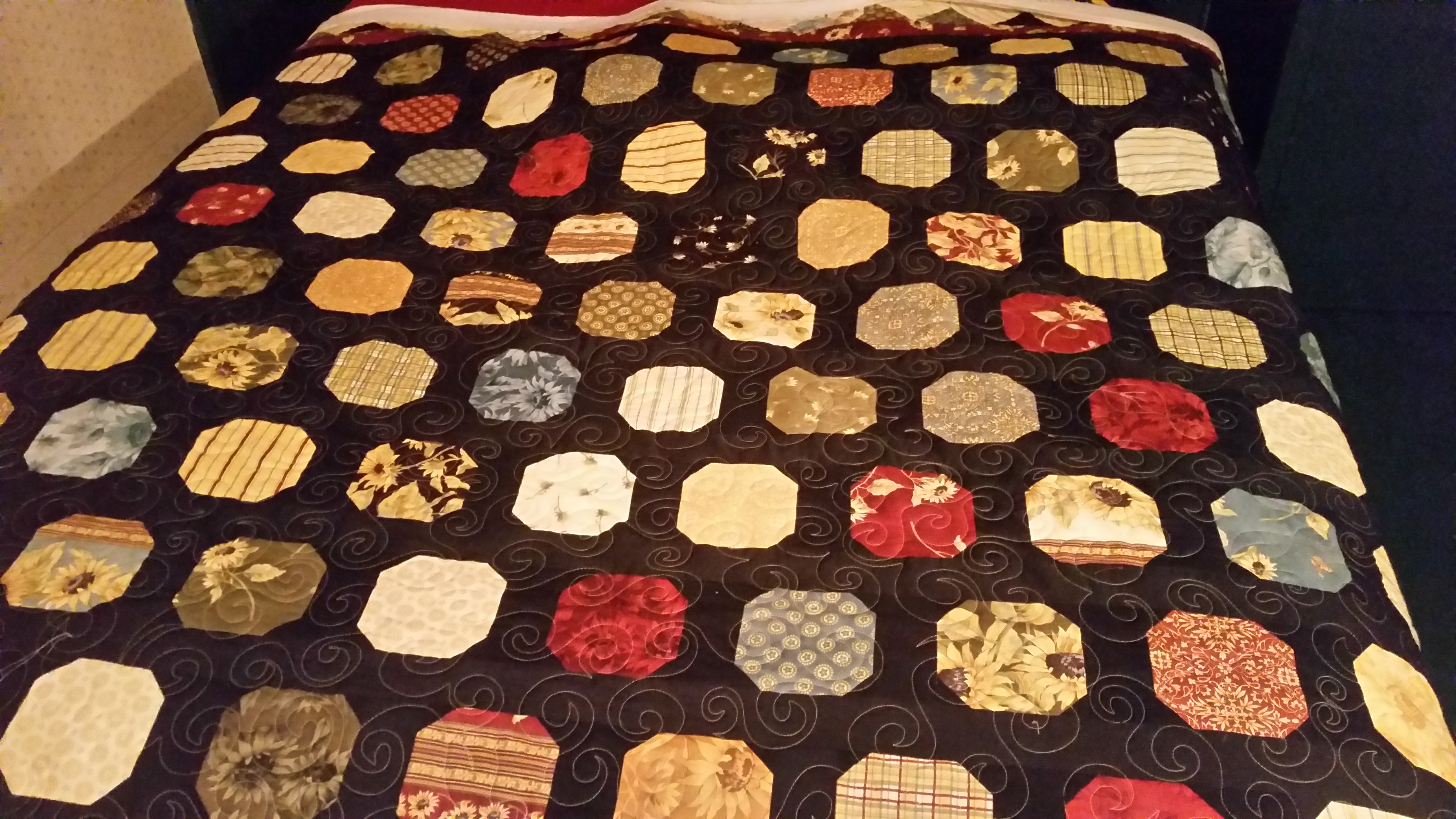 I have completed another customer quilt. It has the biggest punch with the piecing. Snowballs set in black solids fabrics. I quilted it in swirls and a paisley leaf. I love this quilt so much. I think that it will be well received by my customer.