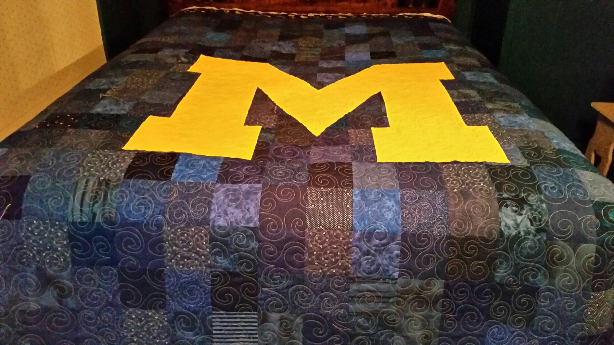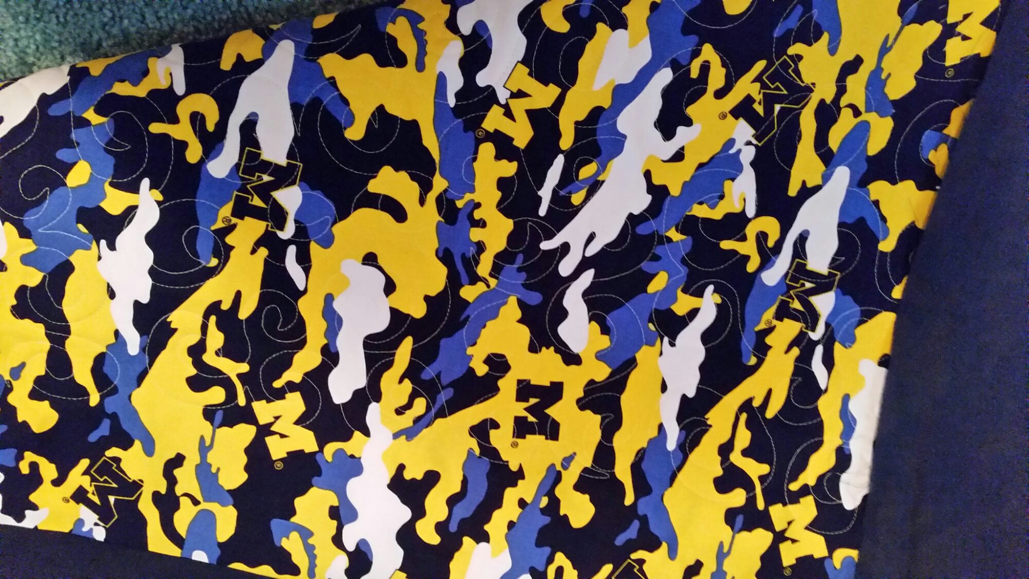 This customer quilt is so full of suprises. The more you look, the more you see! I has the Michigan block M, it has cammo and the block M on the backing fabric. It is so perfect for a University  of Michigan student  going into the military  after graduating.