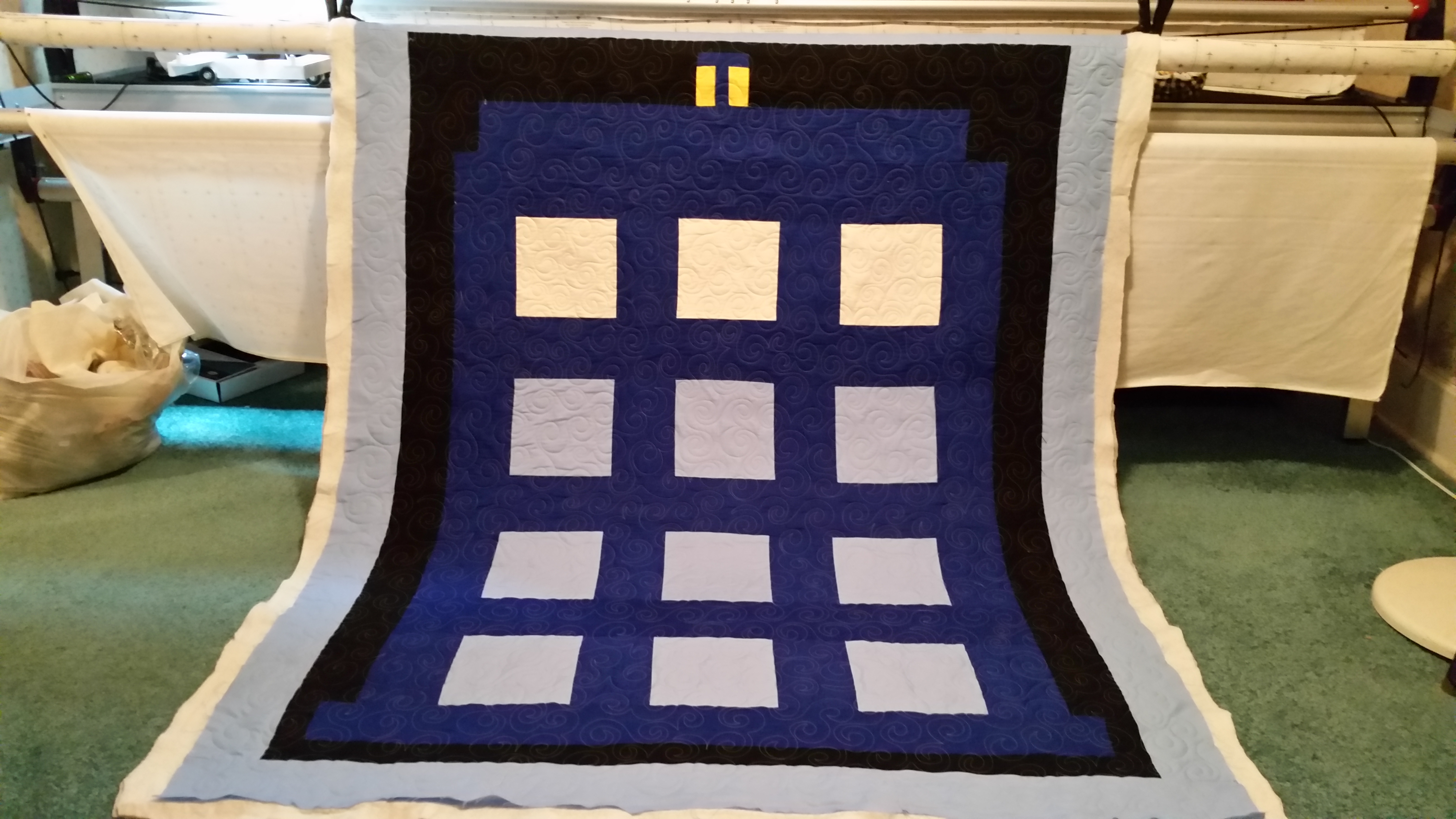 I made a tardis quilt (from Dr Who) for my son in law. He liked it. I bound it in a star fabric. I quilted it in all over swirls. I enjoy making these quilts that are more graphic and less complicated in piecing. I think I have my plan for 2015 personal quilt projects. I am feeling the pull of Gwen Marsten’s style.