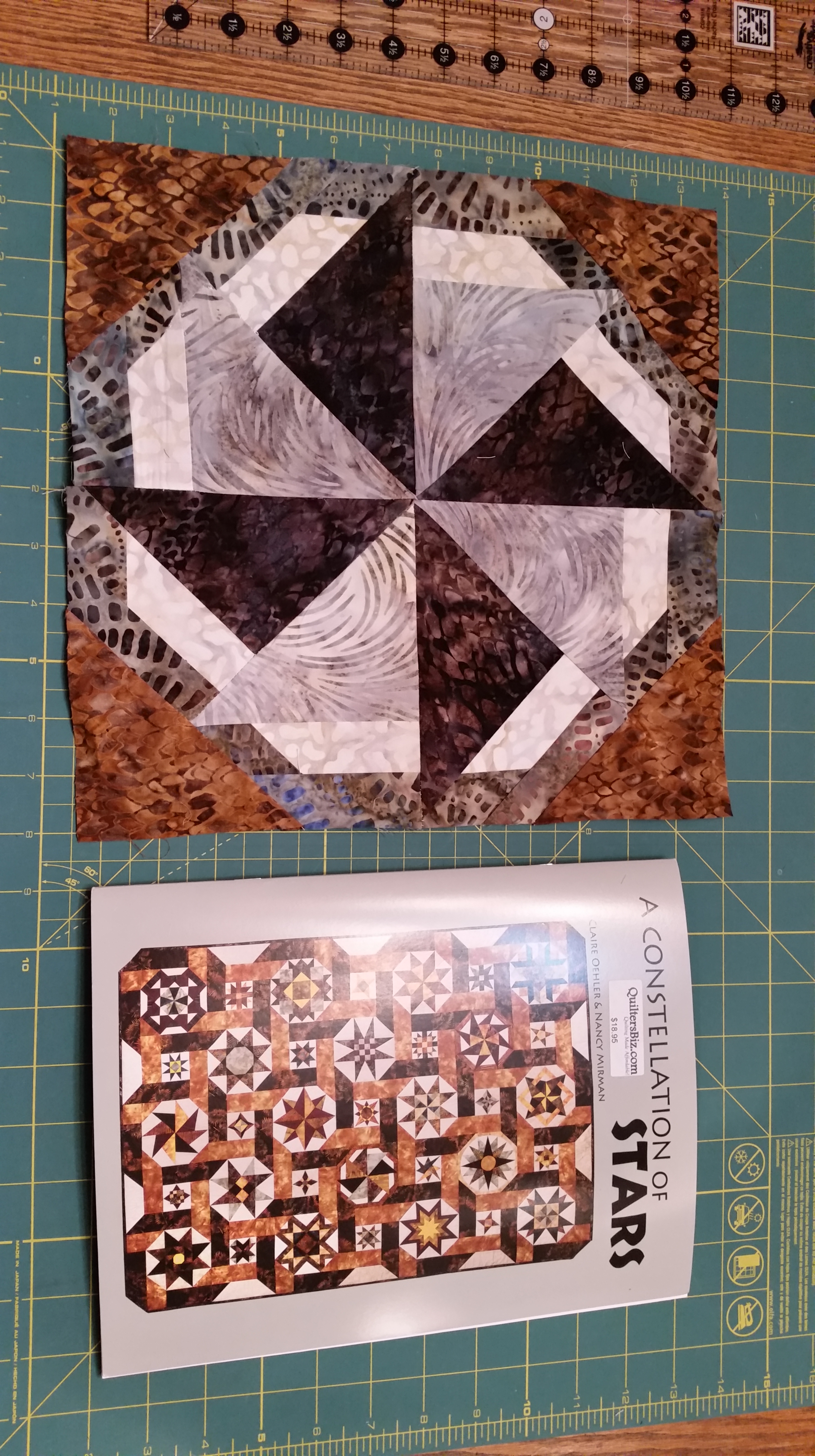 This block went together a little bit better (points aren’t perfect so I was a little bit sad ) and it shows the completed quilt on the cover of the pattern. I love it and don’t know why it is taking me this long to move on this quilt. I have to get it done. I bought a new Janome machine and there is a little bit of a learning curve with this simple yet wonderful machine and paper piecing is a newer thing on it this month.