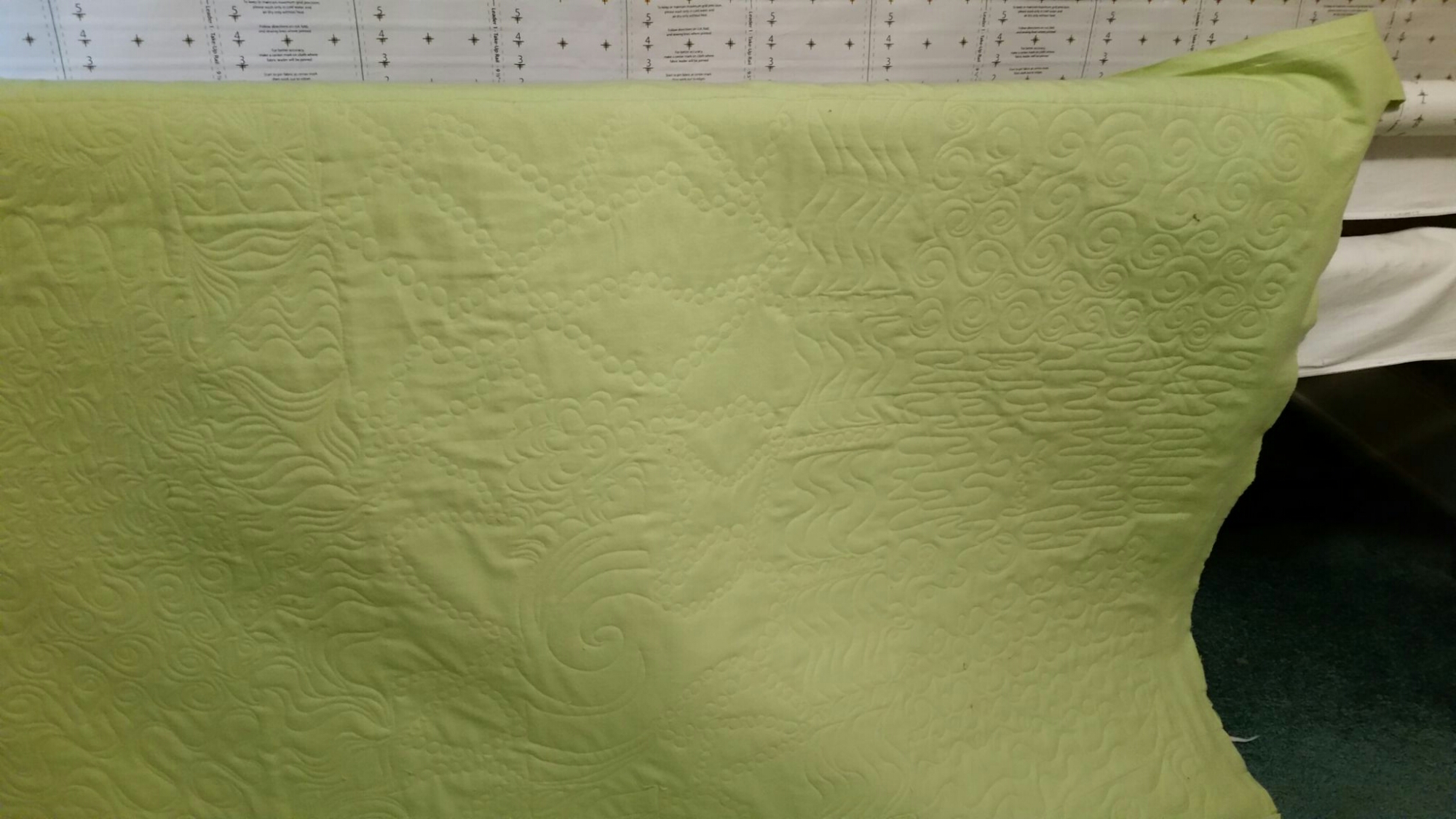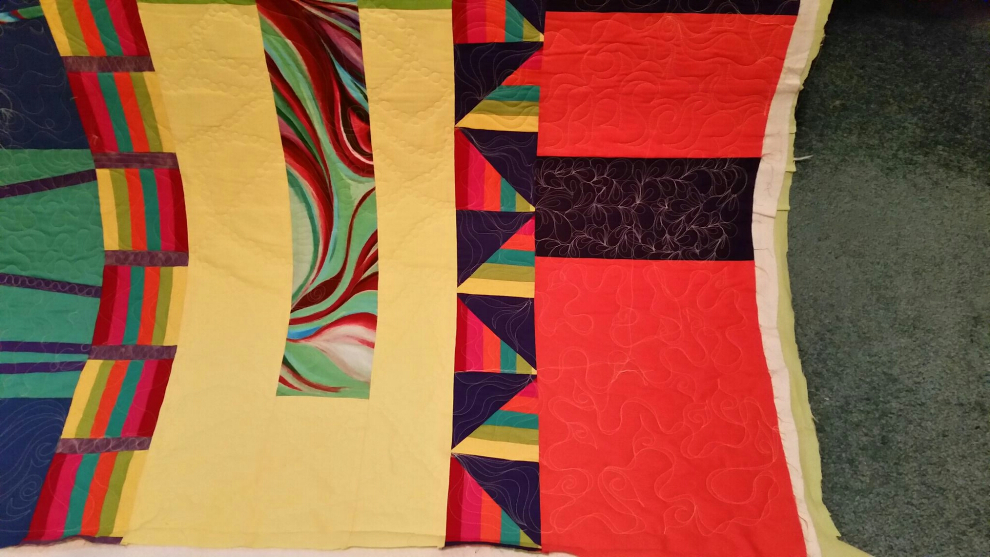 I have to say that Holly made a really gorgeous quilt and then let me quilt anything on it! It has blues on the left and that had a water feel to it….the orange and reds on the right reminded me of fire. So I based the quilting on these ideas. These two elements join in the center with a dna strands and the wow fabric.