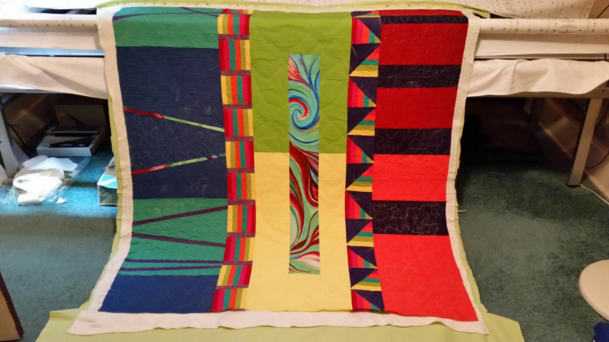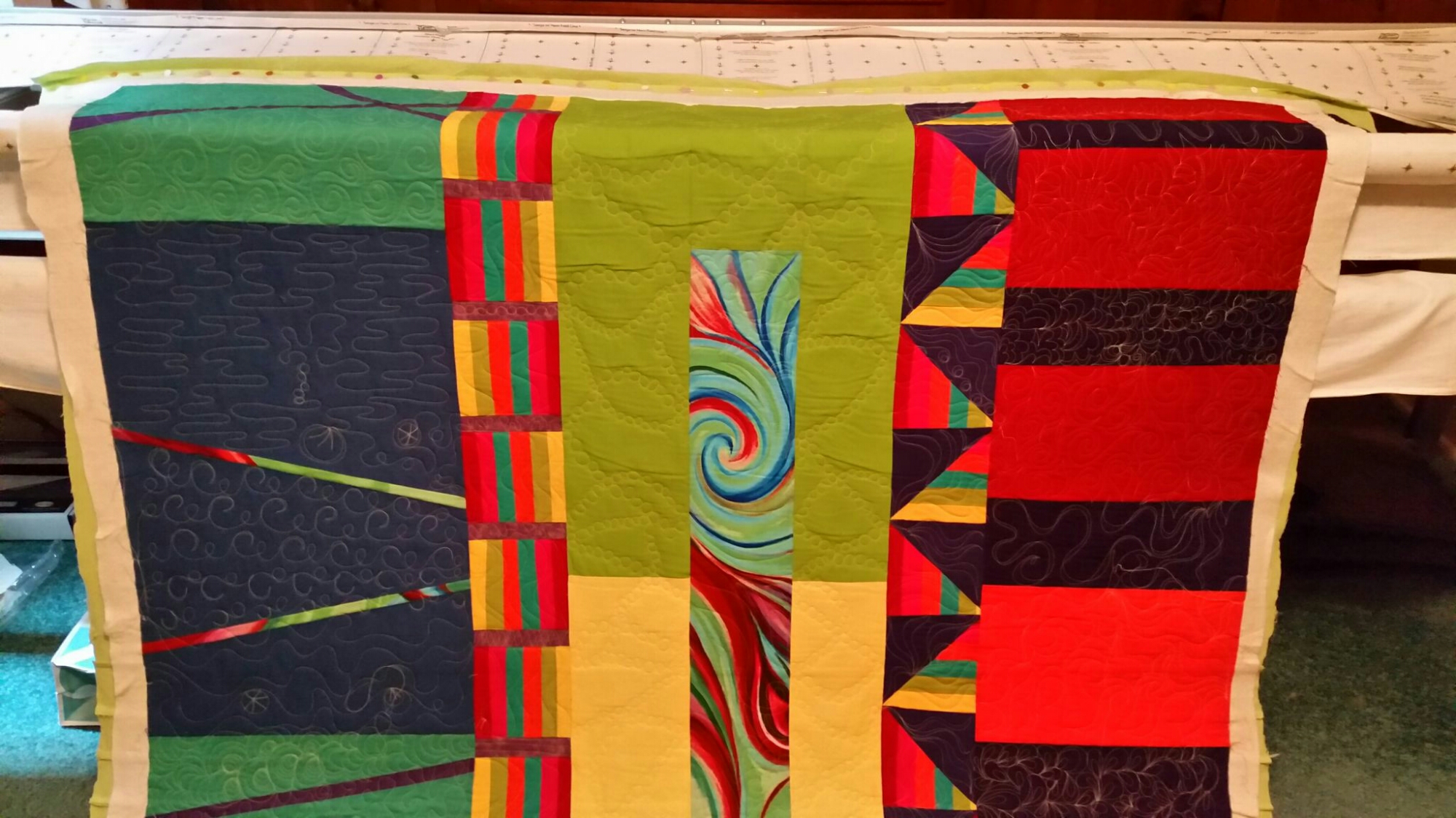 I have to say that Holly made a really gorgeous quilt and then let me quilt anything on it! It is has blues on the left and that had a water feel to it….the orange and reds on the right reminded me of fire. These two elements join in the center with a dna strands and the wow fabric.