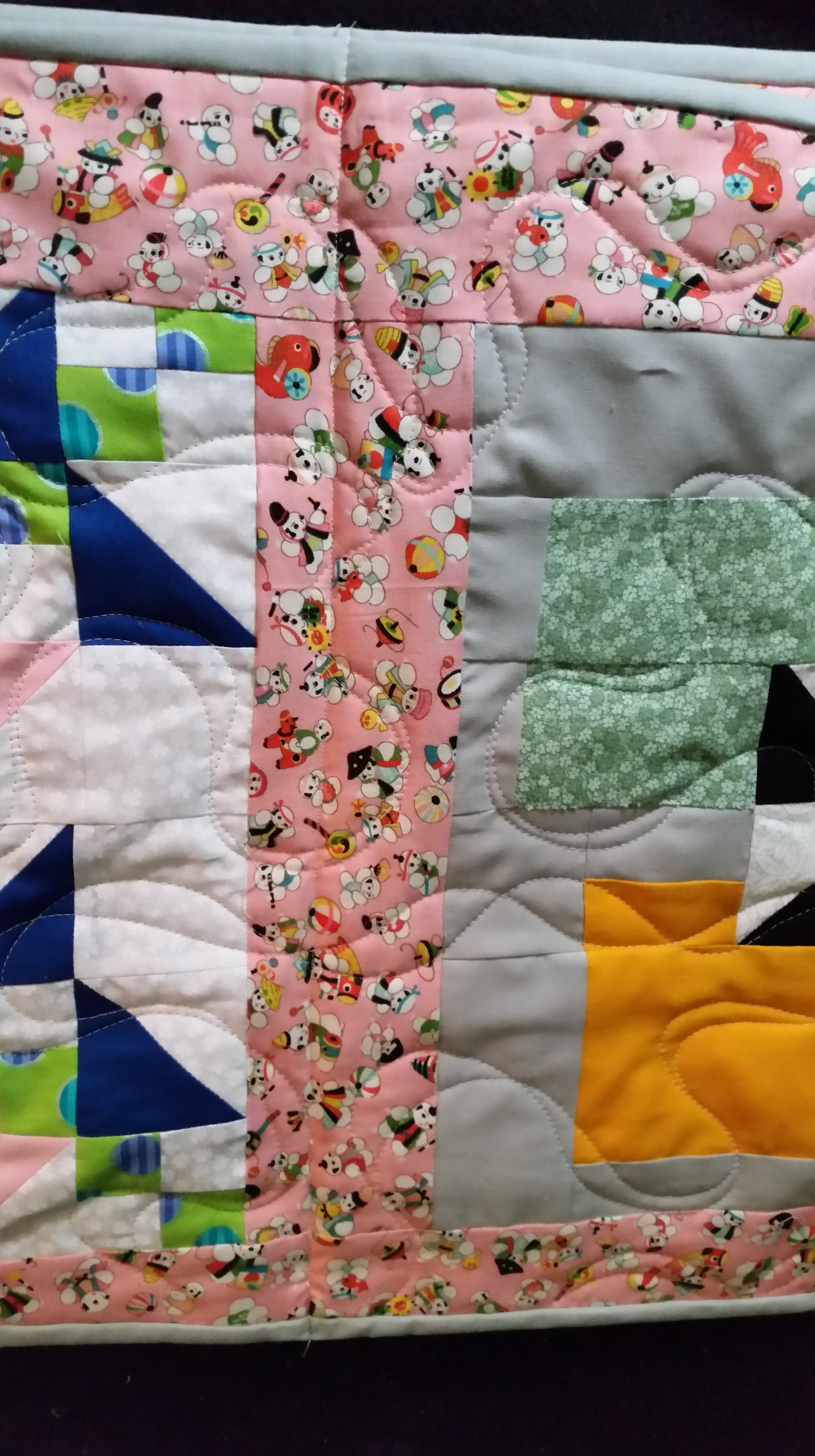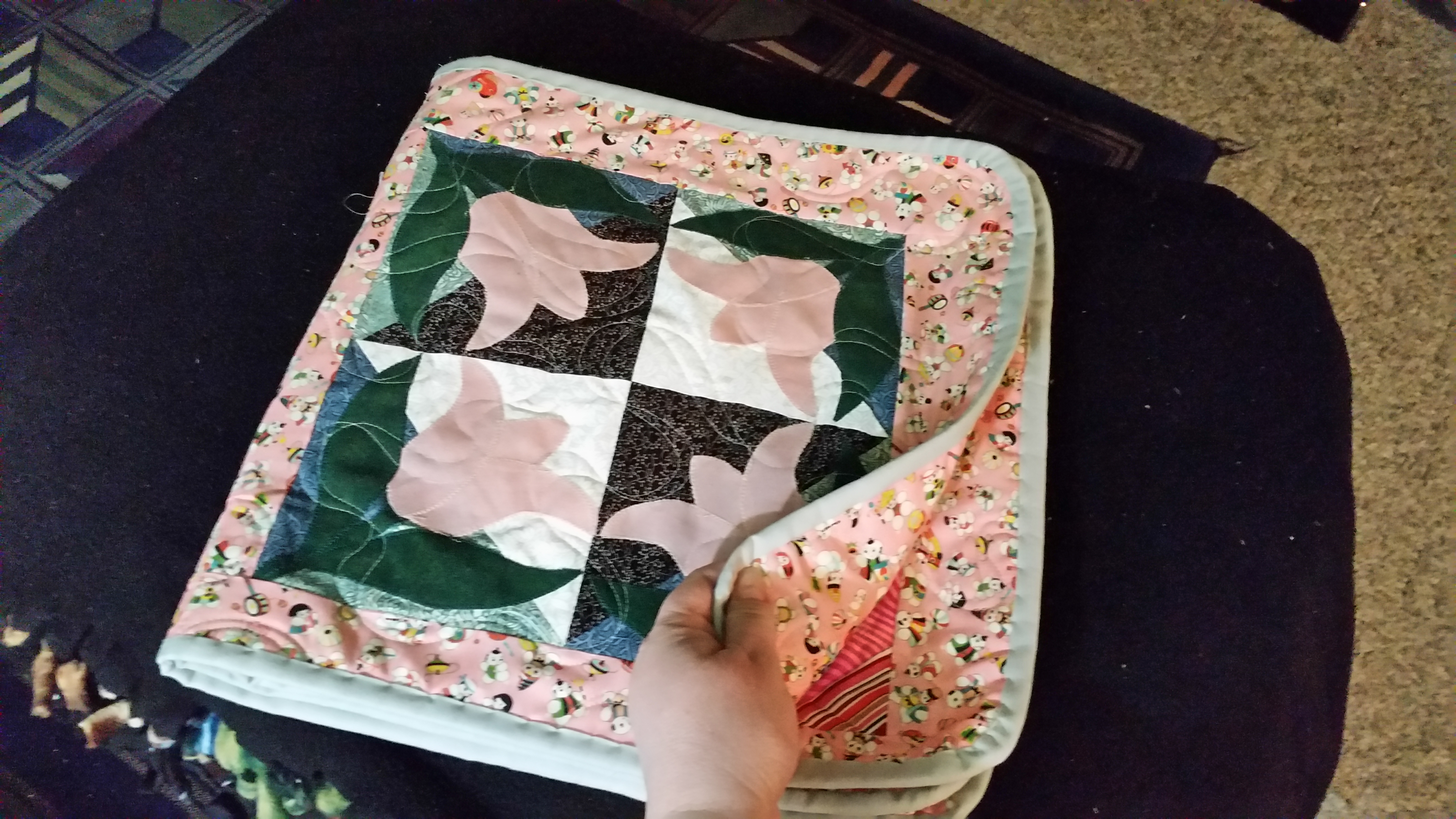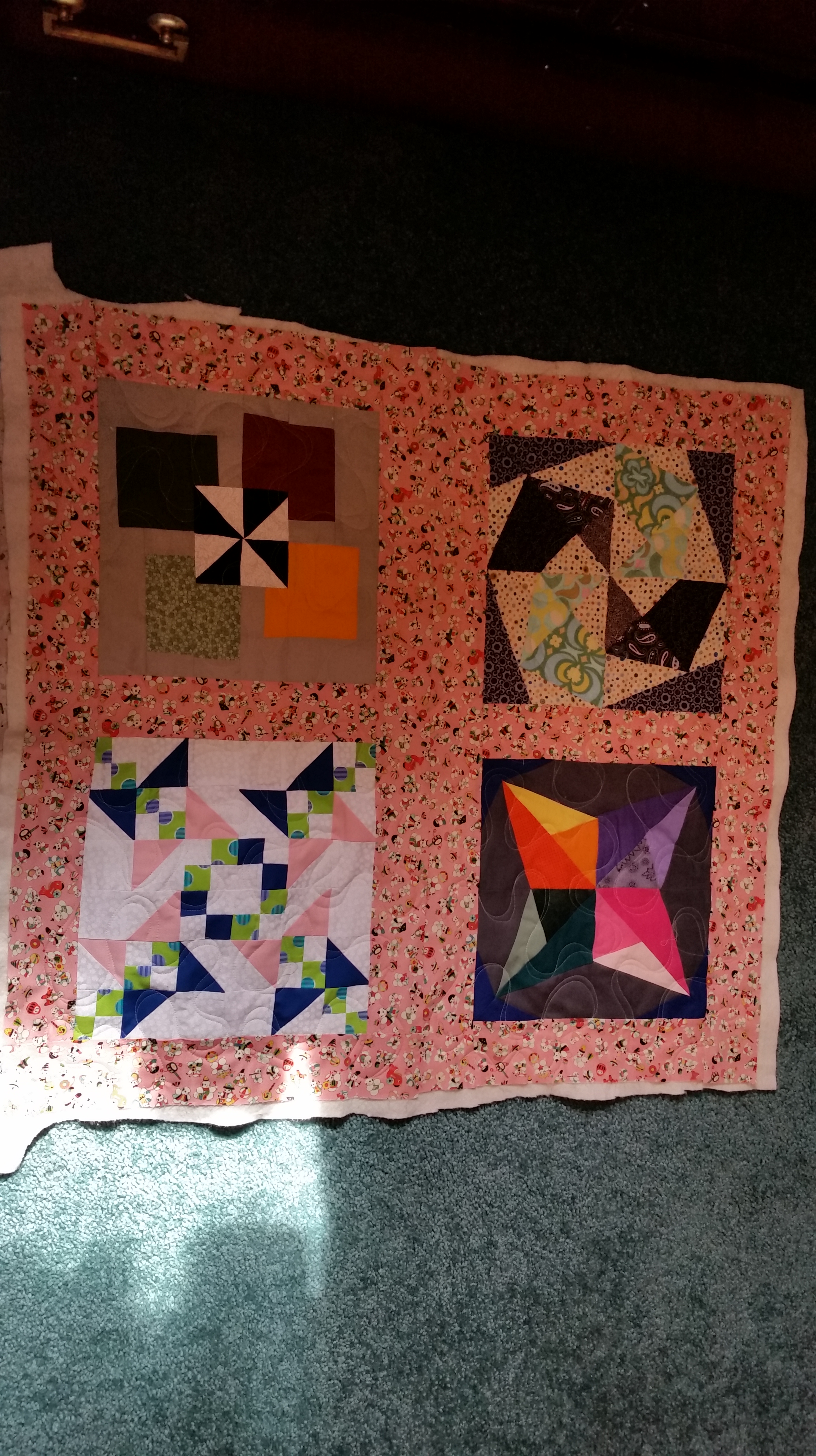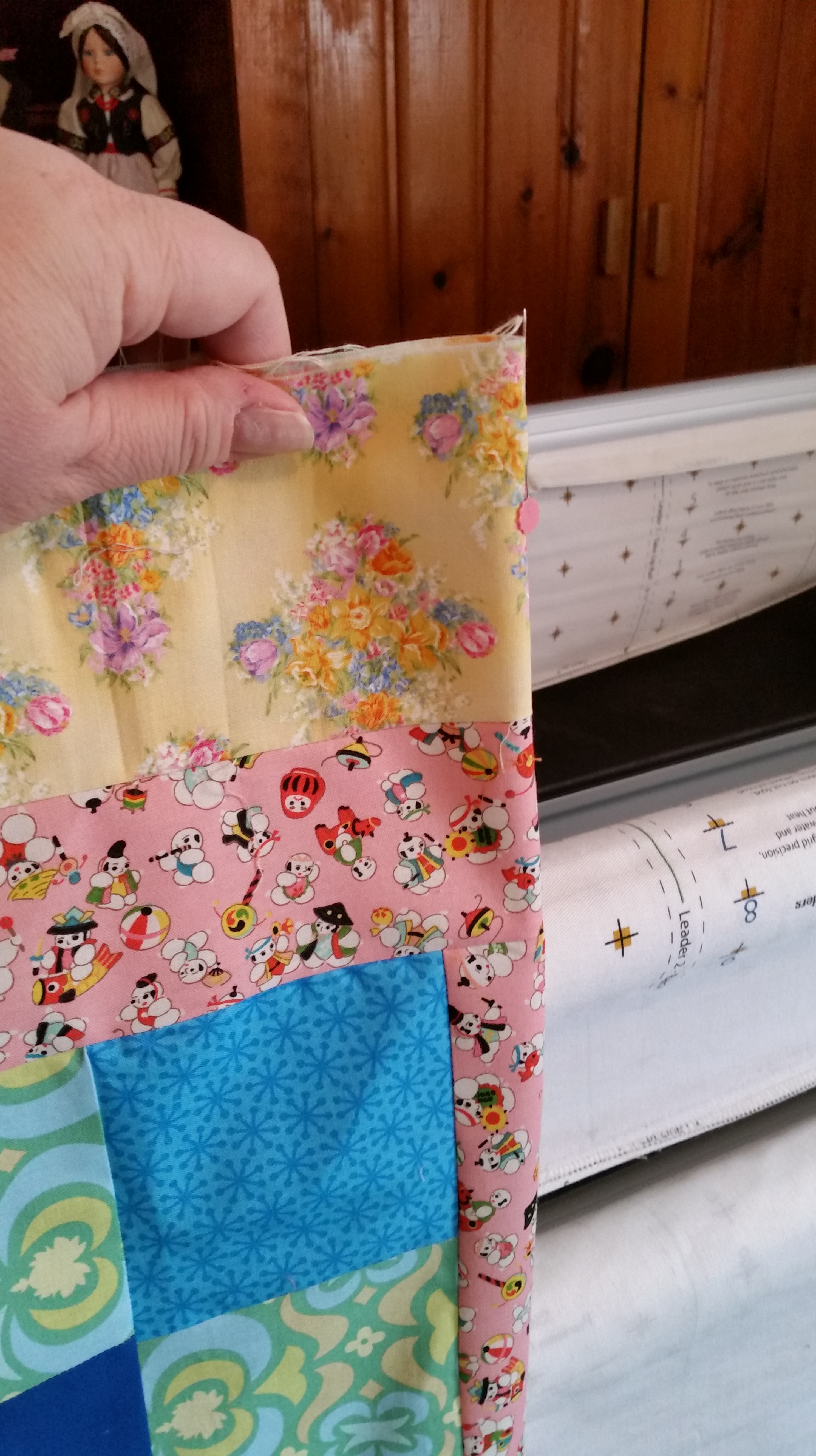 I decided that I wanted to make a fabric book for my grand daughters. I am not able to do the hand work with wool due to my limited use of my fingers in fine hand work. I was thinking about what to do with all the test blocks I have in my box that I made when testing patterns for Quiltmakers 100 block magazine. These blocks are all 12 inch blocks. I made a 3 inch frame around each block and then sewed them together. 4 block top and a 4 block back, it is reversable. I loaded it on the longarm and tried to line up the seams. The 3 inch frames are oversized so I can trim them down. I sewed a header for the back, in the pic below.