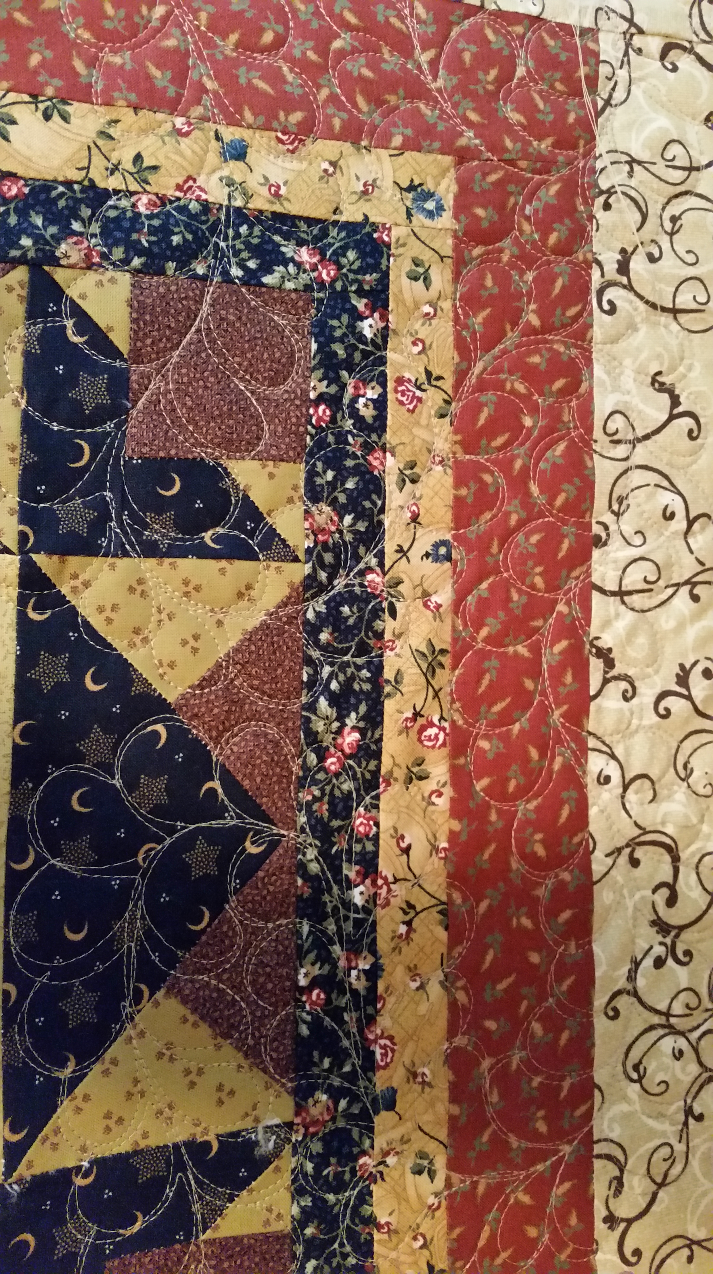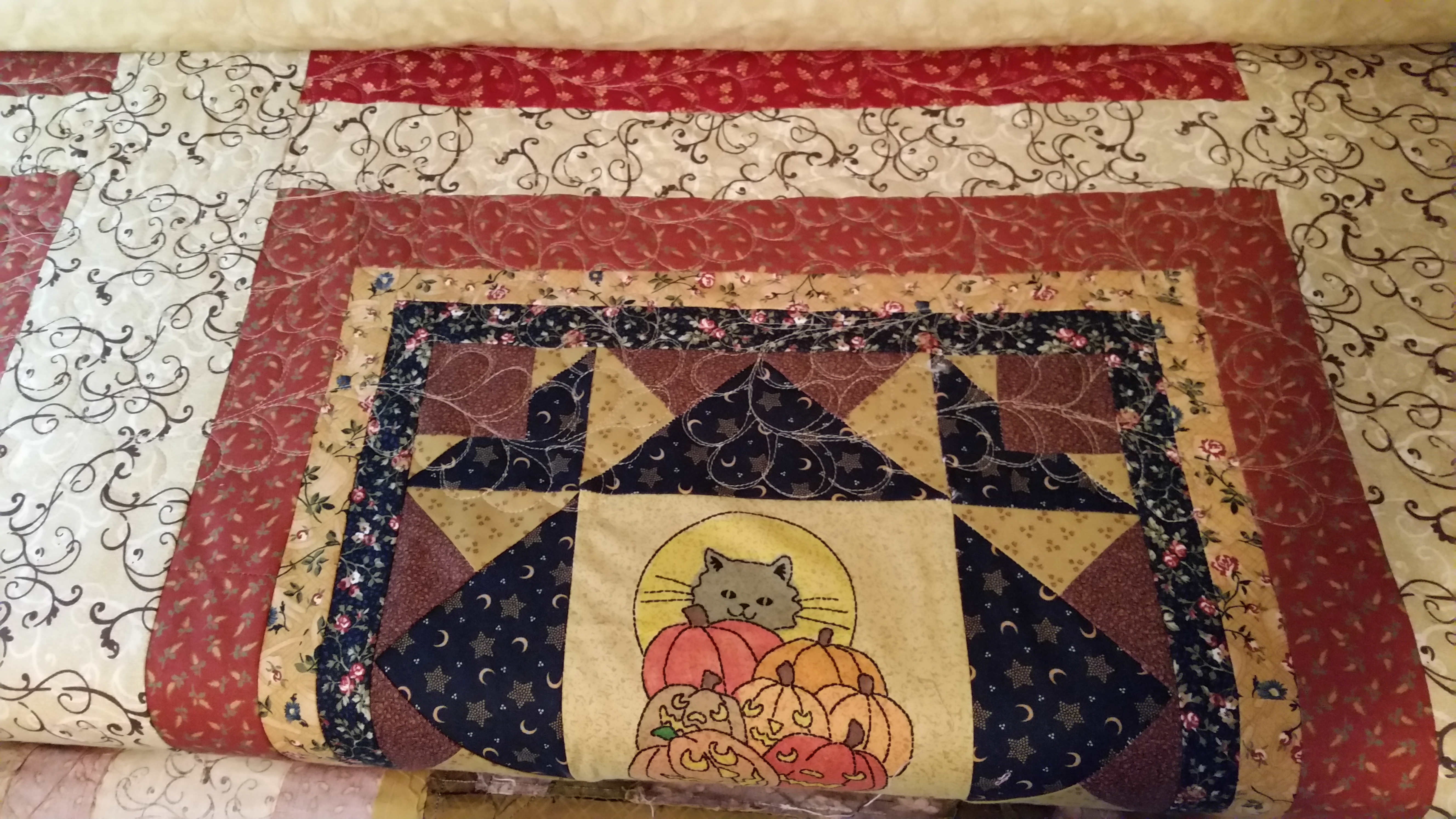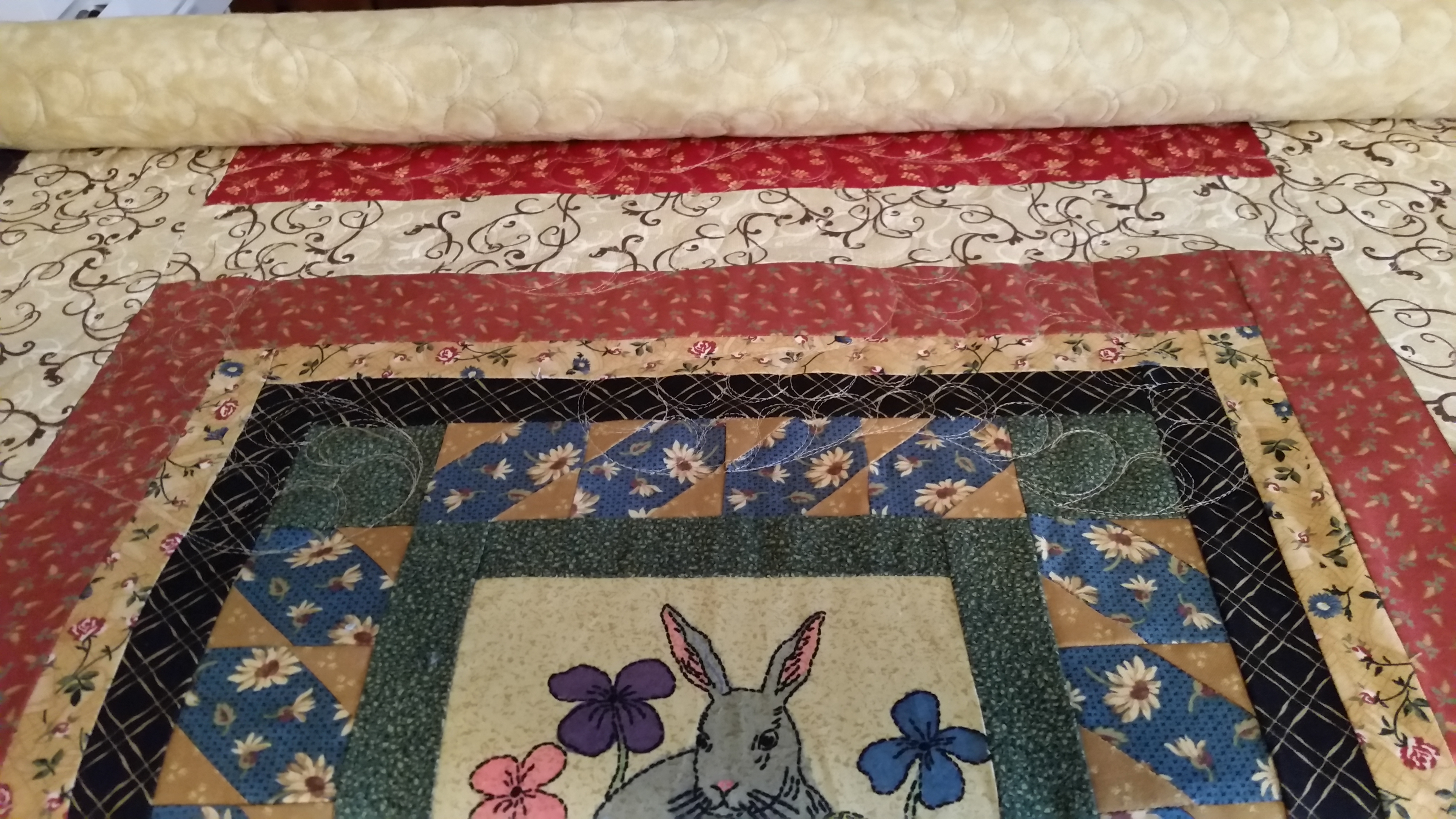 I am approaching the halfway point on the quilt for the historical society. It has some embroidered blocks and it has all months of the year represented. I think that it will be very pretty when finished. Hopefully it will be off the frame this weekend and then I sew a binding on it.