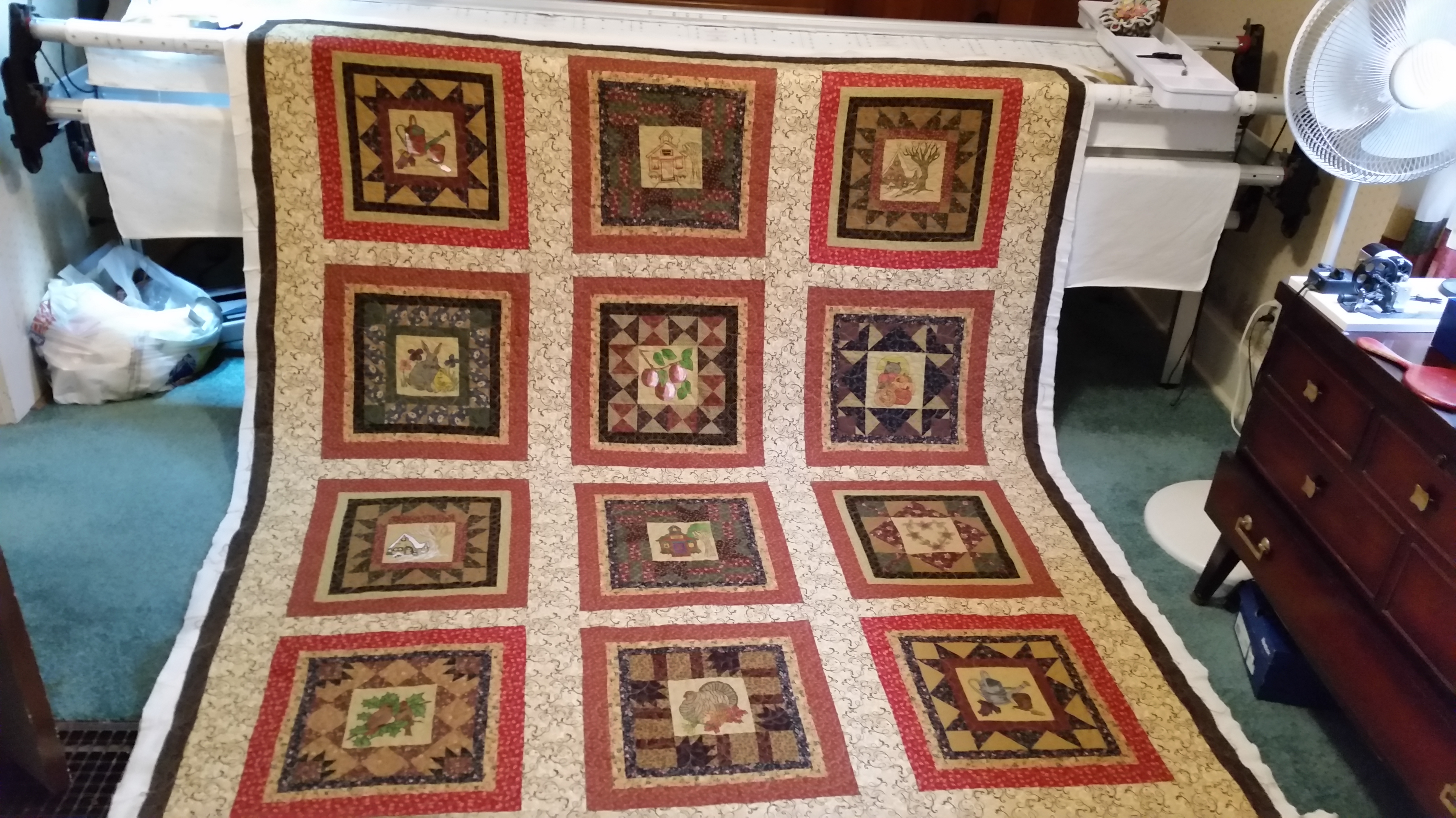 I have finished the historical societies quilt. Raffle tickets will be available when the museum opens for the summer. I think the all over freemotion feather gives it a nice finishing touch.