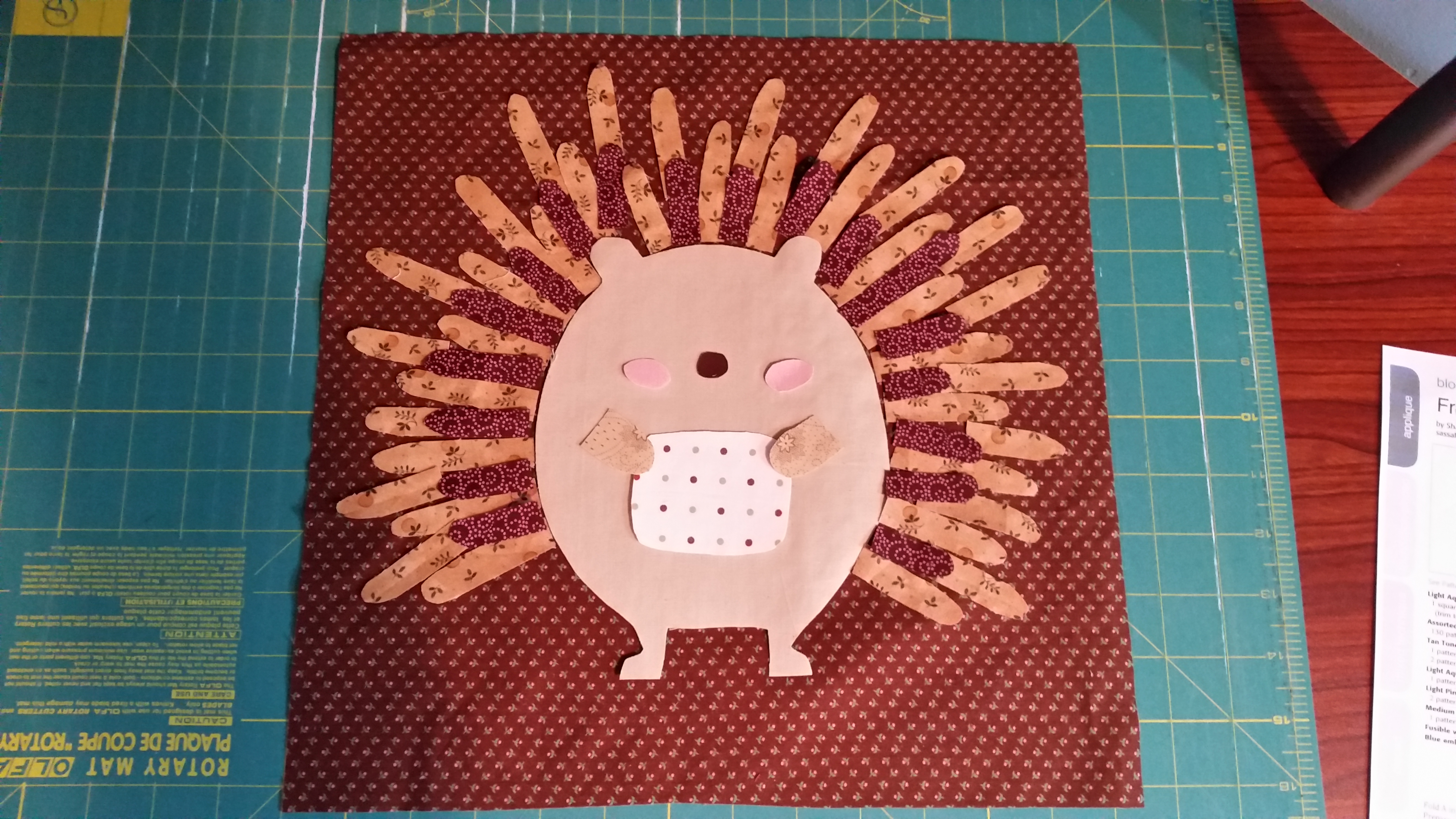 I love testing patterns. It pushes me to try blocks  I would never make of my own volition. This block is one. Its adorable,  dont get me wrong but it is applique with a million tiny pieces! Not my strong suit. I did not embroider the details on this little hedgehog like his eyes. Here is a pic from the magazine: