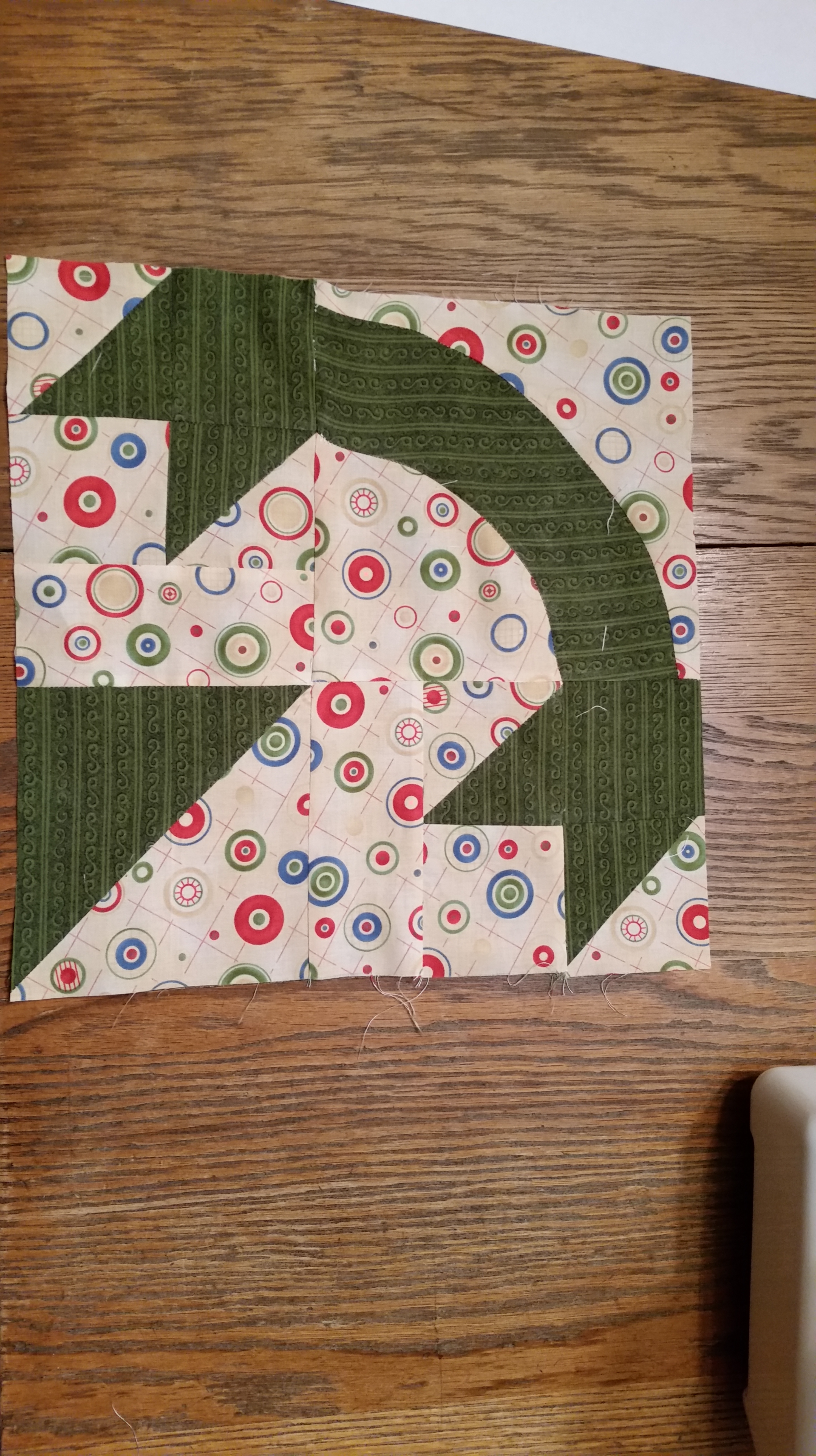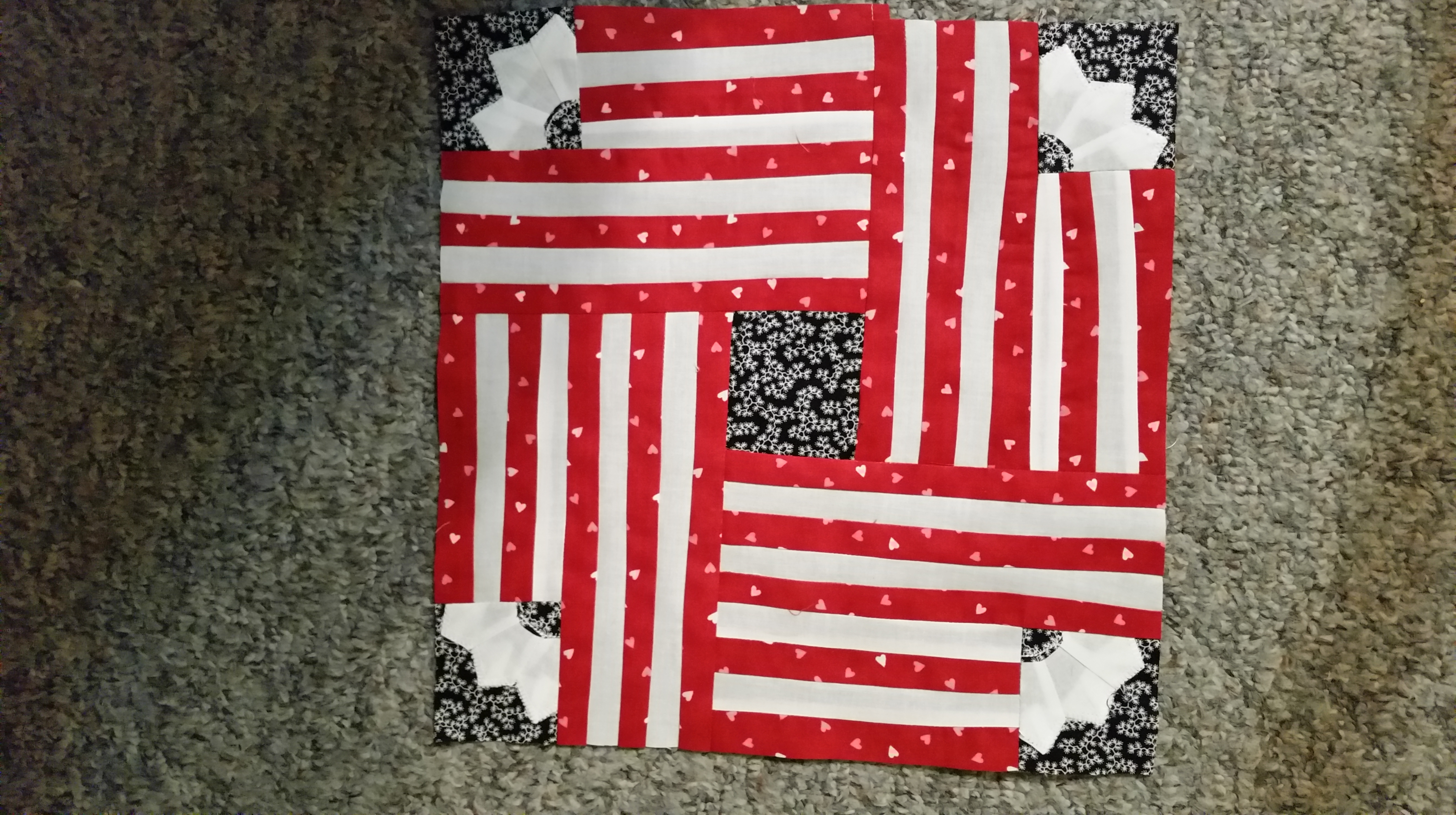 This is called Lover’s Knot. It is a really interesting block on it’s own but I think that it would look great in a group of 4. I was able to piece the curve without much difficulty! Page 56 in the magazine.