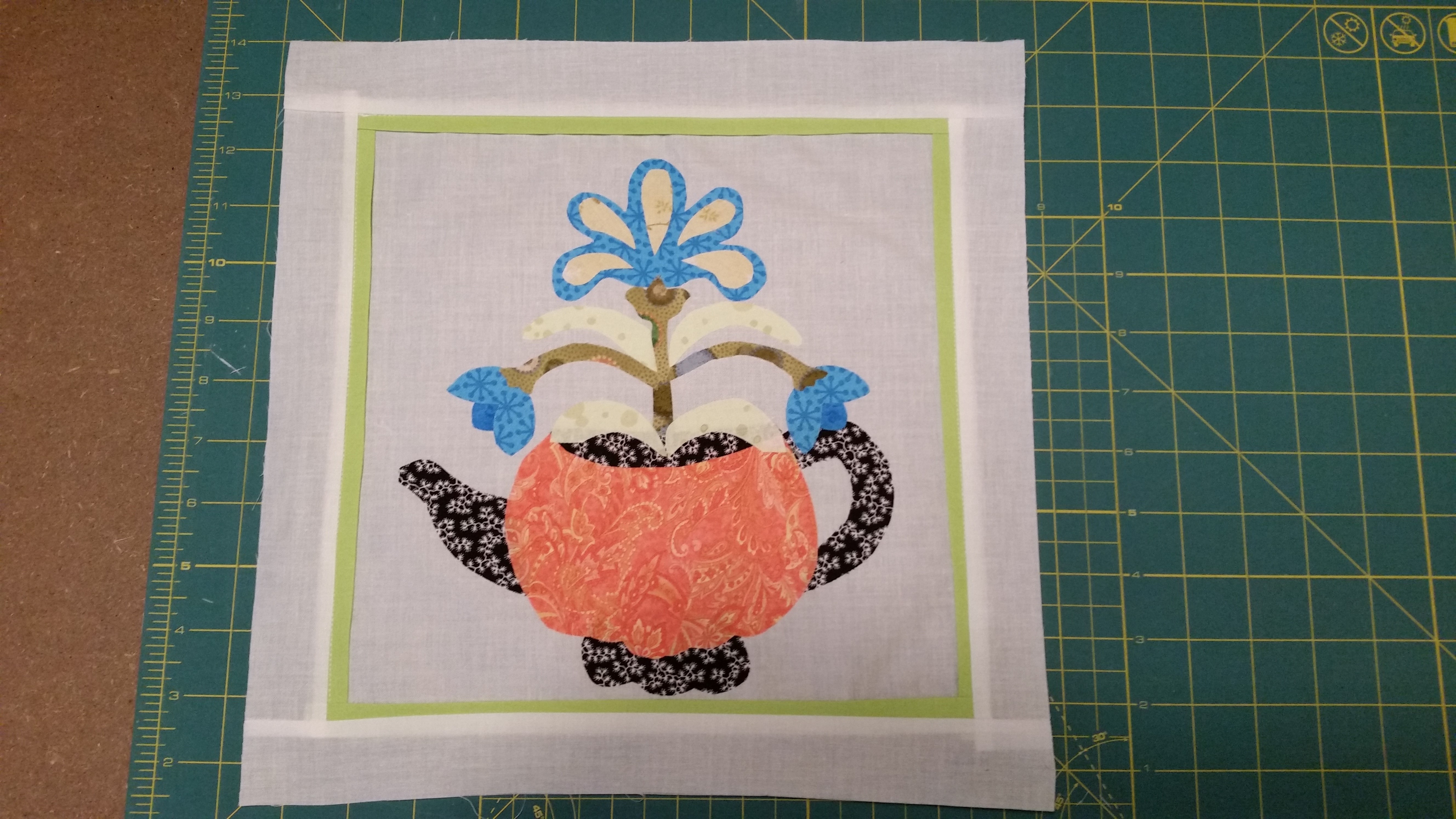 This block is called Tea for Tulips on pate 35. It is all applique for the center and I was able to complete it without any big problems which is a big deal for me because applique is not my strong suit. It is really a cute block.