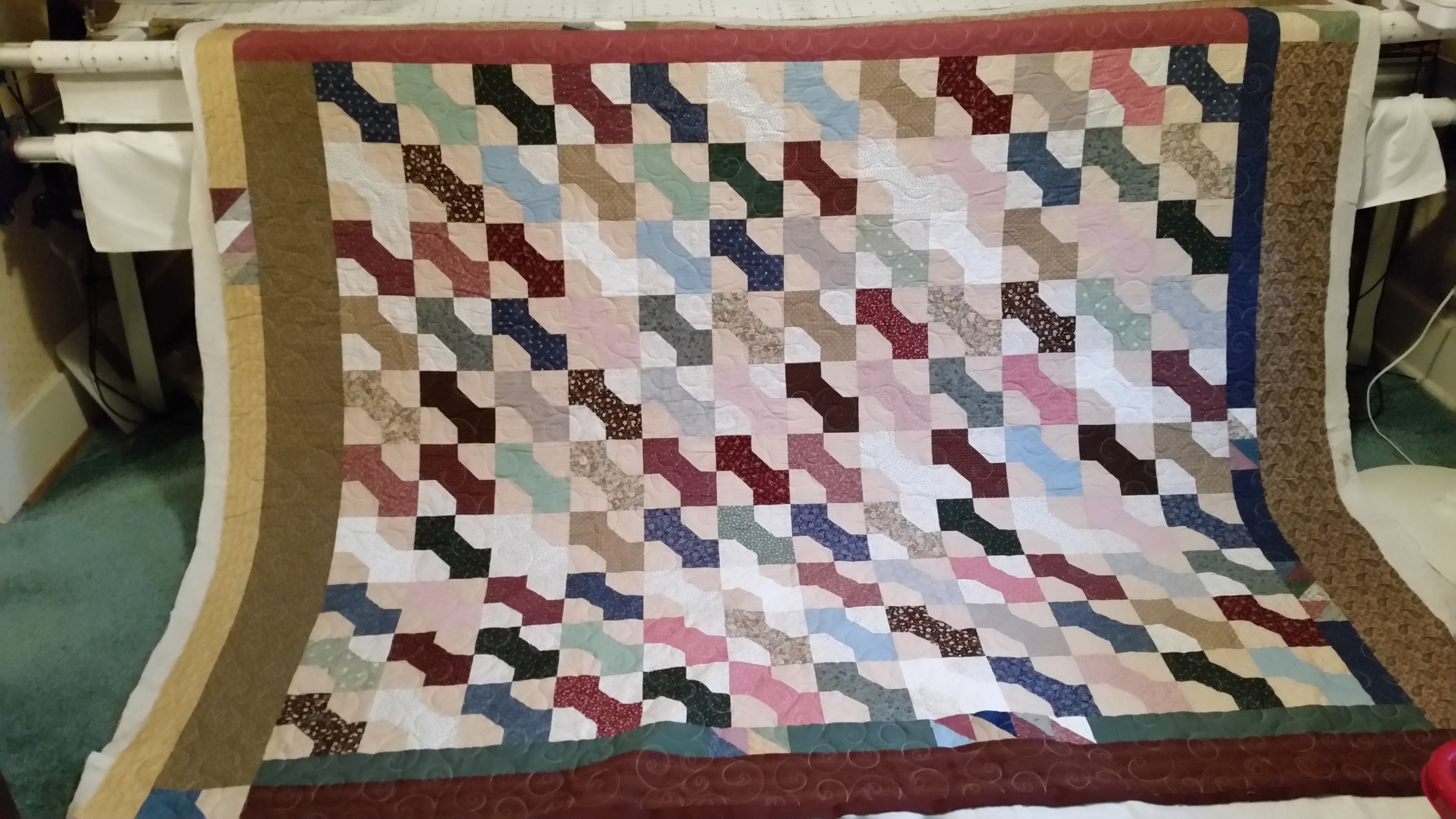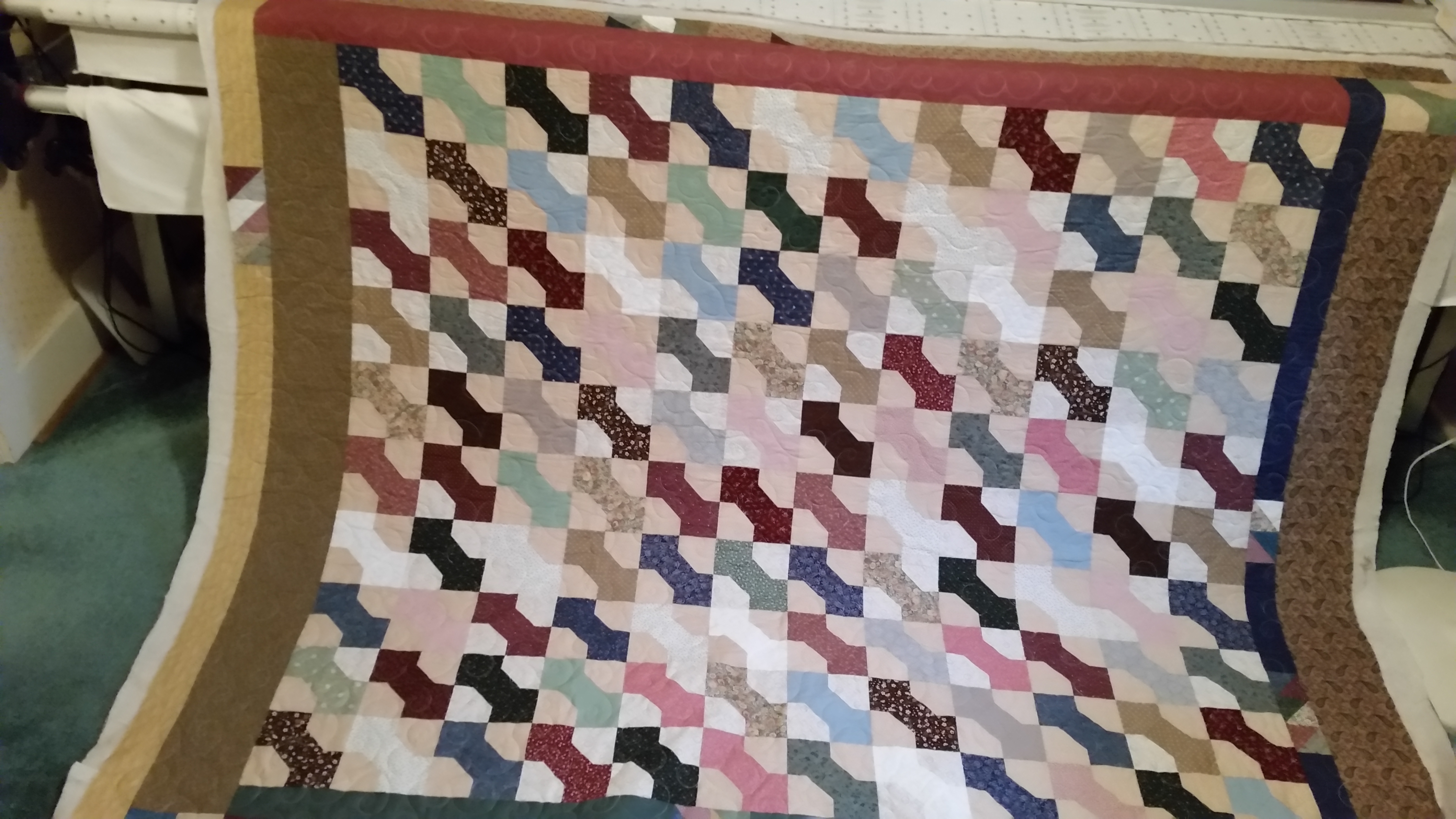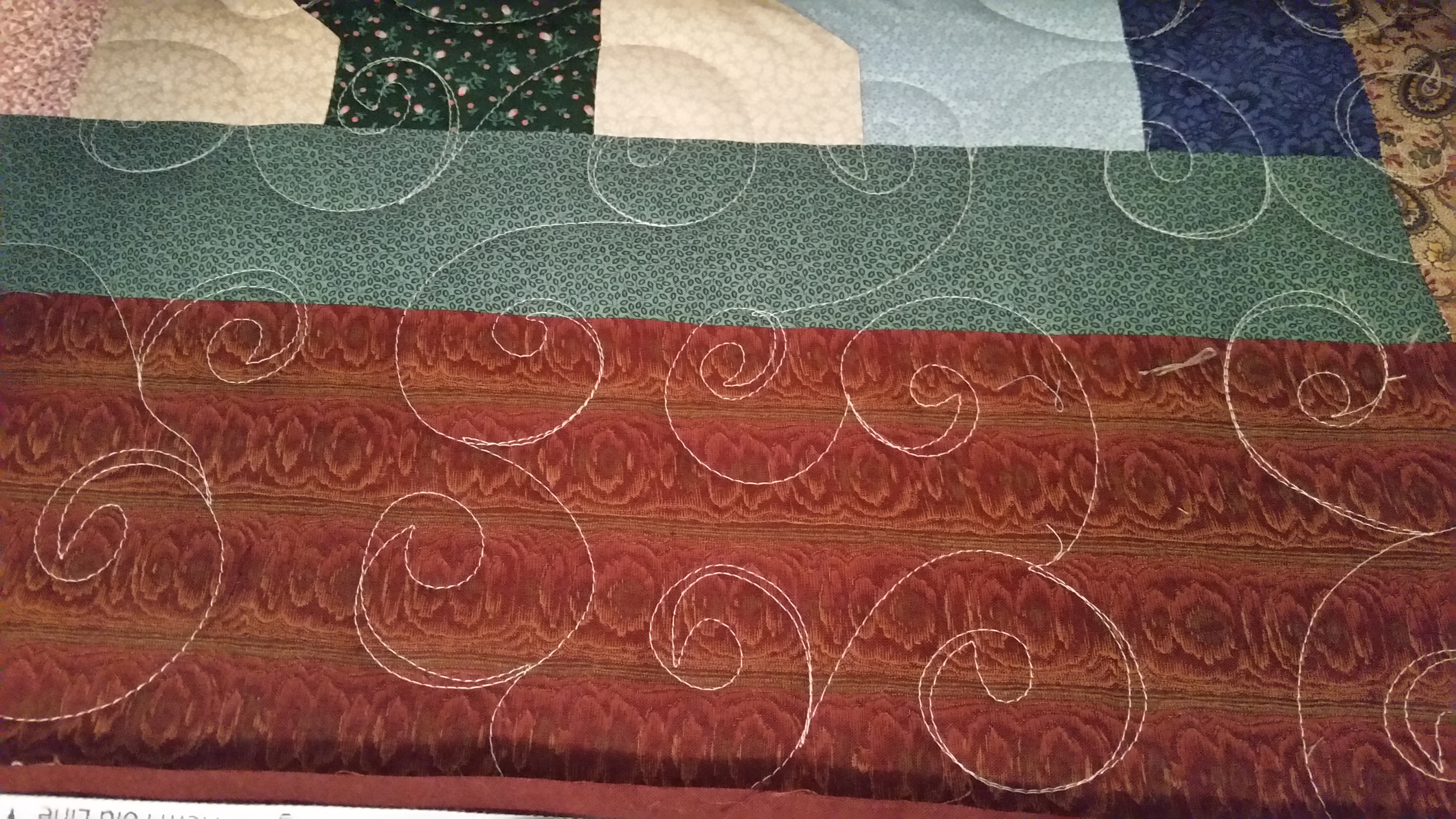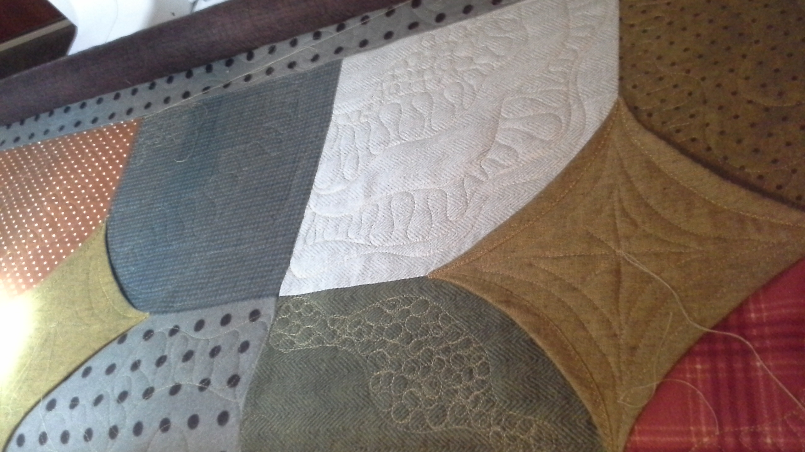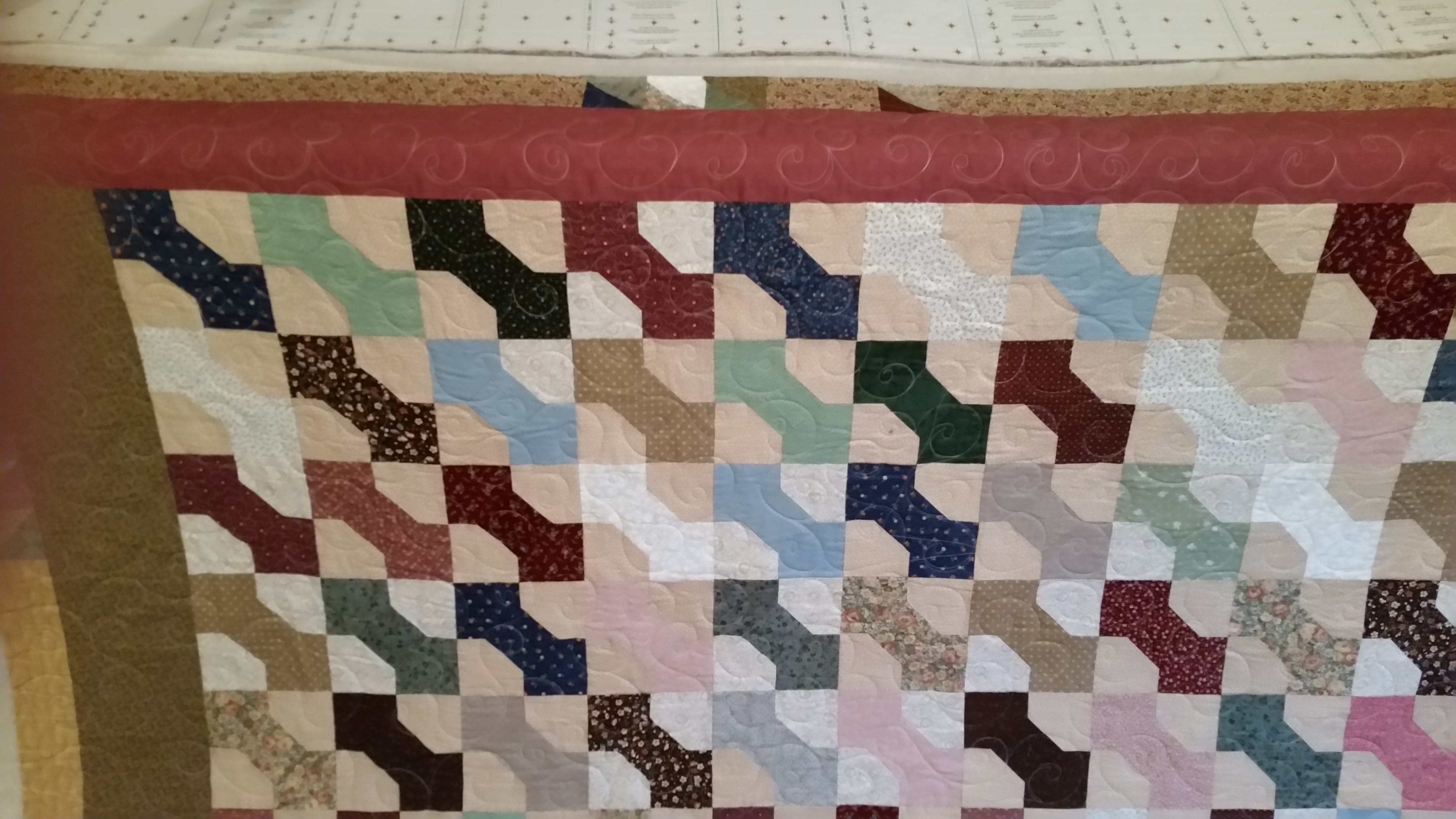 Amy made this bowtie quilt. It is all hand pieced and has some pieces surprises in the border. I quilted an all over curl design on this in a light color. I use Sew Fine by Superior in color 402. I love how soft this is. It has a Hobbs 80/20 batting in it. Very snuggly! Wonderful job Amy, you have inspired me to get a hand work project going now that I am nearing the end of my knit project.