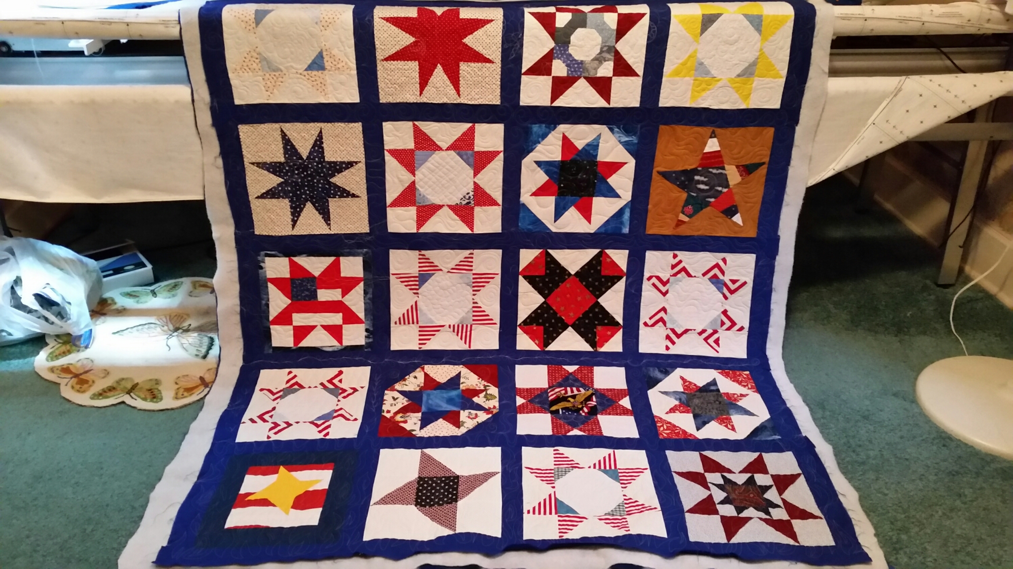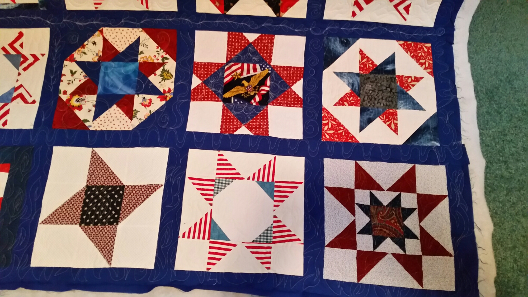 And I helped present a Quilt of Valor to a veteran on Sunday. He was so thrilled and a big thanks to the 20 pair of hands that made the blocks. Here are a few close up pictures of the quilt.