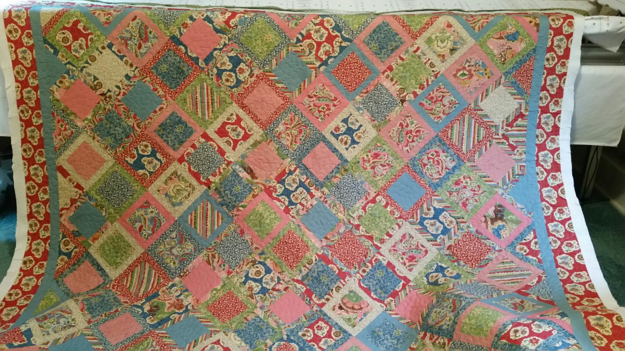 July 26, 2015July 26, 2015 mycreativecorner3-Vicki H. Another quilt finished Allison pieced this beauty and asked i quilt it for her. I love this moda fabric and decided an all over feather would compliment the florals and curls in the fabrics. I really love this quilt and its on point! Well done, Allison its perfect! Vicki Share this: Share on X (Opens in new window) X Share on Facebook (Opens in new window) Facebook Email a link to a friend (Opens in new window) Email Share on Pinterest (Opens in new window) Pinterest Like Loading...