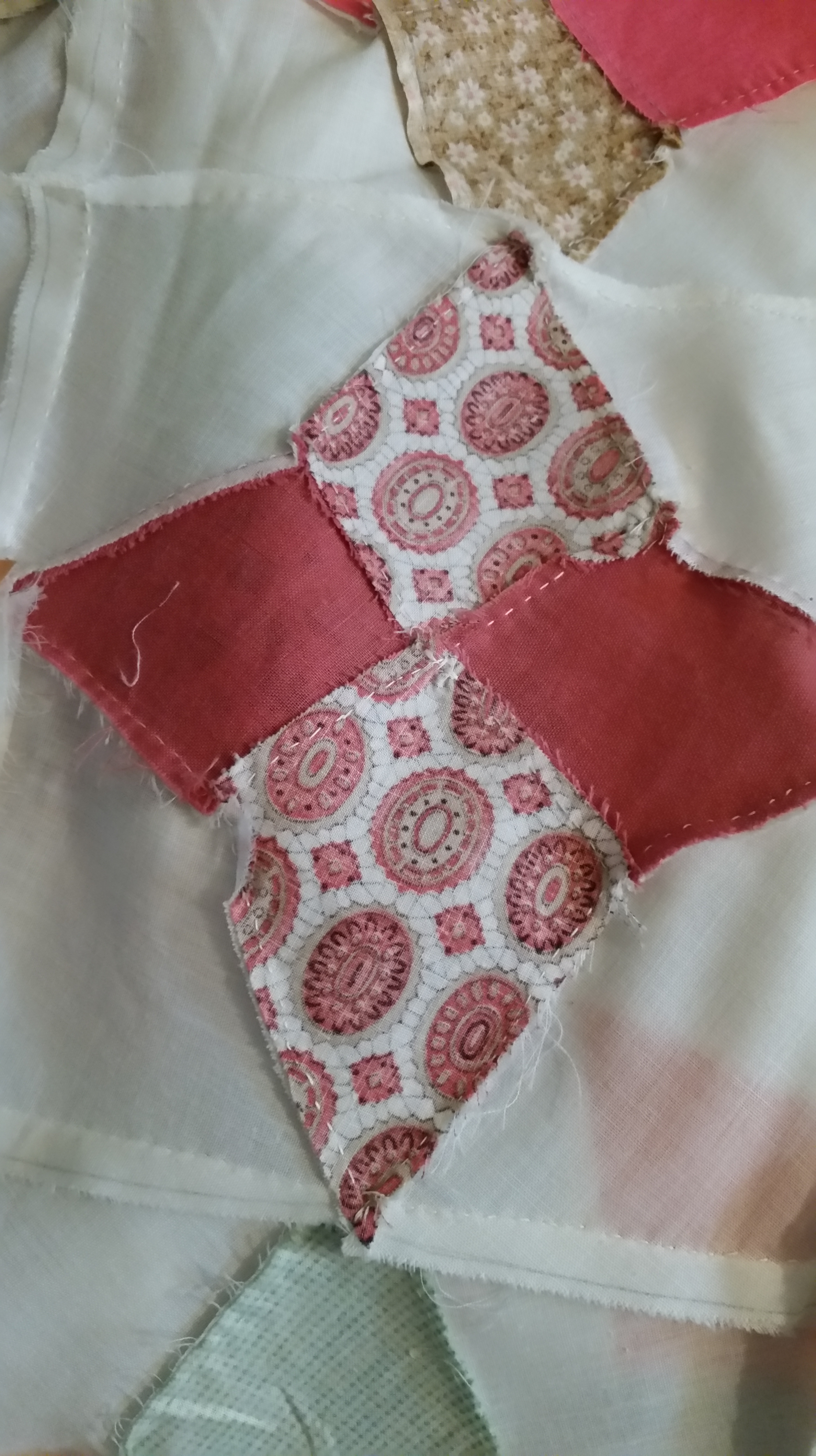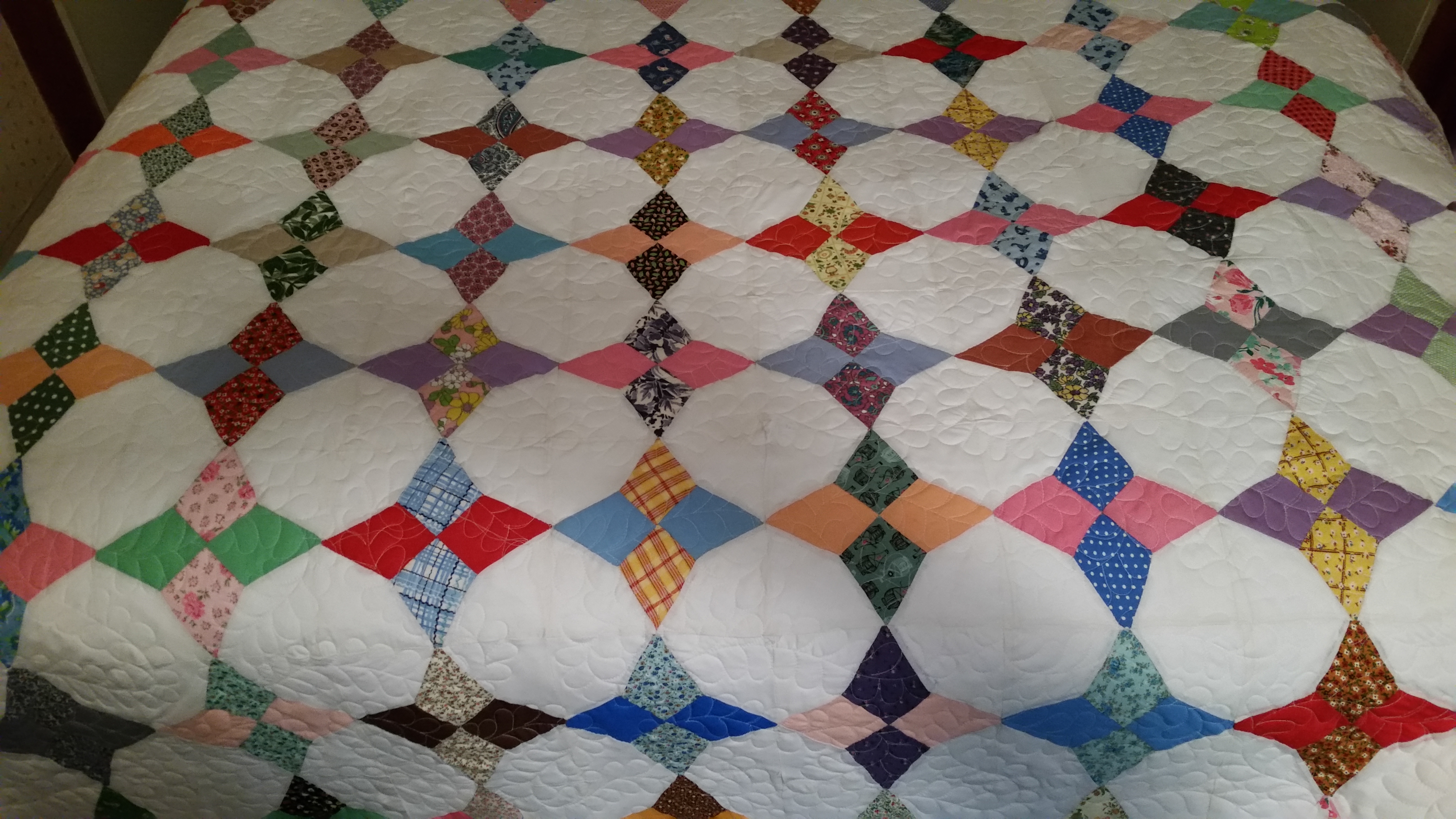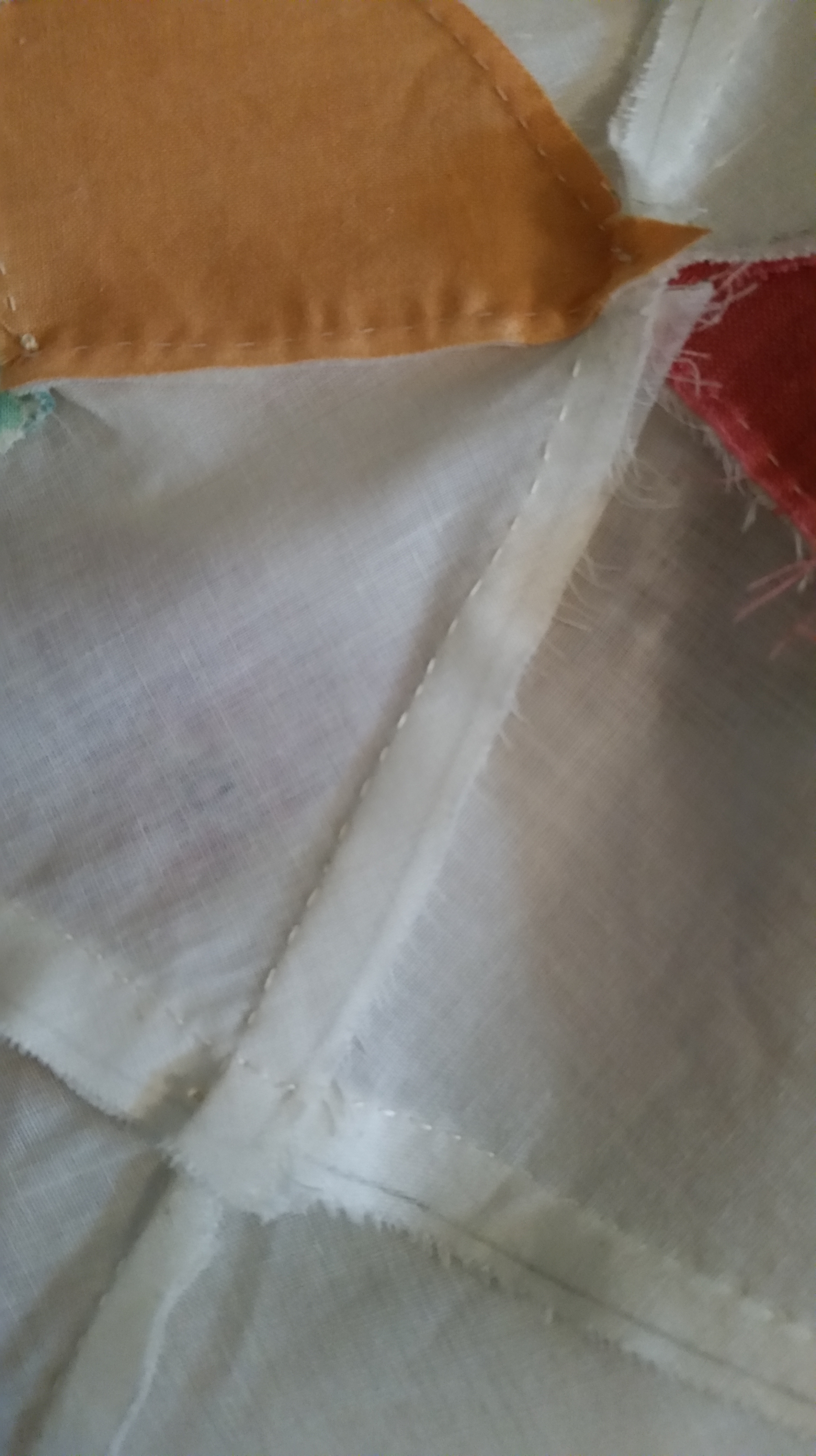 AND it is in really good shape. I had my doubts that it could hold up under the stress of a long arm but it did for the most part. Some of the seams popped open. There are some areas that did not lie totally flat. But with the overall feather that was free motion quilted on it, I think it looks great. I am not sure many antique tops could be finished and some just shouldn’t be. I am loving the colors of this quilt and NO BORDERS! love that look. This quilt is very old could be any age but some of the fabrics are very 60’s, others are more from the 70s and 80’s. Hand sewn!