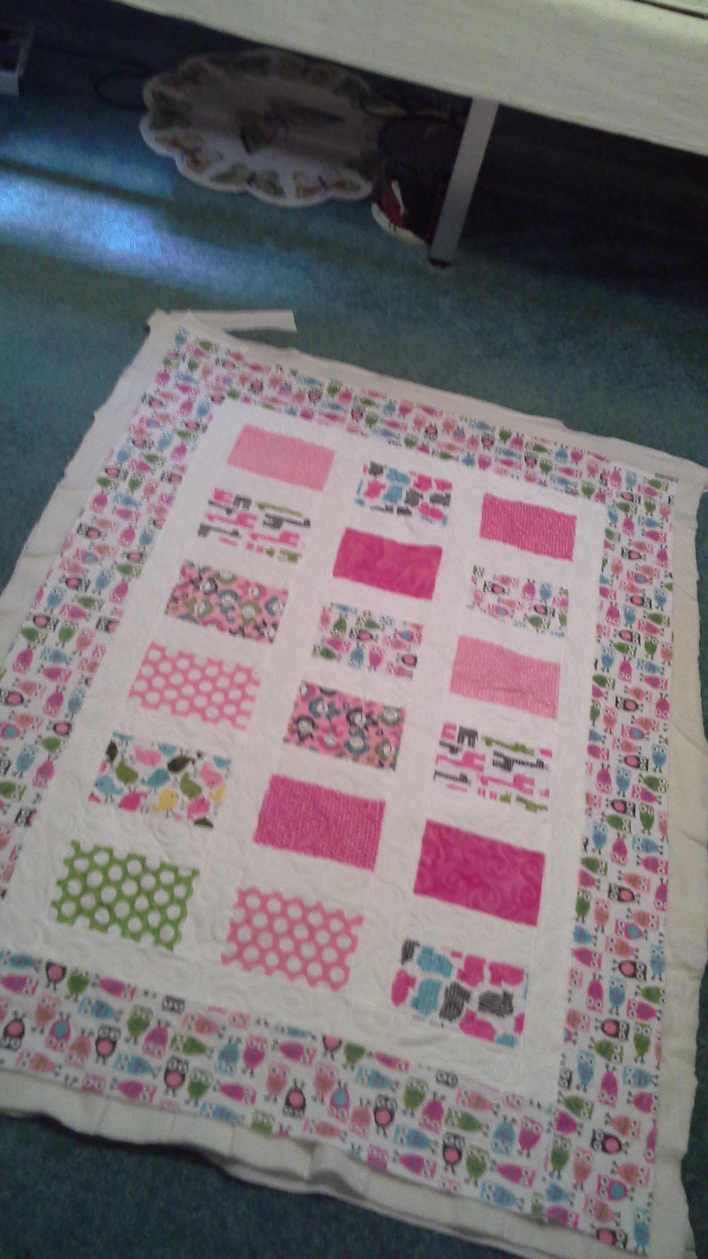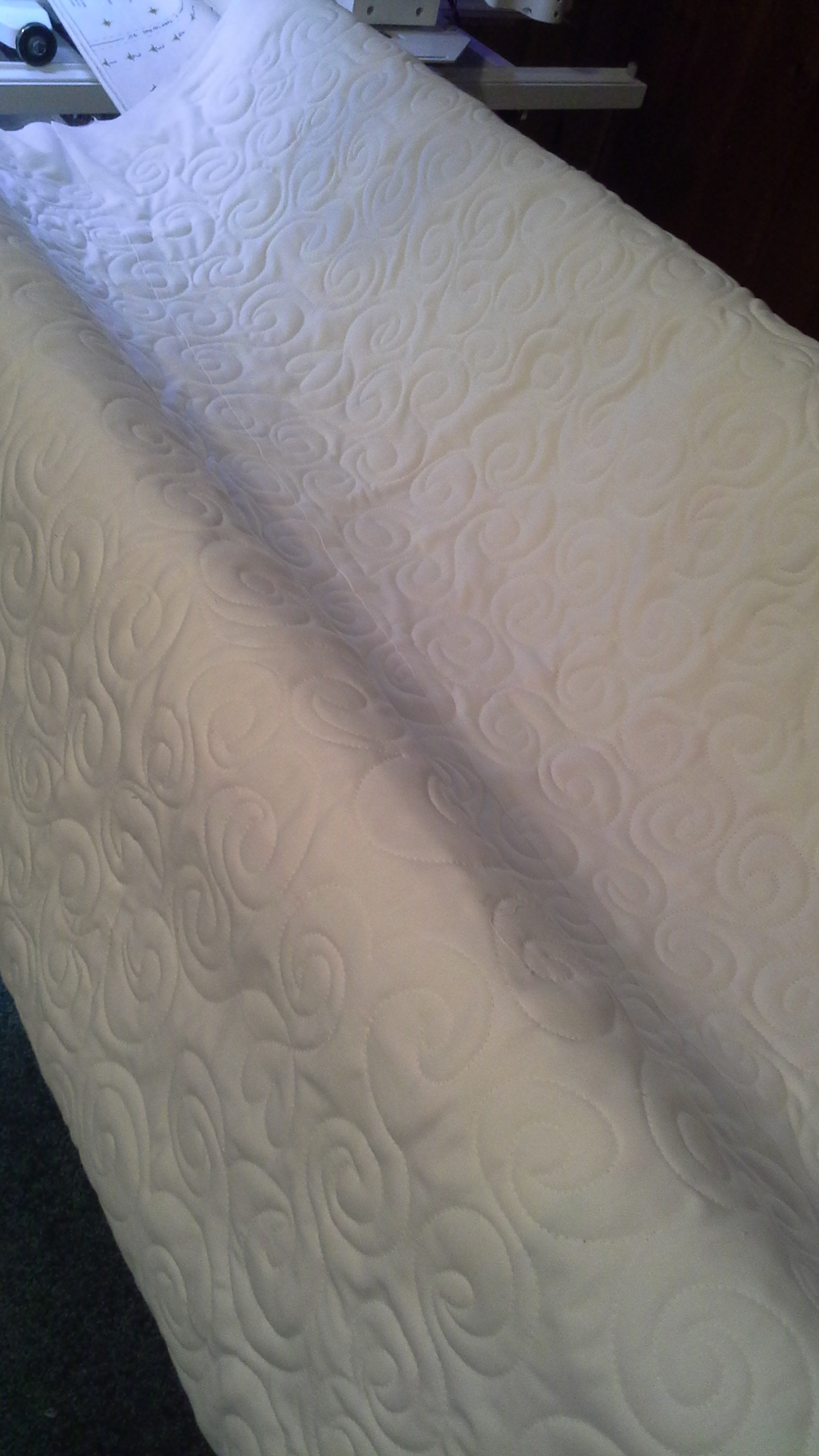 Here is the quilt made from cuddle fabric from Robert Kaufman. It is really soft , fuzzy and we call it Minky around here. I had no idea when my coworker ordered this kit it wasn’t 100 percent cotton. I followed all the directions to the last dotted i. I ironed on fusible interfacing on each seam. I borrowed a walking foot. And the columns line up, I also long arm quilted it. There is a solid white background with a Hobbs 80/20 batting in it. I quilted all over swirls. Now to watch the tutorial on binding with minky. I am so relieved that this turned out so well.