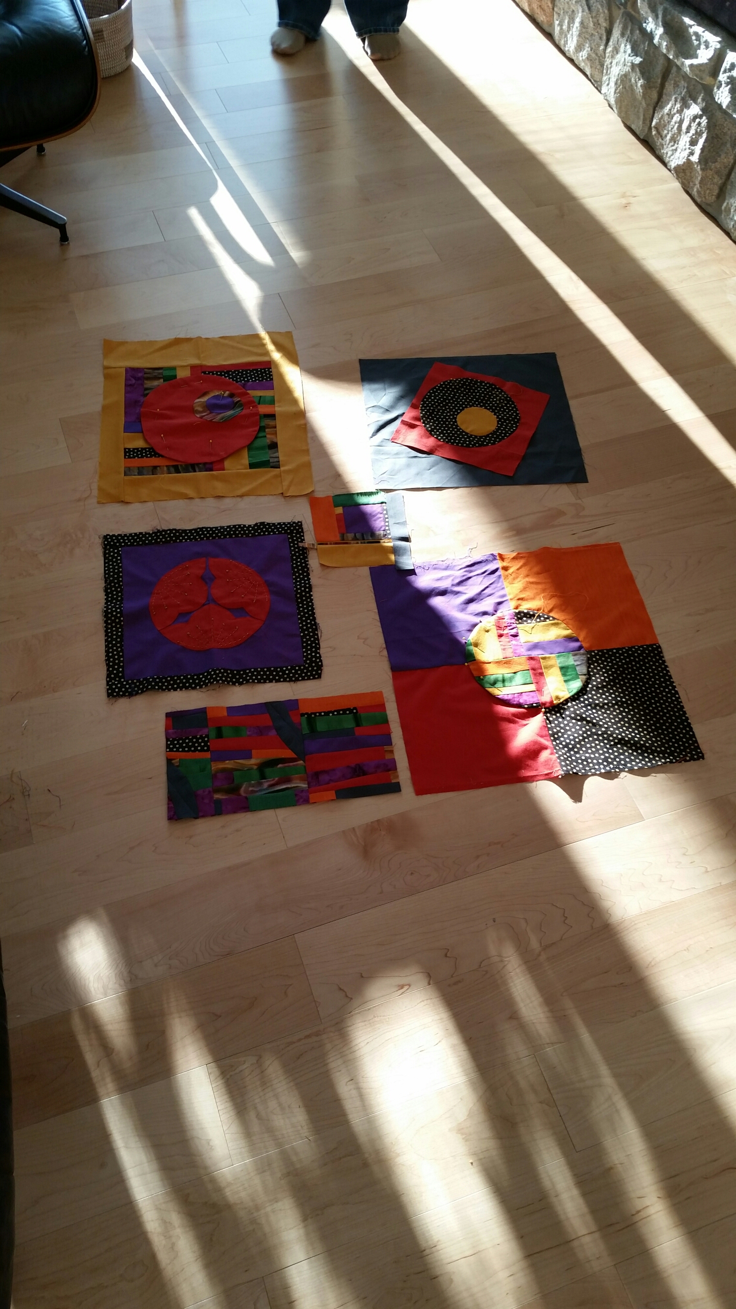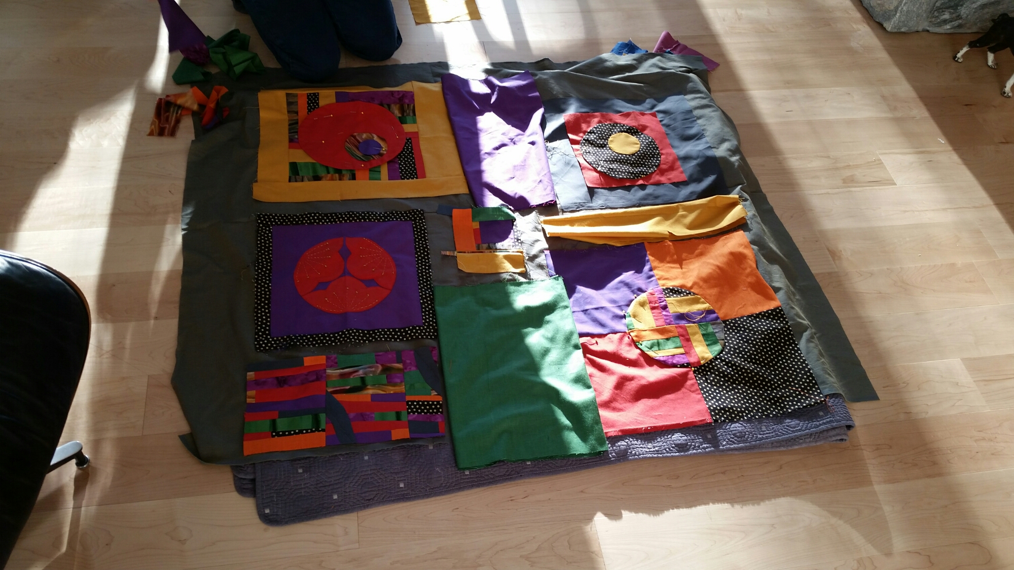 We spent about 7 hours and the last person took the components home and was making setting pieces as in the picture. I made the strippy improv section on the bottom left. The inspiration block is above mine. The whole quilt was pieced improv…no patterns. We had to intuituvely make something using what was left in the fabrics. I think my blocks curved pices dont show up much and needs an applique circle, i am not 100 percent happy with mine. But I could work on my section for a whole day on its own.
