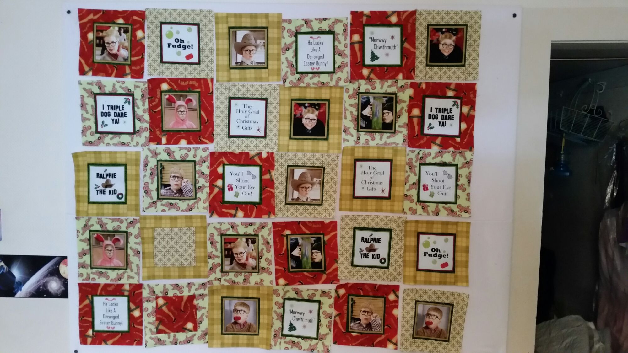 I don’t have my fall items picked up yet. They will be today. The tree wont be up for a couple of weeks,but we started watching Christmas specials and I started thei A Chrstmas story quilt last weekend. I Love it. Its nothing fancy but boy is the fabric cute, just like the movie. I may shuffle the blocks a bit more or add a couple of more if I have enough fabric but this is nearly ready to go on the frame.