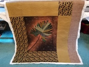 I just delivered this leaf quilt to Holly. She dyed the leaf background fabrics herself. I was able to quilt veins in the leaf. The rest of the quilt was given lots of texture that reminded me of water and the rain forest. Click on the pictures to see the details.