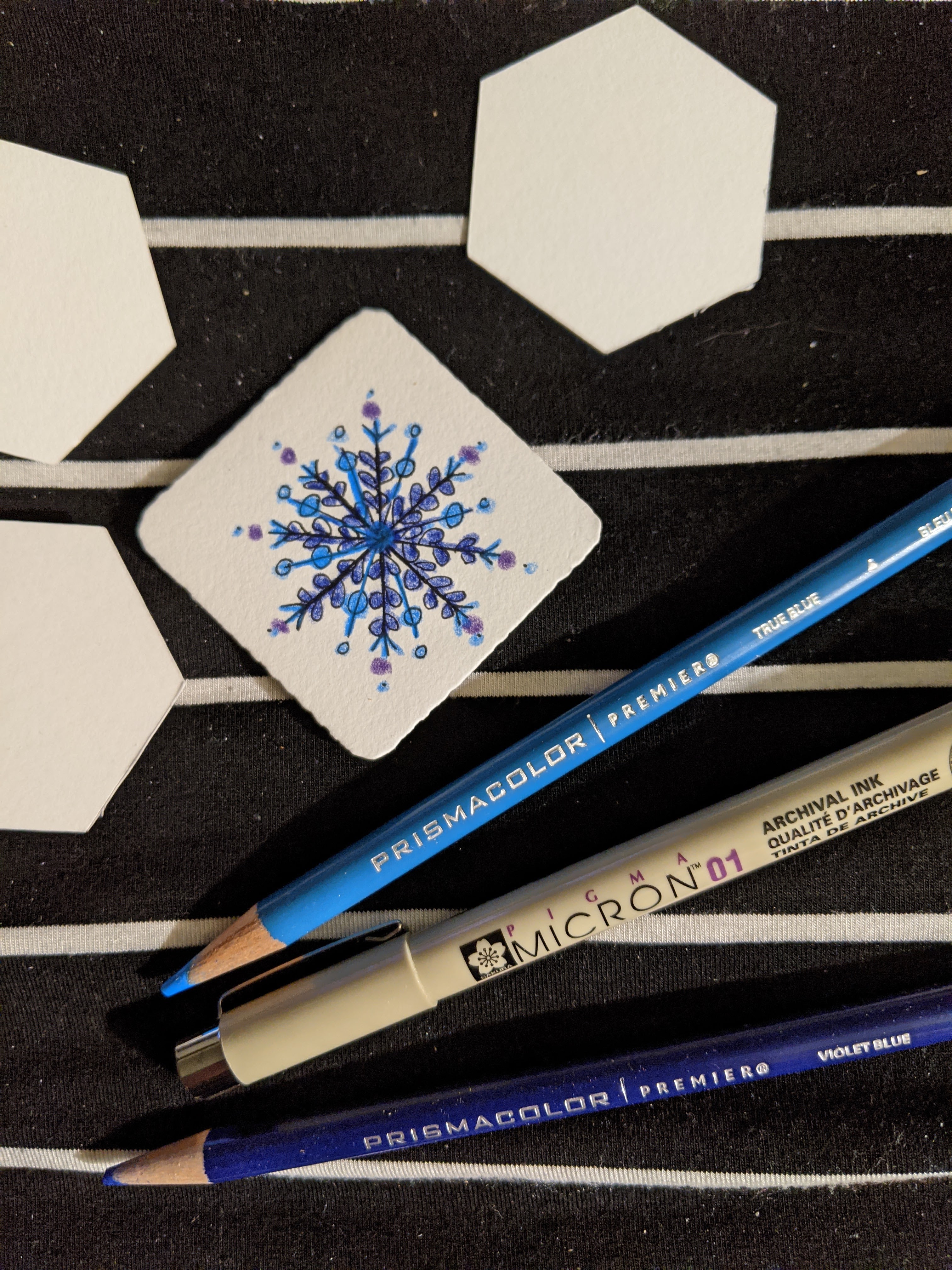 I have taken a couple of classes on Zoom this week that were hosted by Michael’s craft store. They are some of the best craft classes I have ever taken and the cure for 2021 problems. I watched an acrylic paint class on making a winter scene with pinecones earlier in the week. Yesterday was a watercolor class for making snowflakes. I was inspired by the class to try to make a snowflake with pen and colored pencils, Zentangle style. I feel I need more practice before I get any paint out. However, I am getting the paints out this weekend and trying both. I have a long weekend off from work and I plan to fill it with some fun activities. I need fun, not all chores and news.