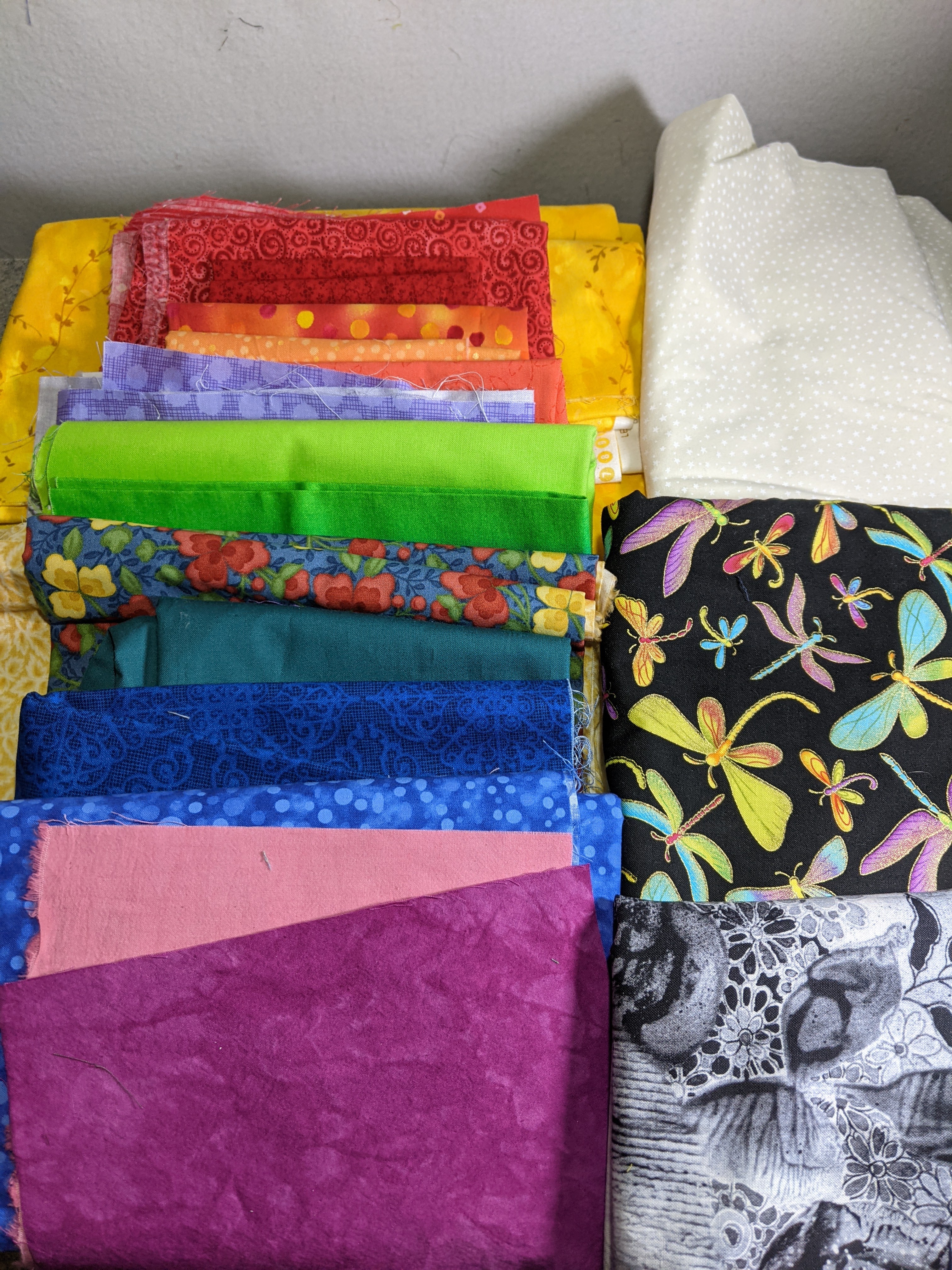 I have been totally inspired by Diane of Stash bandit’s quilting to make a scrap quilt. She is a lovely teacher and I have been fortunate to take a class from her in the past. In addition, I have been scouring the internet to learn ton’s more about scraps quilts! One of the tips suggested was to take a photo in color and then black and white to look at the Values of the colors in your pull. Comparing the photos and then allowing myself to see the fabrics in different light in my craft room has given me time to see the two fabrics that are now pulled out of this Irish Chain project. The light pink and the grey fabrics don’t go for me and the intentions of this quilt. I added a few multi colored fabrics at the suggestion of more experienced people in My Creative Corner3’s Facebook group and I am looking for a few more in this stash. Since I inherited this stash I really don’t know each fabric intimately like I would if I bought each fabric myself like I did for my personal stash. Its going to be a super fun quilt to make. It is also an easy quilt which I need at this moment. Simple task that has brought me joy.