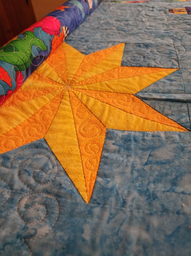 I am happy that I got the binding on my bats and boos quilt. The hand stitching is halfway done.I loaded a quilt on the long arm and did a row this week. I worked on my fall cross stitch freebie. I sewed Sewcialites2 first block. It is all a like learning to read patterns all over again. I am finding reading is still hard for me. I got a little befuddled with reading patterns and trying to figure out what I was supposed to do. I just had to go very slow and ripped a few stitches out both in the sewing and cross stitching, but I am very pleased with the progress I have made. I plan to work on the next block in the quilt along. I feel that all of this crafting is getting my brain back in working order, it’s my long Covid rehab!