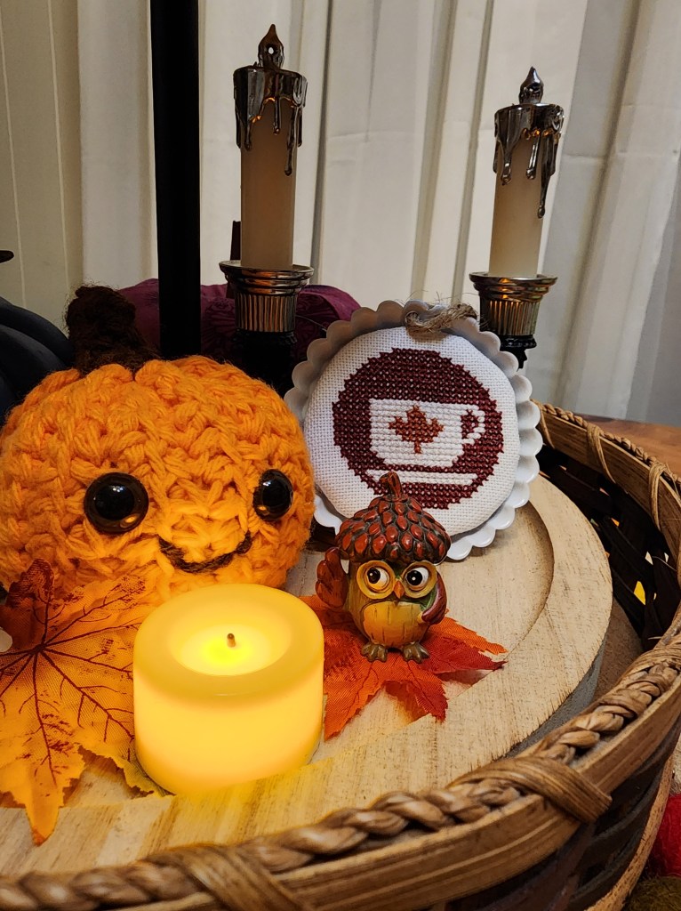 Here is my tier tray with the other ornaments I have finished. There will be 6 of the 12 in tart tins from the Autumn Days Ornaments Pattern at Fat Quarter Shop.