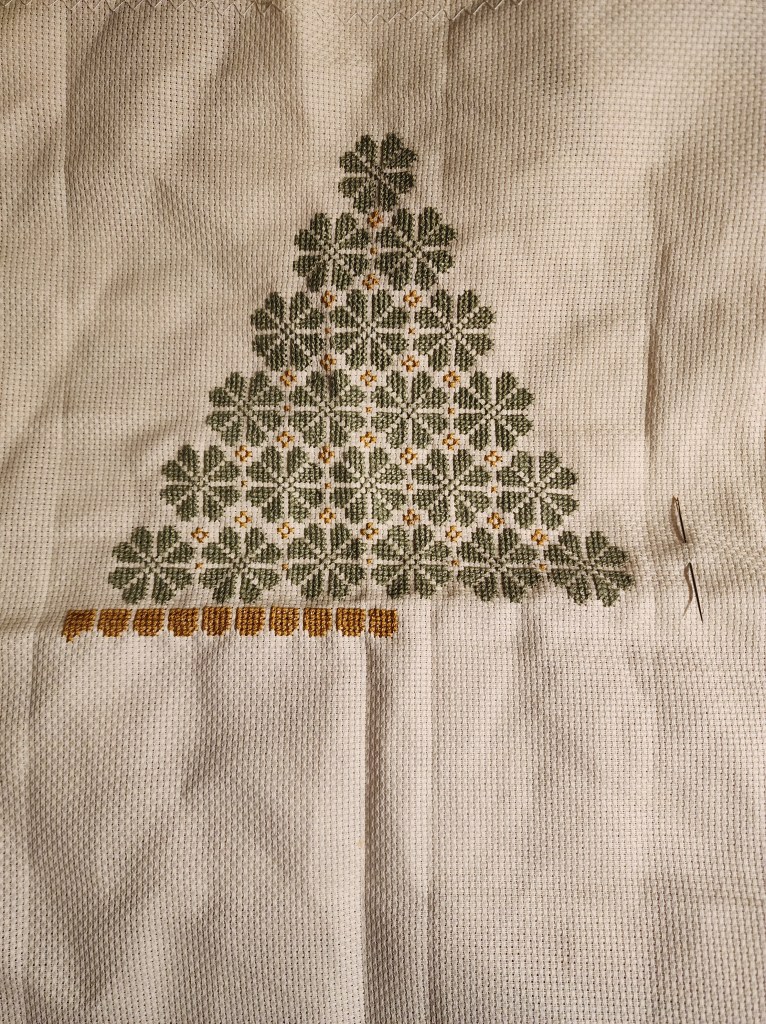I am working hard at getting off my phone after work. I have been knitting my Elementary wrap and stitching my Merry Christmas Wishes cross stitch. I am having to scale back the borders and lettering in the original pattern because I cut the fabric small and because I wasn’t sold on the border any way. I am working on the gold cake stand the tree sits on.