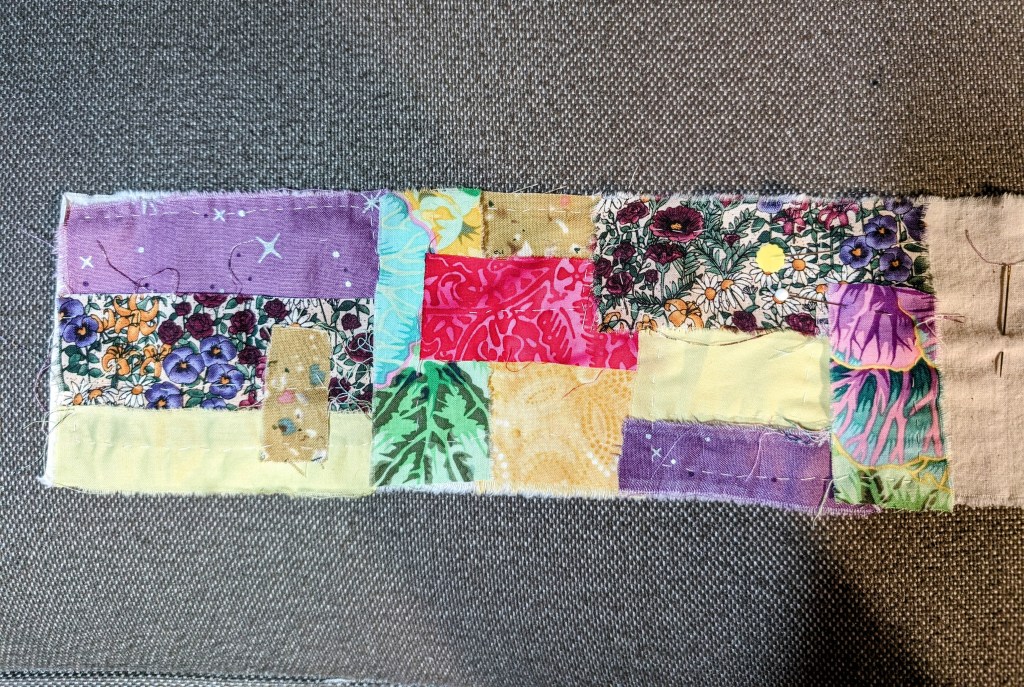 I love this whole project the meditation scrolls and the rice bag that is shown. I am starting out with the scrolls. I am basting my bits of fabric to a muslin strip right now and then I will go back and add the embellishments. It is really a meditation to make these, and mindfulness is a practice that I engage in to keep myself in the moment to cope with this mad world. I love some of the long videos to watch K3n chat and stitch , like a coffee or tea with a friend while you stitch. Here is my progress so far:
