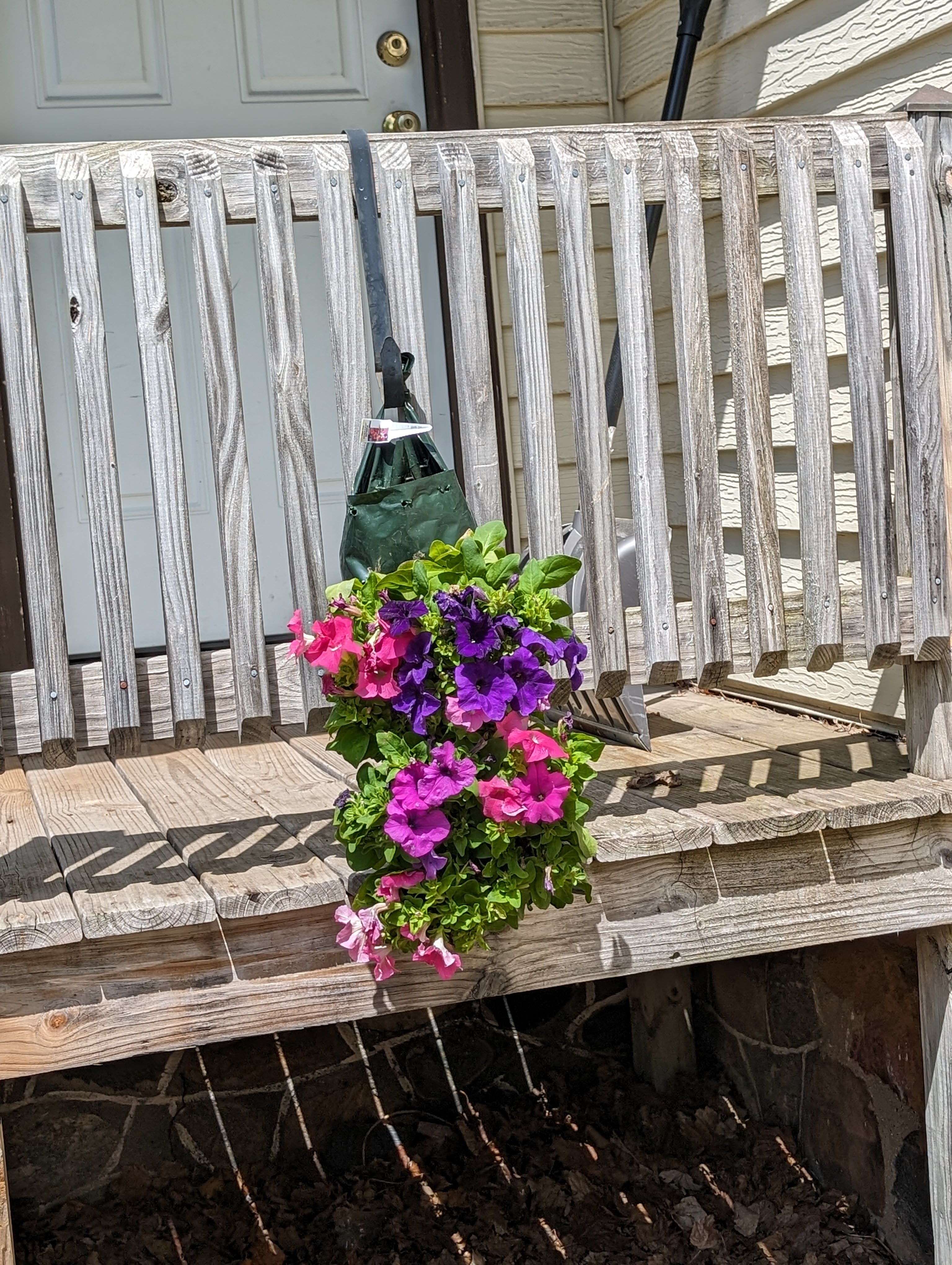 I did make one purchase at the garden center and that is a hanging bag of petunias to replace the Christmas wreath. It’s pretty and I purchased my first fancy bird house to sit in the fairy garden. I want to put out my gazing ball today. The solar lights are out and I have some solar fairy lights to put out once I get their spaces cleared out.