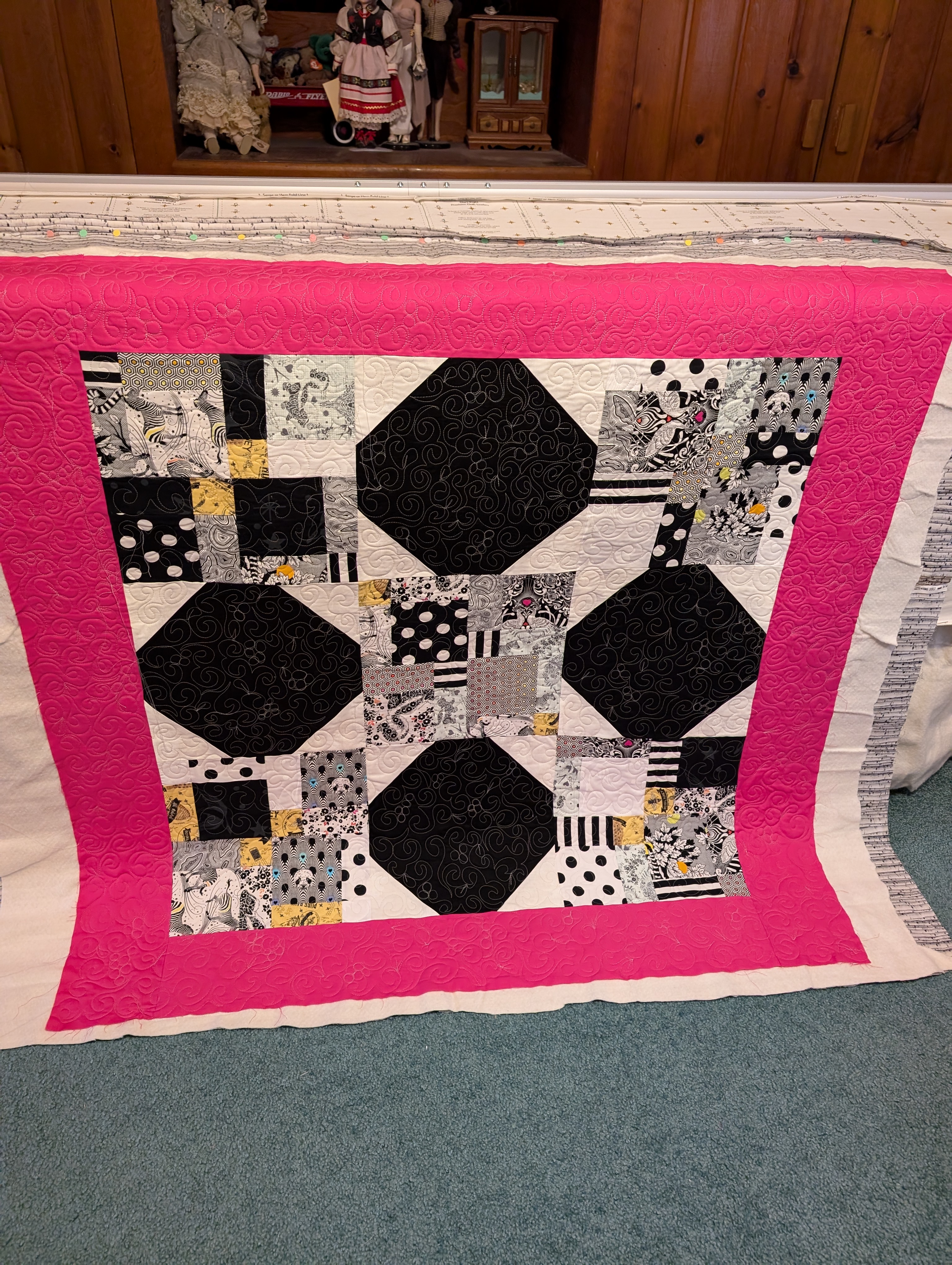 I have a stash of black and white fabrics that I think would look great for this quilt. It will be really fun to long arm. I highly recommend this as a stash buster, charity quilt, kids quilt or a novice quilters first quilt. You can also use up large scale prints. I have seen people make this from small strips and make blocks out of it but so many seams!