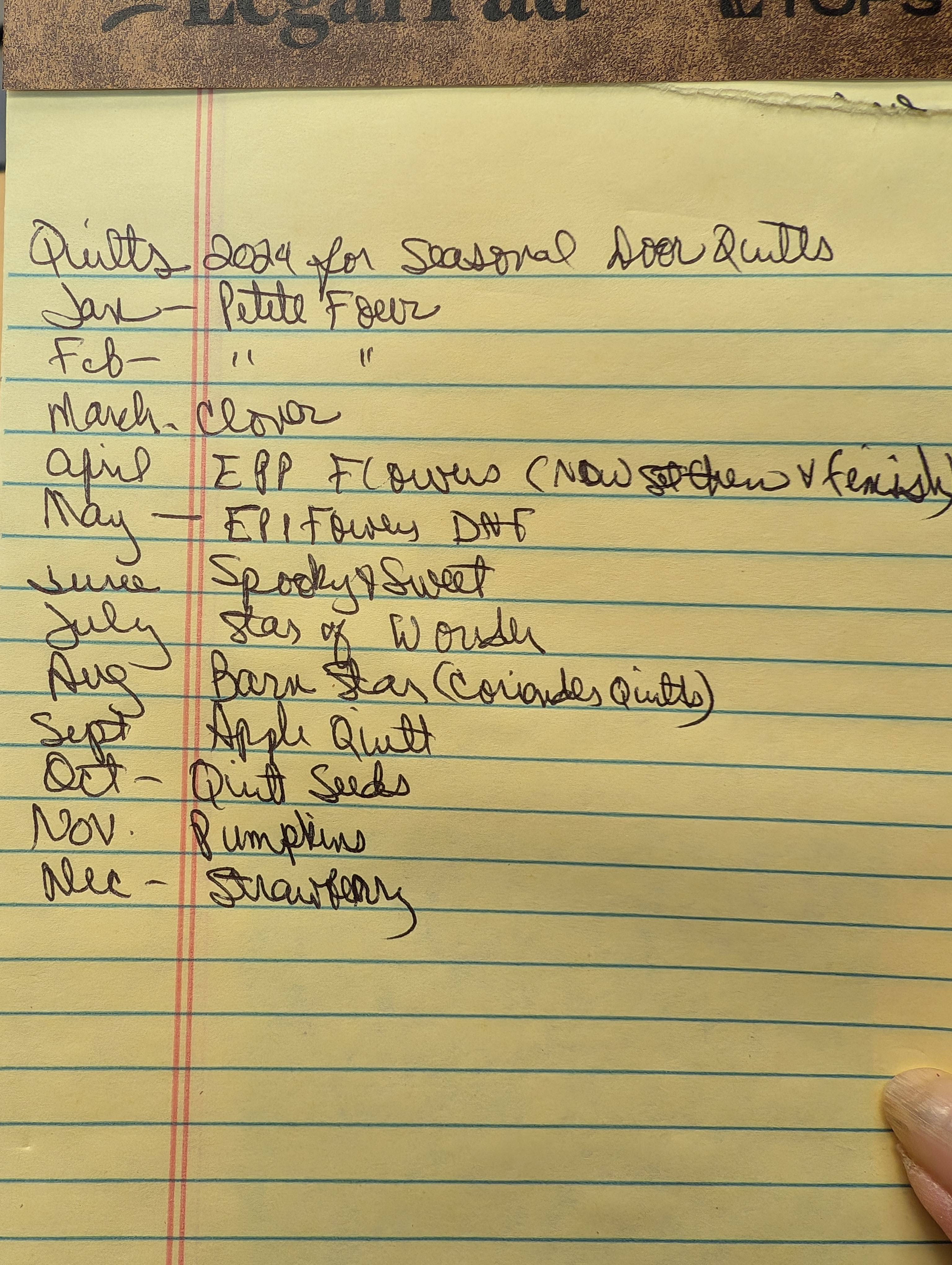 I did sit down and write my plan for sewing the seasonal door quilts for this year. I have the EPP quilt to finish from the spring but I am on schedule for the quilts that I had planned. I did take a little detour right off the bat at the beginning of the year but that’s ok. These lists are just some ideas on what my intentions are when making the quilts to hang at work. I could be inspired to make a different quilt than what I have on the list.