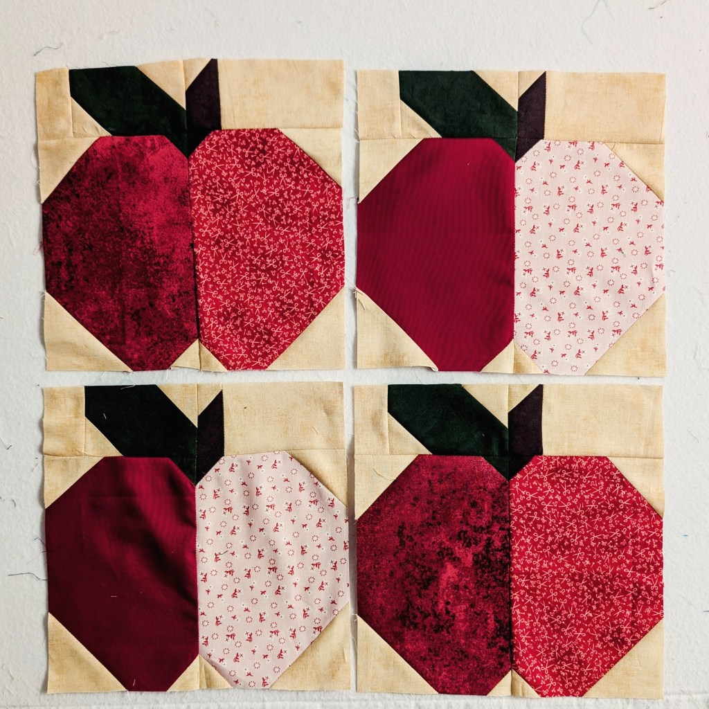 This week I started my Lori Holt apple Quilt. It’s from the book Happiness is Scrappiness. Easy piecing and I am using up my scraps!