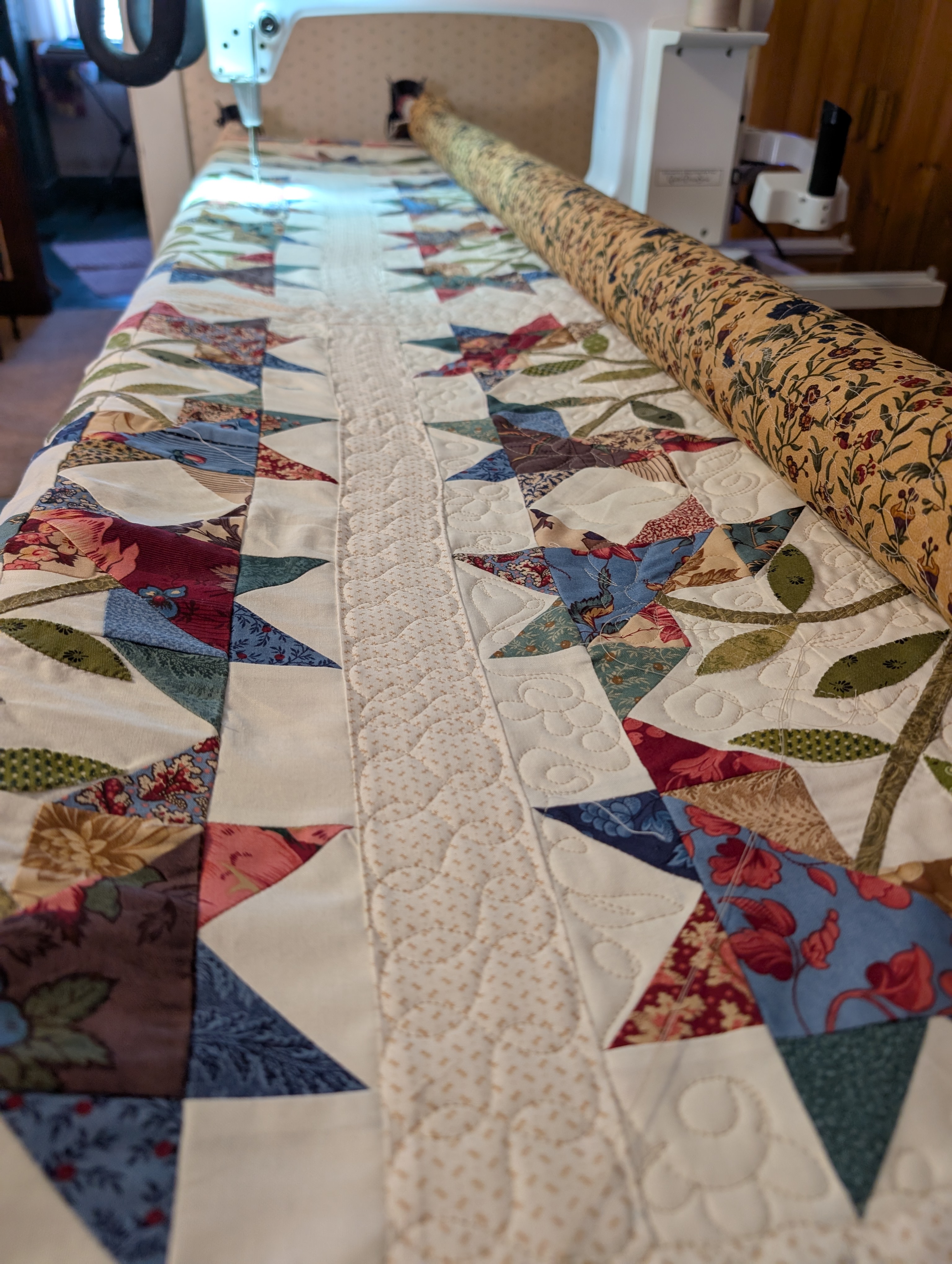 I also long armed a little and I can see the end of this last customer quilt rolling up! It has been a long process custom quilting this beautiful quilt but I will be very happy to start quilting my own quilt tops this summer. I have enjoyed having more relaxing time for my non working hours vs filling it with a side hustle. I need more time to myself , my health practices and my projects.