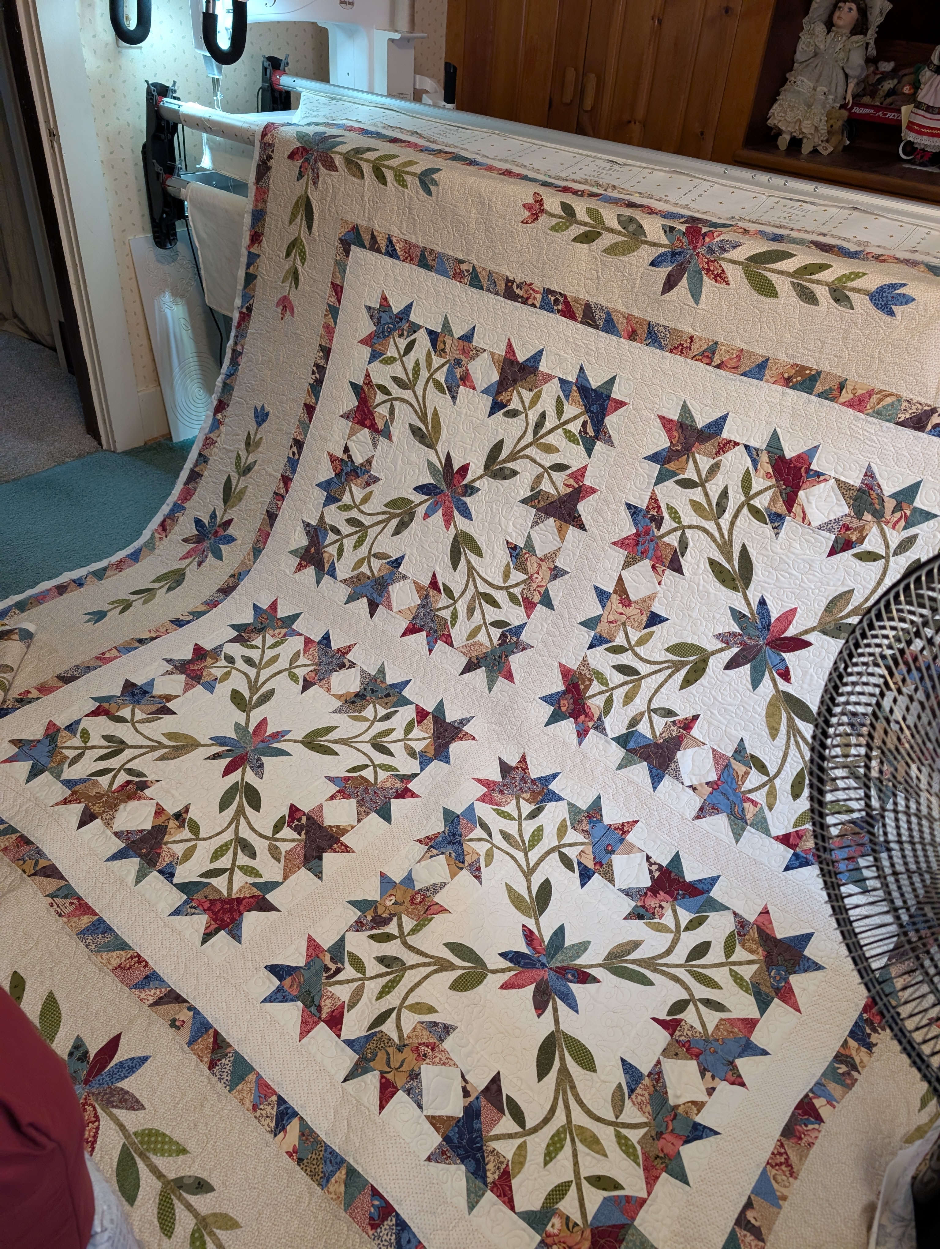 I have been stitching away on my Make a wish cross stitch. I finished the queen sized quilt on the long arm frame now I need to bury the loose threads, that took me months. I am going to load an art quilt collaboration with a friend this weekend. She pieced it and I am going to long arm it for a local fiber art show. I will show you when it is done.