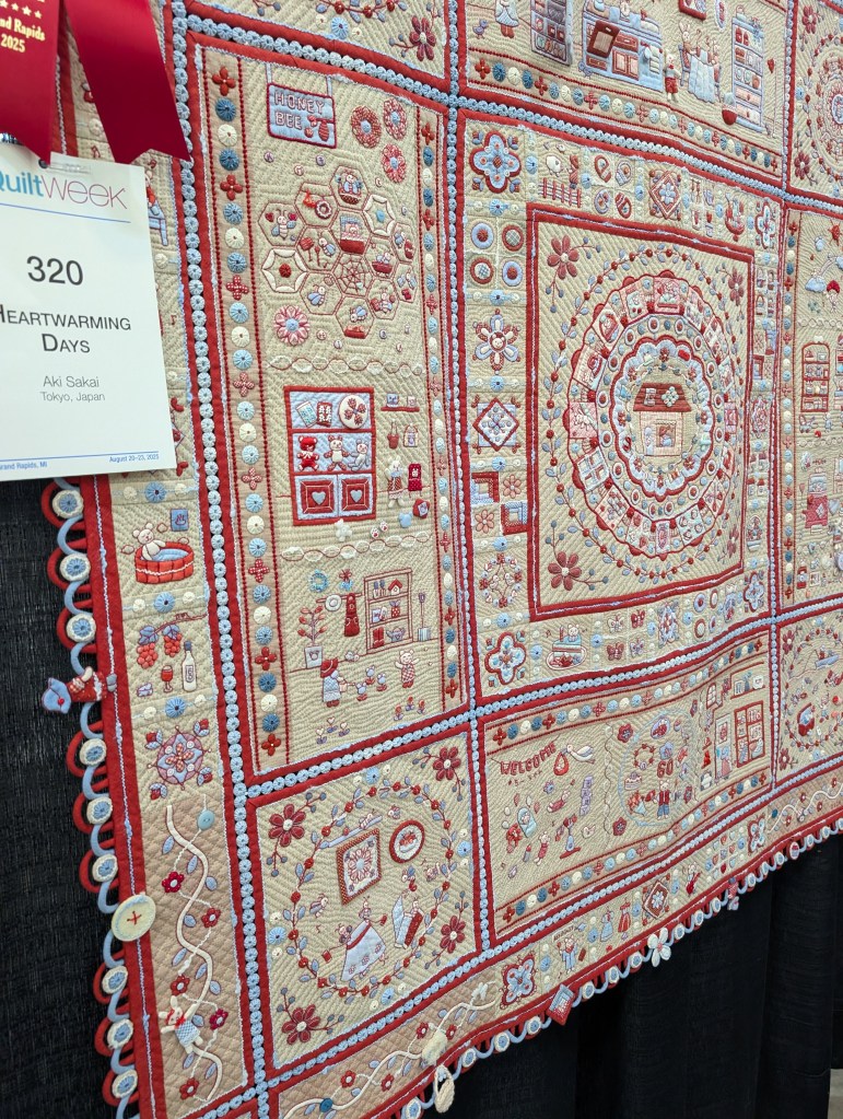 The show was wonderful. There were many quilts that were new, innovative and interesting. Not every quilt looked the same. Not every quilt had to be bedazzled even though many were, not my favorite thing honestly. Many quilts were mixed with hand stitching, crochet or lace. Some were very big, others small. More Modern quilts were in the show and more contemporay quilts, art quilts and plain amazing quilts. I enjoyed them all but several quilters from Japan entered and I loved their work so much. I loved the hand quilted quilts too.