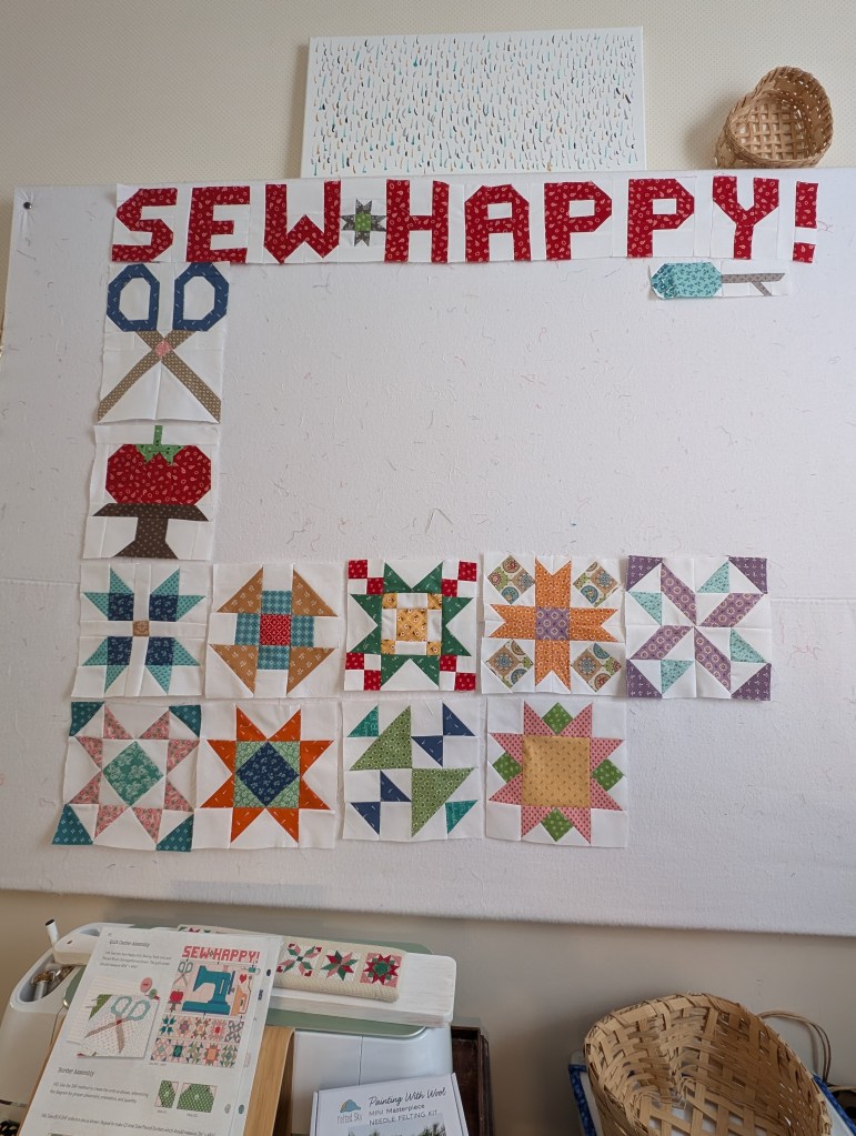 I am excited with the progress of the Sew Happy quilt pattern by Lori Holt. The cutting directions are a slog but I am down to one star, a big sewing machine and an iron element. I am starting to see the finish line and getting excited to make the focal pieces that I have saved for last. Here it is on the design wall!