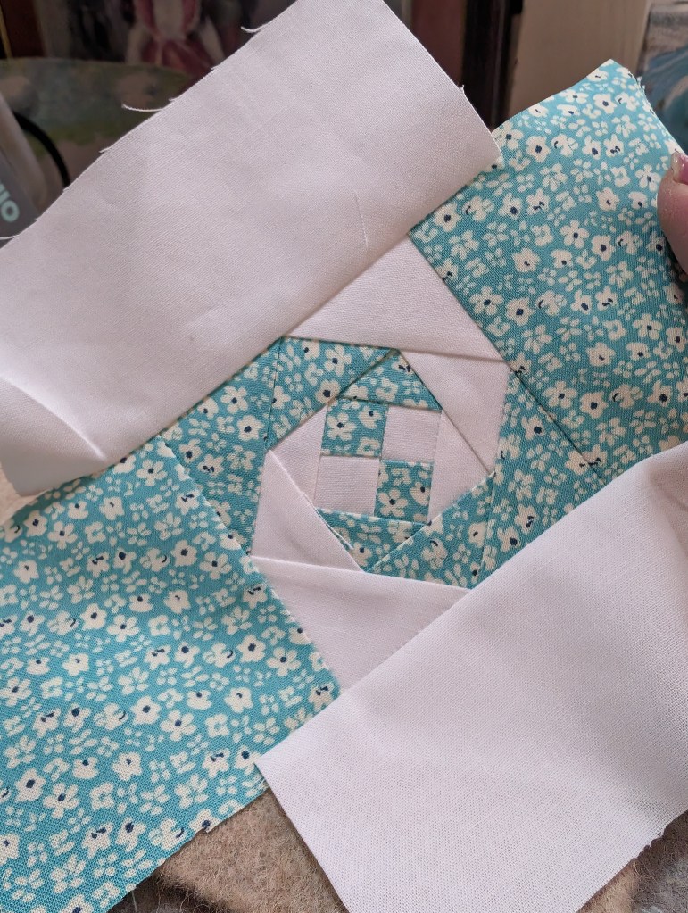 This block has a little trick that you need to know before you start. The center has a little 4 patch that needs to be traditionally pieced then centered on the paper. And follow the tiny suggestion …. Pay attention to color placement. I messed up my first block and didn’t catch until the end. Oops!